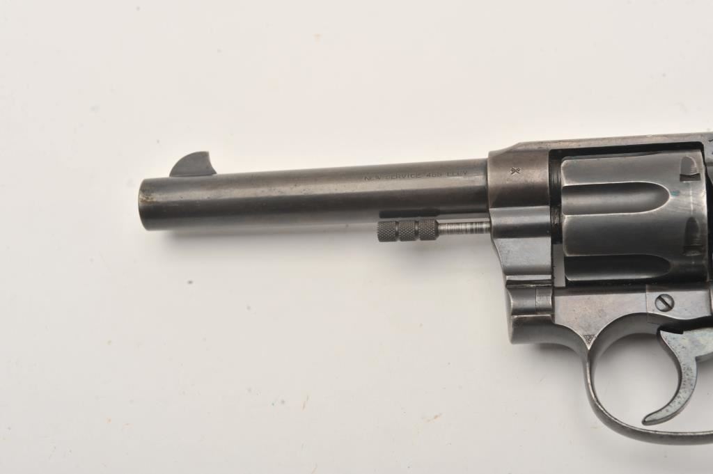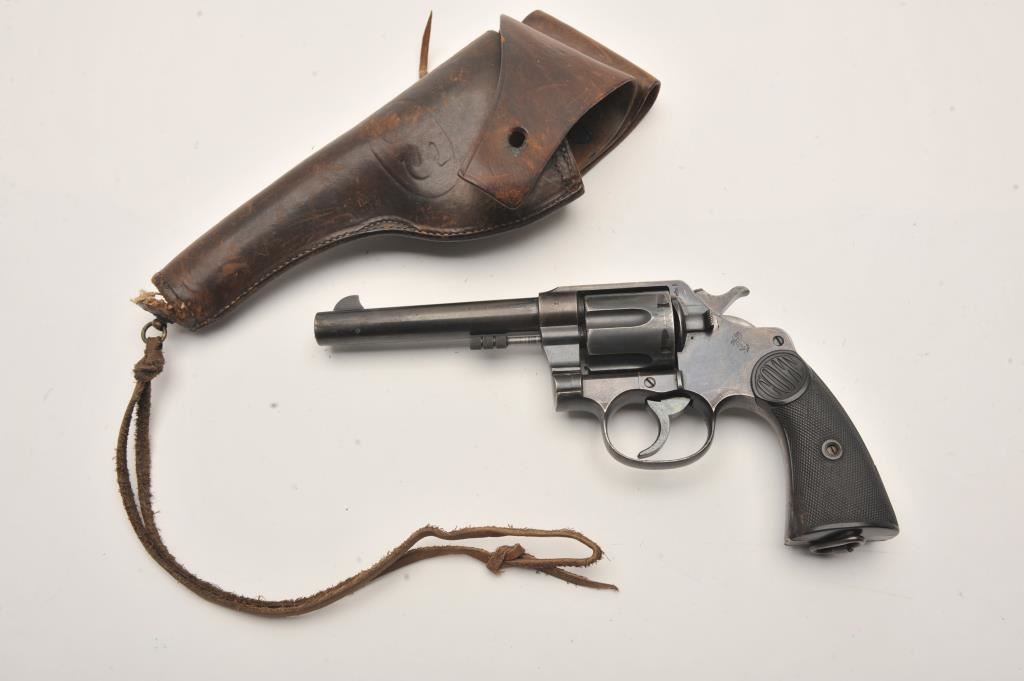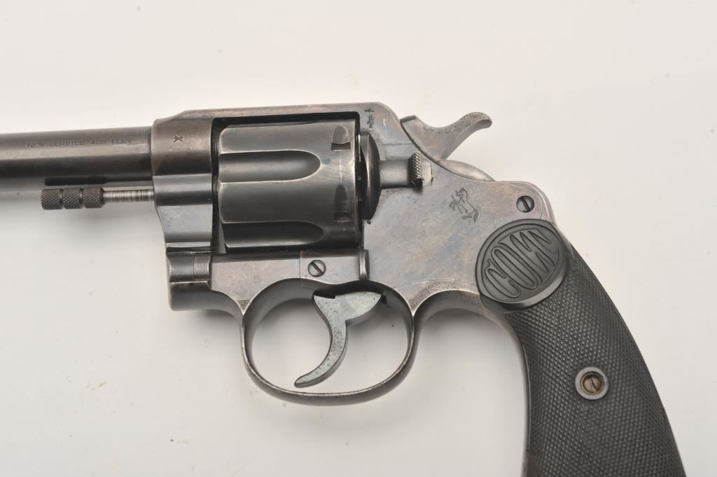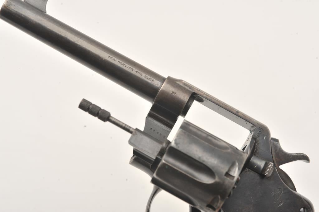 Colt New Service DA revolver #69455, .455 Eley cal., 5 1/2" barrel, British proofed, blued finish, with checkered logo grips. Revolver is in good to very good condition overall, showing most of it's original finish which is thinning, bore is good, action is good. Left grip shows an old repair in the lower front corner. There is an asterik proof on the rear grip strap indicating military use. Includes a US military flap holster marked "G.& K. 1918 A.G." in good to very good condition, (bottom plug stitching coming out). (C&R / PPT) Est $500-1000