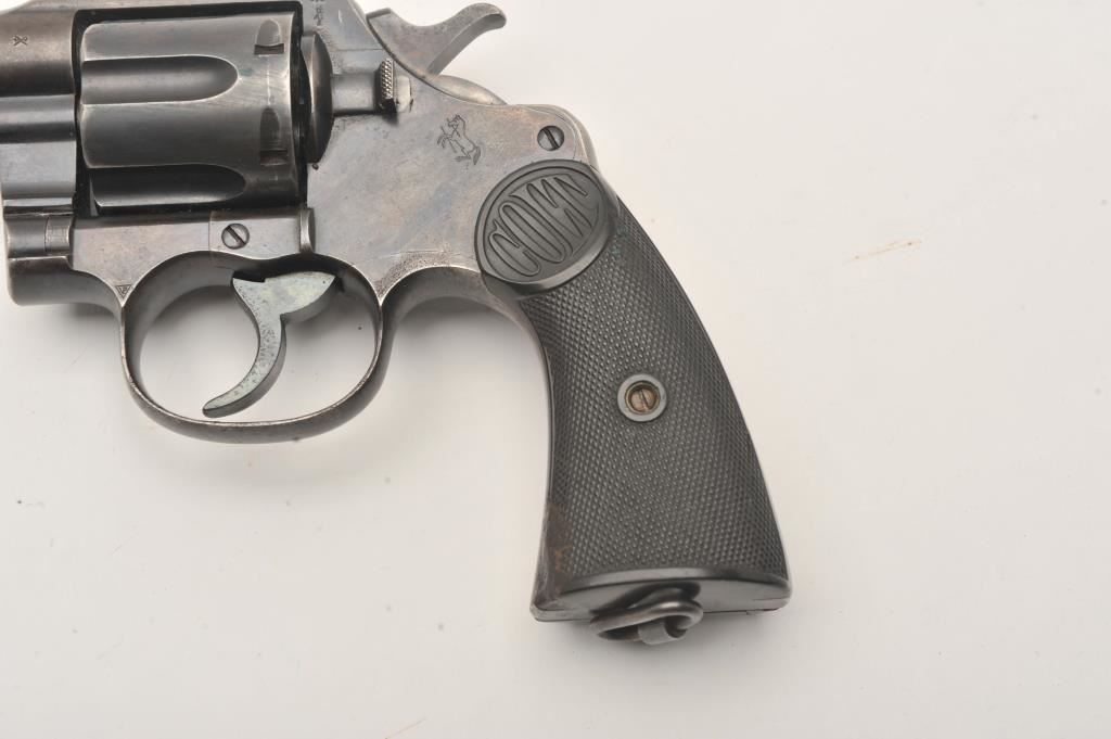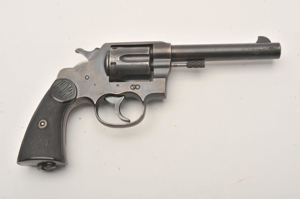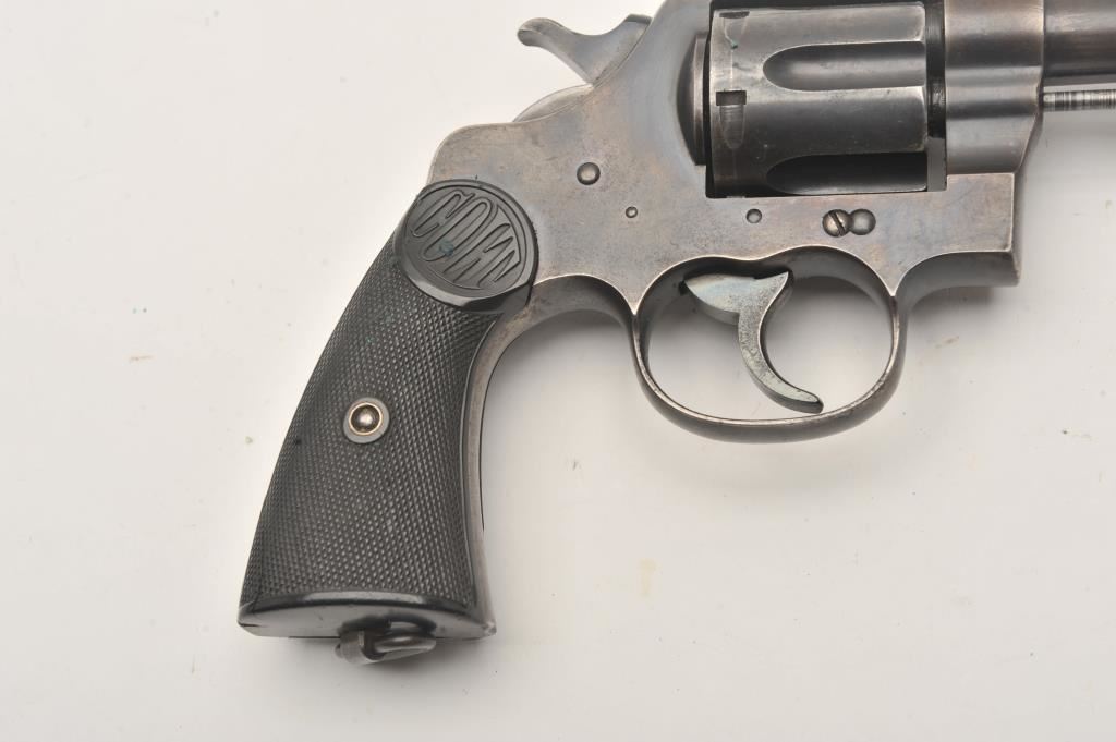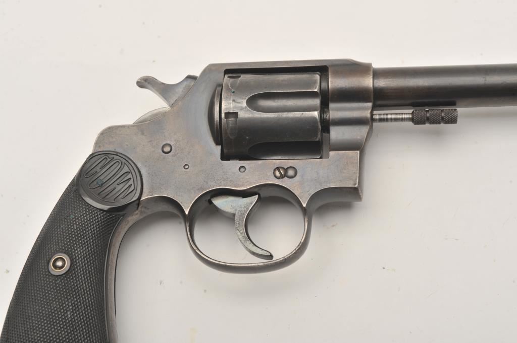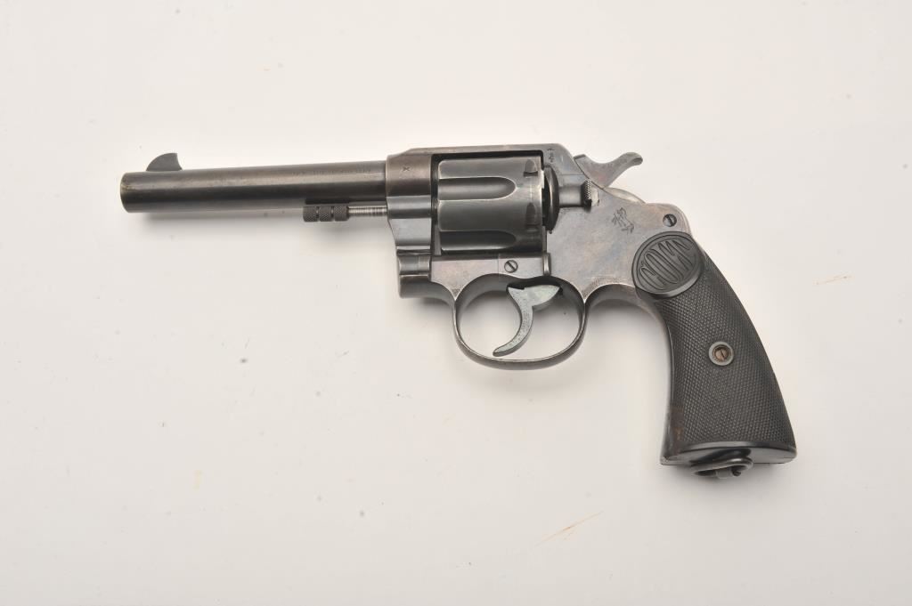 Colt New Service DA revolver #69455, .455 Eley cal., 5 1/2" barrel, British proofed, blued finish, with checkered logo grips. Revolver is in good to very good condition overall, showing most of it's original finish which is thinning, bore is good, action is good. Left grip shows an old repair in the lower front corner. There is an asterik proof on the rear grip strap indicating military use. Includes a US military flap holster marked "G.& K. 1918 A.G." in good to very good condition, (bottom plug stitching coming out). (C&R / PPT) Est $500-1000