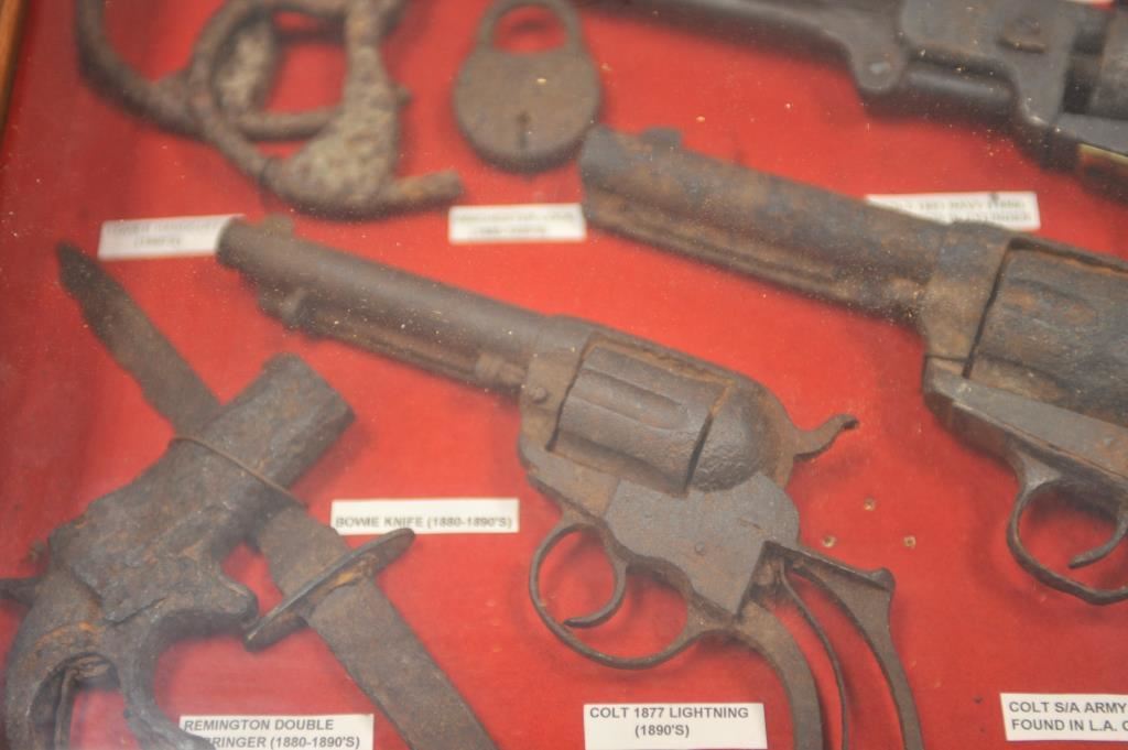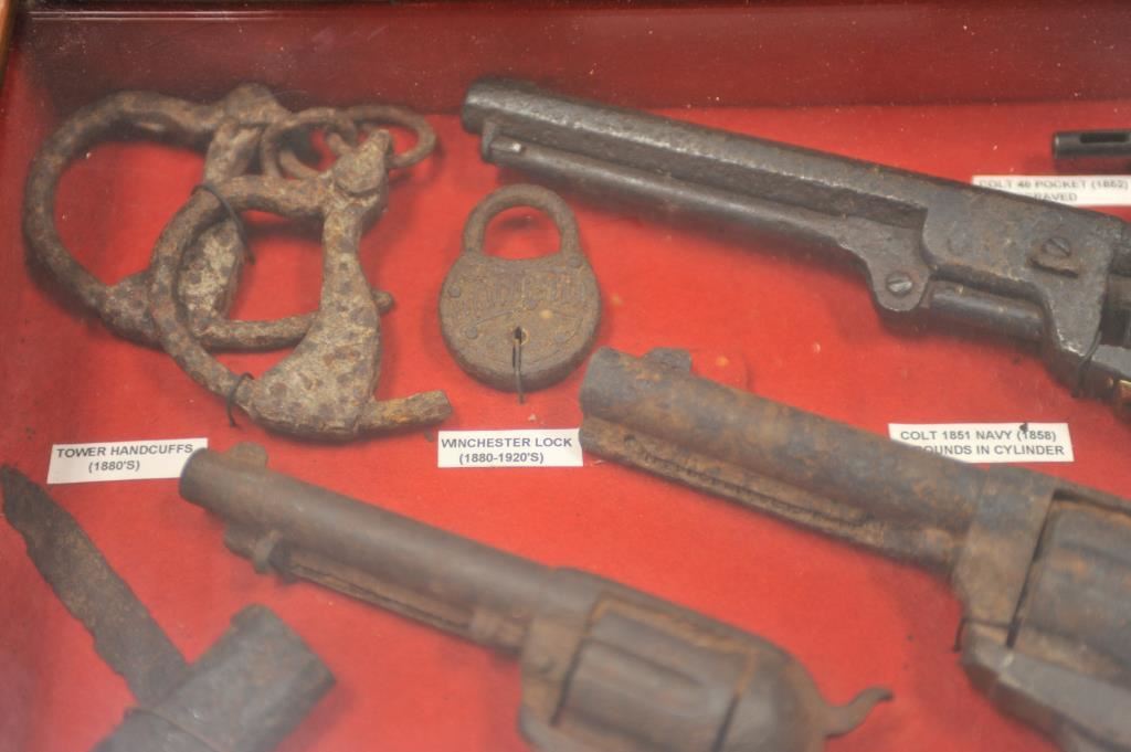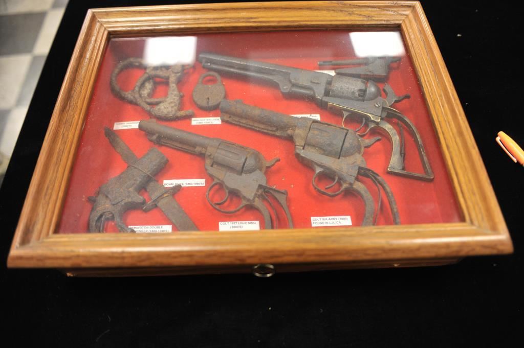 Wood and glass shadowbox display containing great rusty relics including a Colt Model 1851 Navy percussion revolver with 4 loaded cylinders, a Colt SAA revolver, a Colt Model 1877 DA revolver, a Remington Double Derringer, the frame of a Colt Model 1849 Pocket percussion revolver, a small bowie knife, a Winchester brand lock and a pair of handcuffs. Est.: $1,000-$2,000.