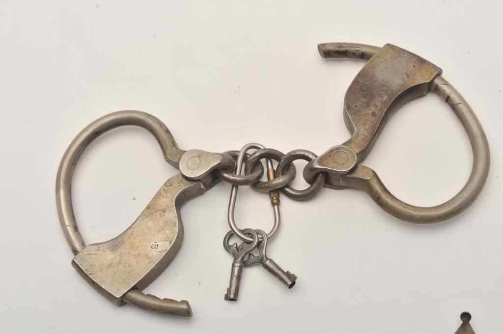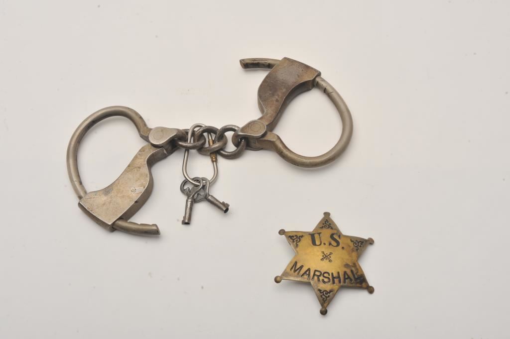 Lot including a U.S. Marshal badge marked on back “LAS&SCo” with good clasp; black enamel in lettering, front appears cleaned; also a pair of vintage handcuffs with 2 keys. Est.: $150-$300.