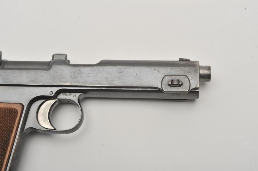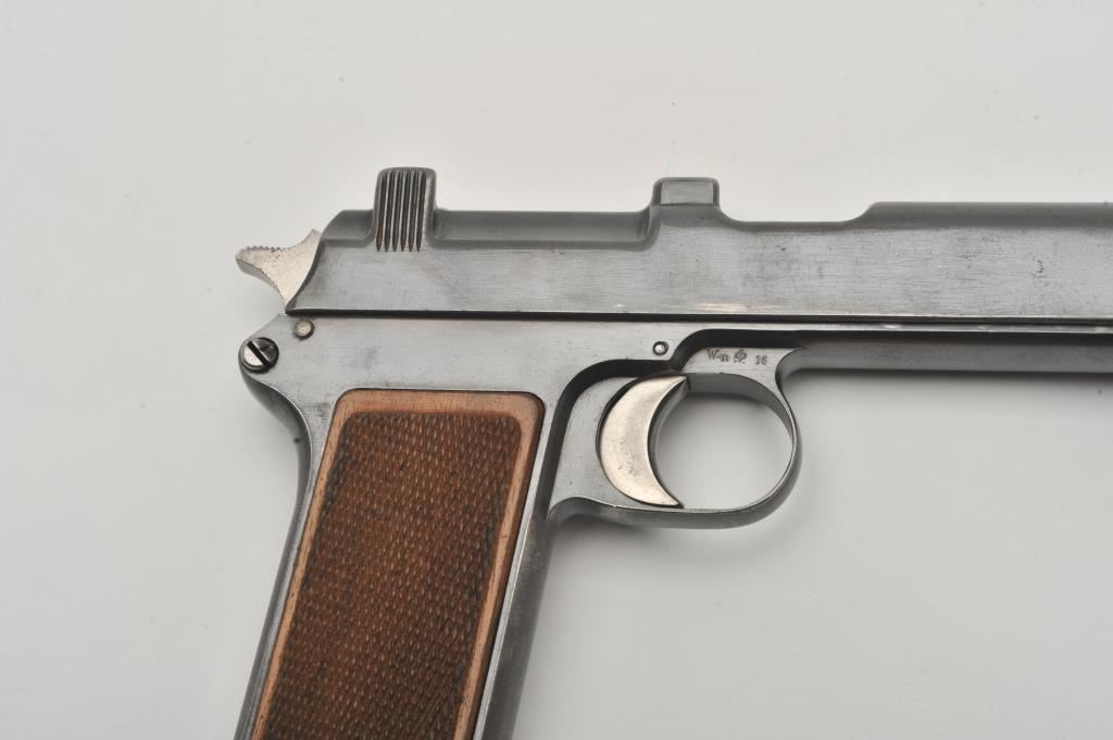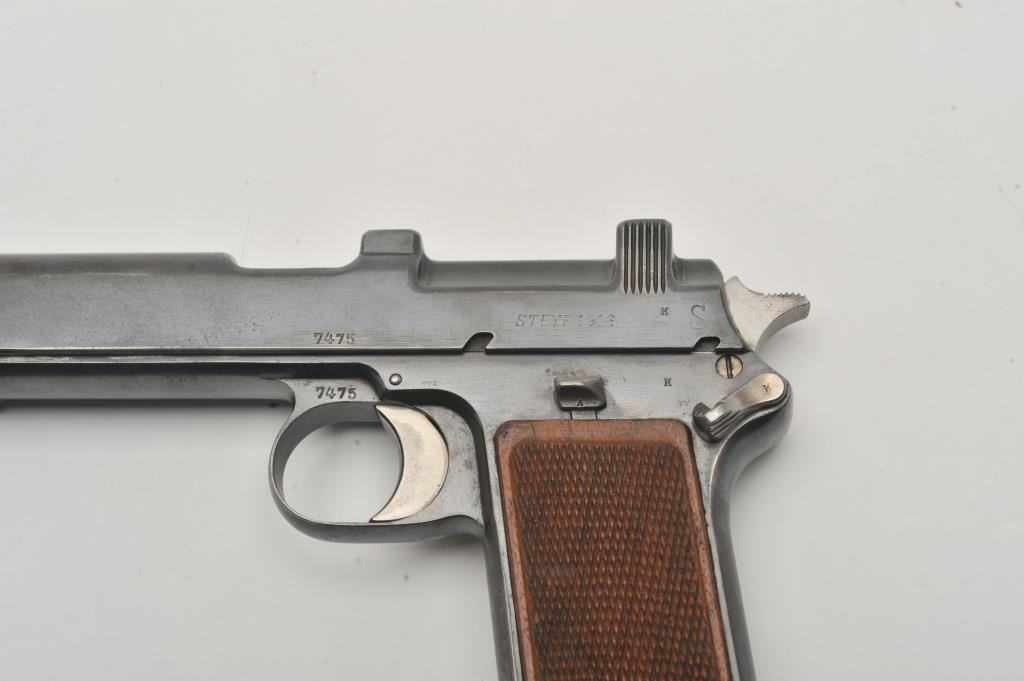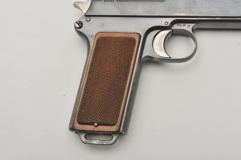 Steyr-Hahn 1916 semi-automatic pistol, 9mm Steyr caliber, 5” barrel, blued finish, checkered wood grips, S/N 7475; overall good to very good condition showing majority of muted blued finish on metal surfaces, crisp action, good markings, very good grips. (C&R/PPT). Est.: $400-$800.