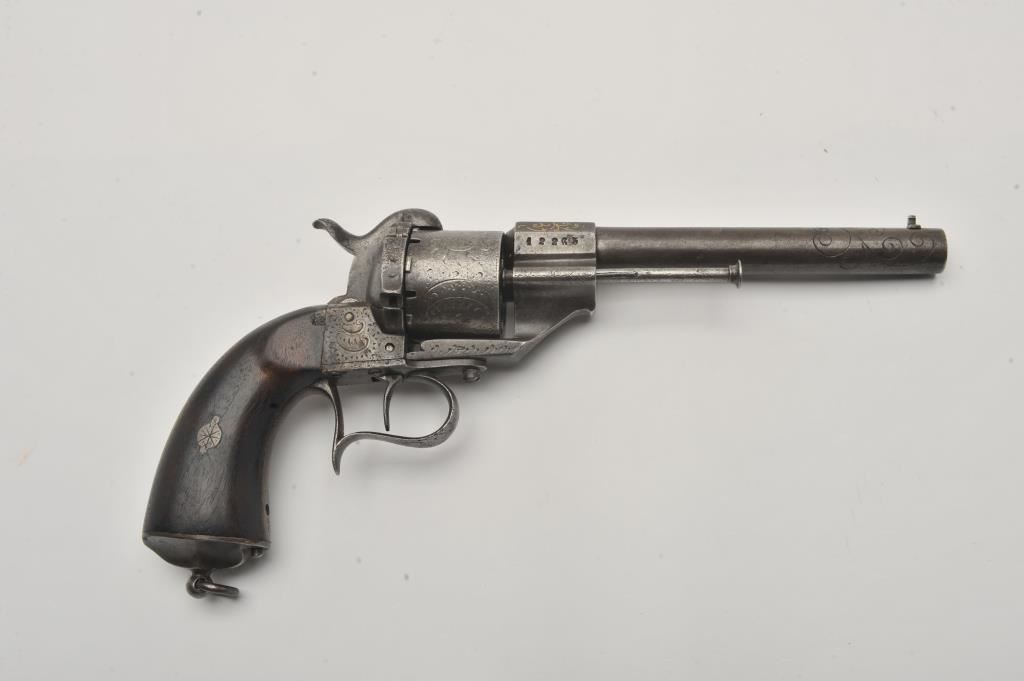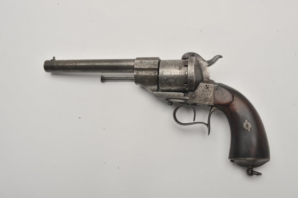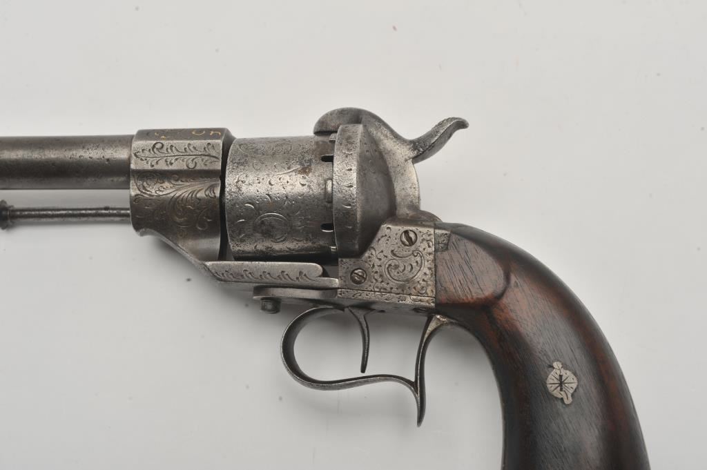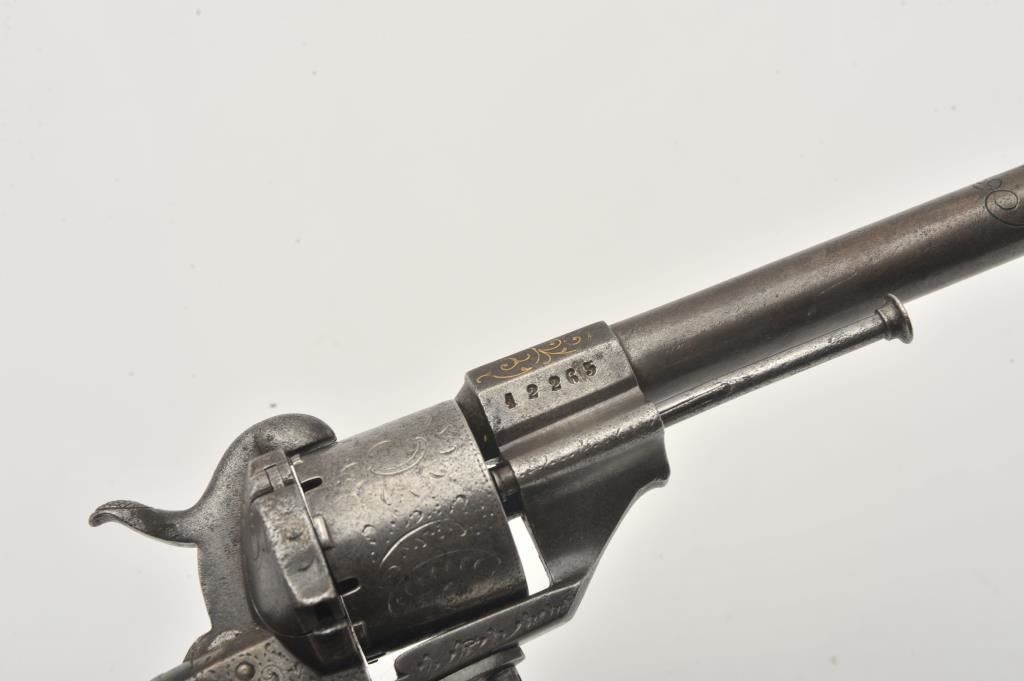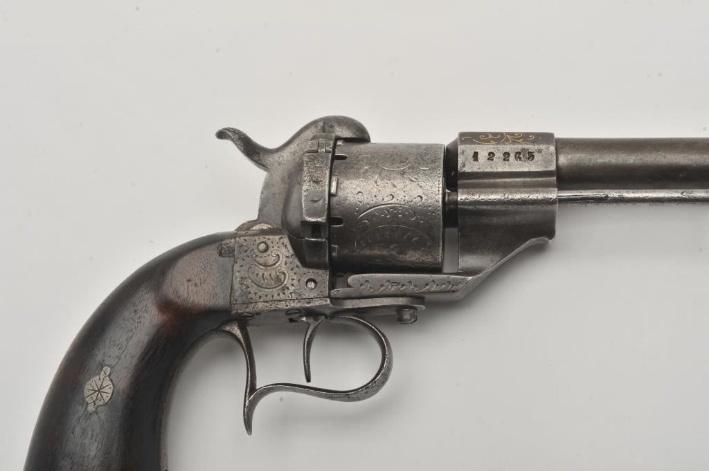 Large frame old Spanish-made copy of an engraved Lefaucheux pinfire revolver, 12 mm caliber, 6.5” barrel, grey patina, wood grips, lanyard ring, S/N 12265; overall good condition with some remaining gold wash in barrel address and engraving on the breech end of the barrel; some scattered areas of erosion and pitting, good action; grips are good to very good. (Antique). Est.: $250-$500.