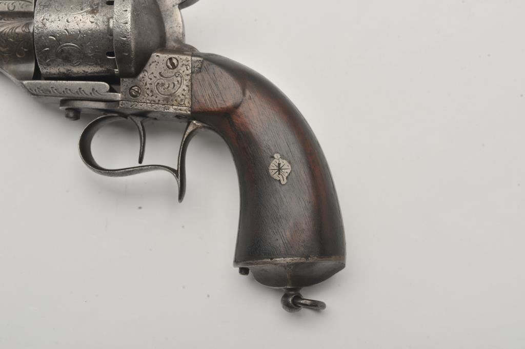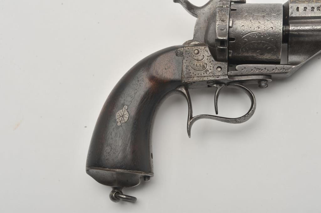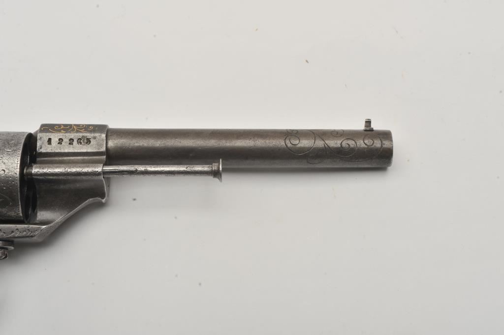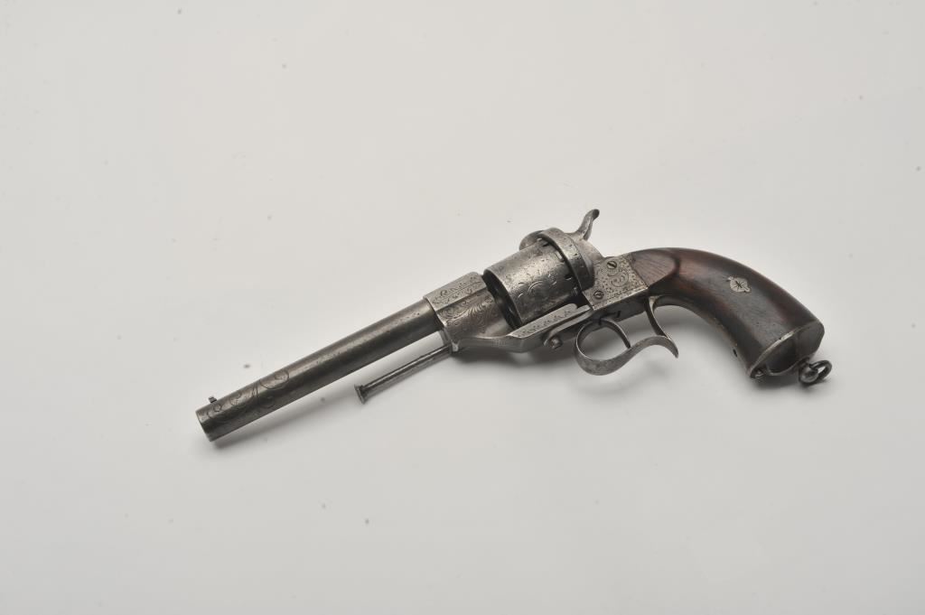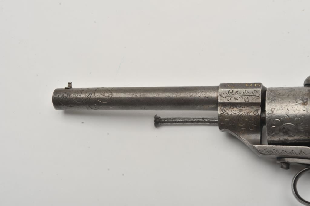 Large frame old Spanish-made copy of an engraved Lefaucheux pinfire revolver, 12 mm caliber, 6.5” barrel, grey patina, wood grips, lanyard ring, S/N 12265; overall good condition with some remaining gold wash in barrel address and engraving on the breech end of the barrel; some scattered areas of erosion and pitting, good action; grips are good to very good. (Antique). Est.: $250-$500.