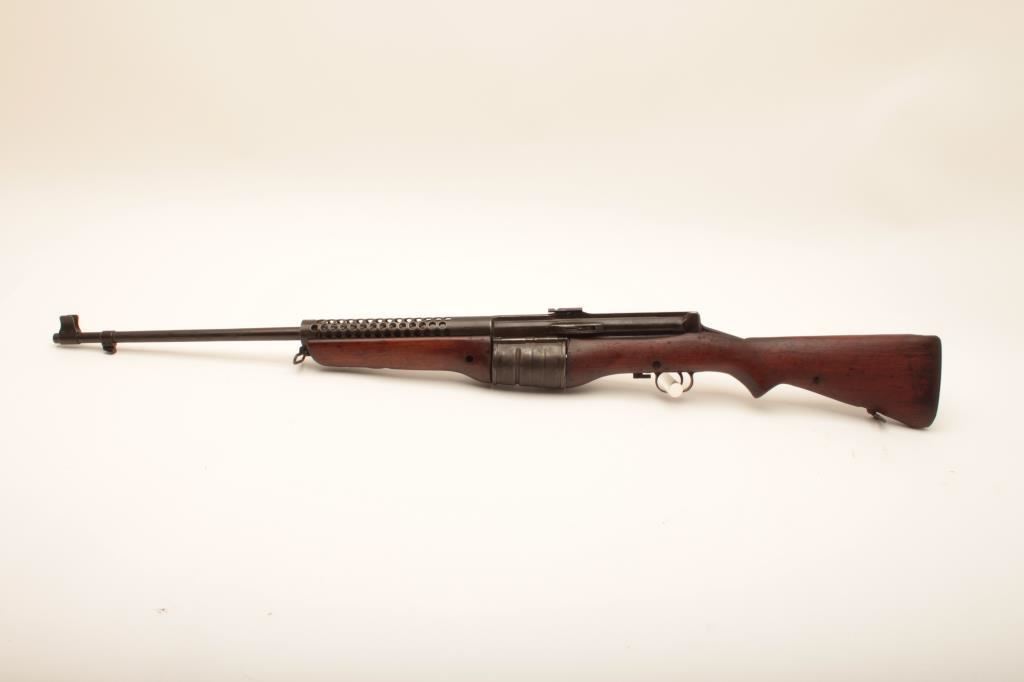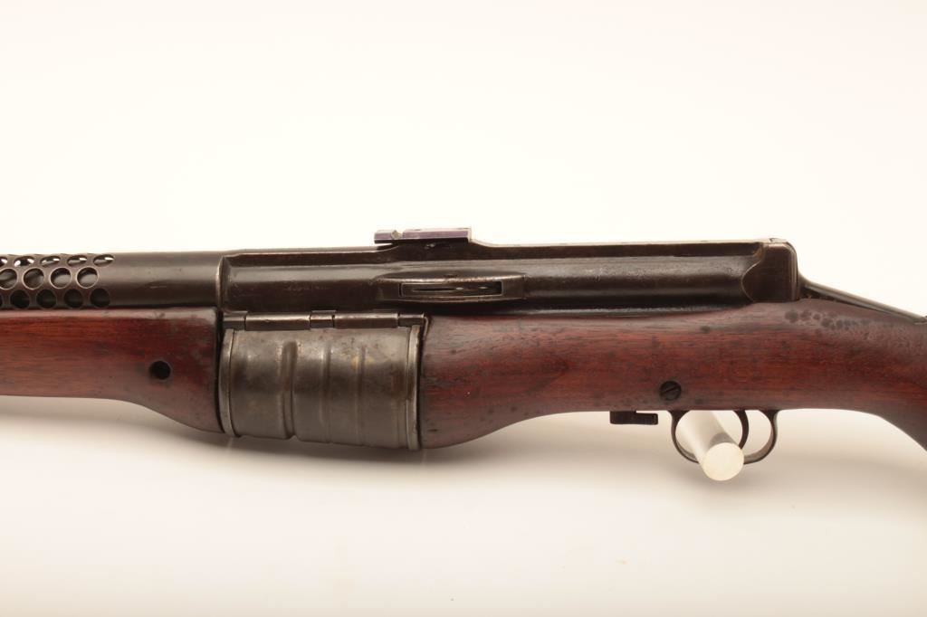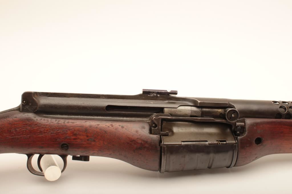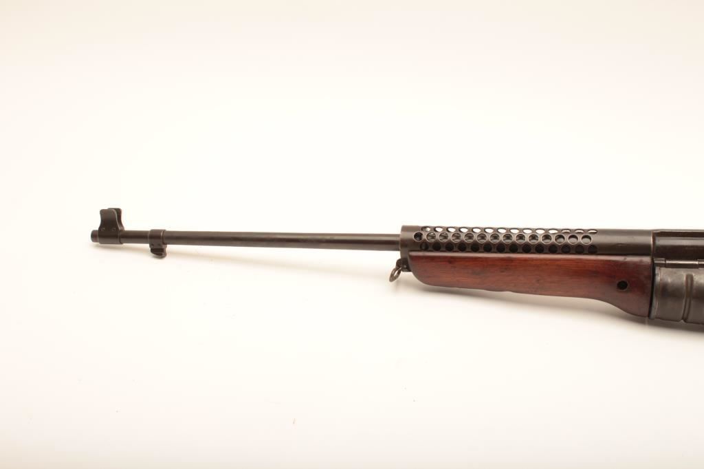 Johnson Automatics Model of 1941 semi-automatic rifle, .30-06 caliber, Serial #5596. The rifle is in good overall condition with a 23” barrel. The metal surfaces retain a significant amount of their military style finish with small mars and scratches. The top of the receiver has been drilled and a Weaver style base has been dove tailed into the top of the receiver. The smooth wood stock is in good overall condition with mars and compressions consistent with carry and use. The bore is fair, the action is crisp and markings are sharp on this Johnson which would benefit from some careful restoration. Est.: $800-$1,600. (C+R).