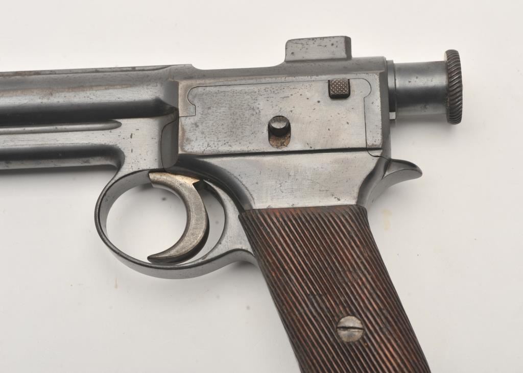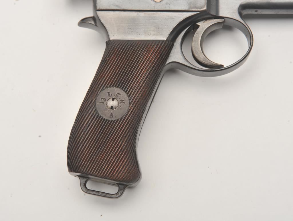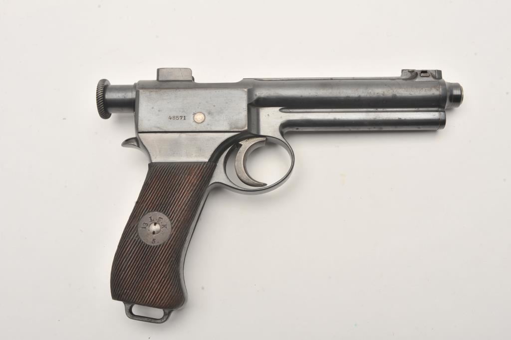 Roth-Steyr Model 1907 semi-automatic pistol, 8mm Roth-Steyr caliber, Serial #48571. The pistol is in very good overall condition with a 5” barrel. The pistol retains the majority of its blue finish with pinprick pitting at the muzzle, high point edge wear and some light surface erosion. The ribbed wood grips are in good condition with small mars from carry and use. The bore is fair, the action is crisp and the markings are sharp on this desirable, early Steyr. Est.: $600-$1,200. (C+R).