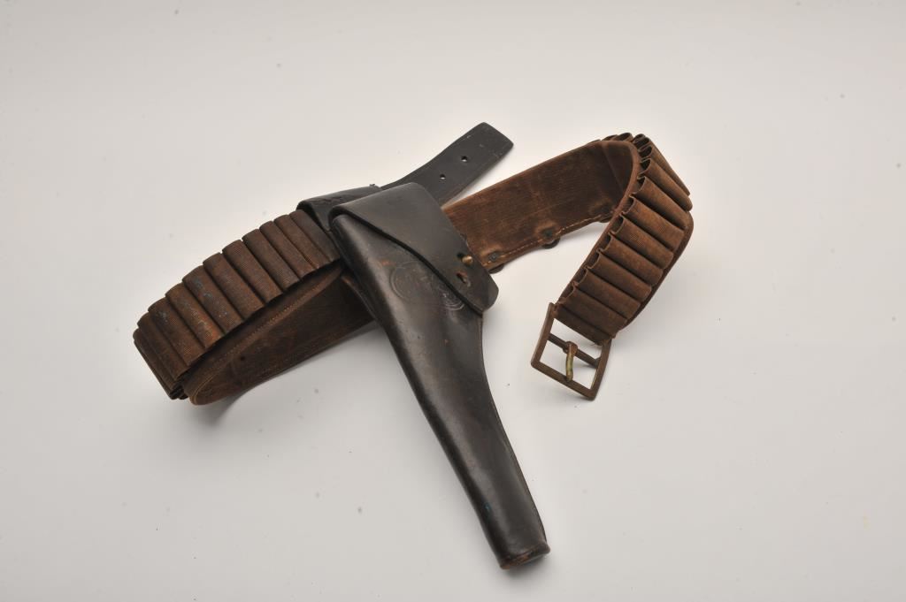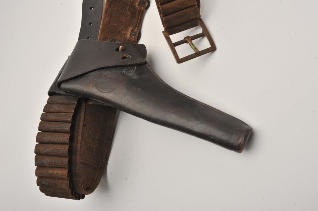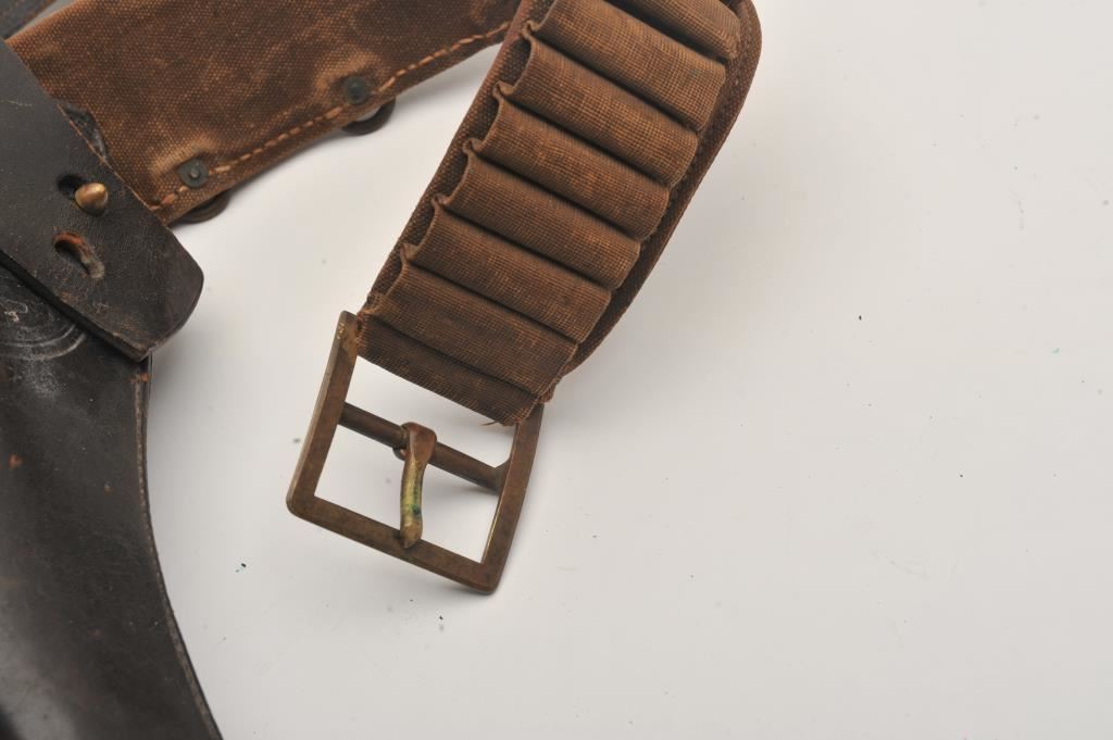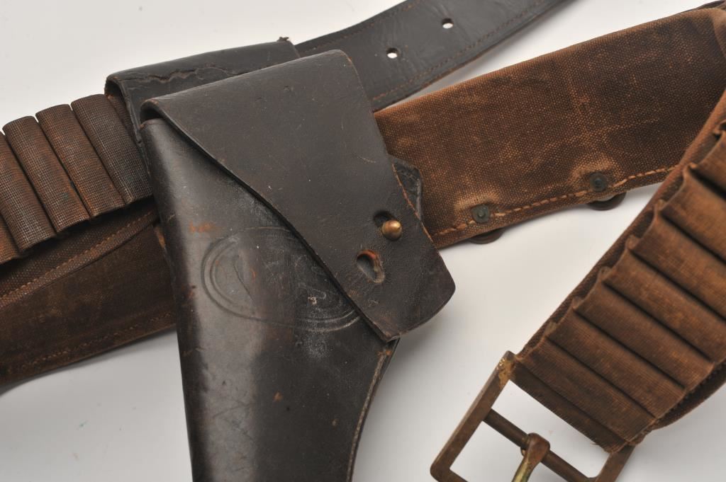U.S. leather flap holster with two position clasp for SAA and Schofield revolvers, 6-rivet hanger; accompanied by an early canvas and leather prairie cartridge belt. Est.: $600-$1,200.