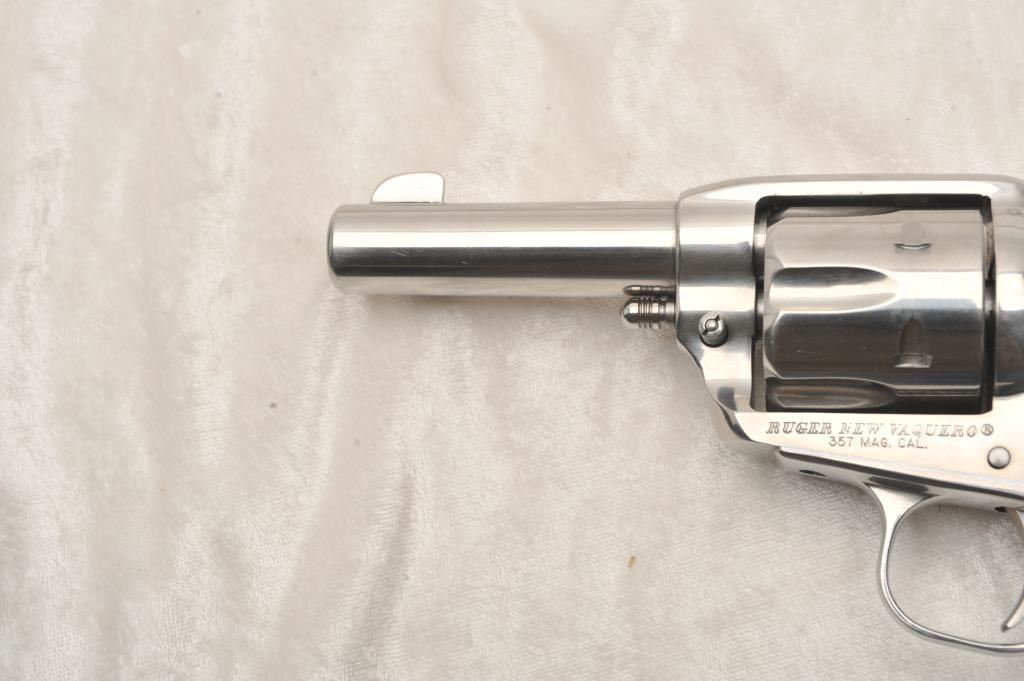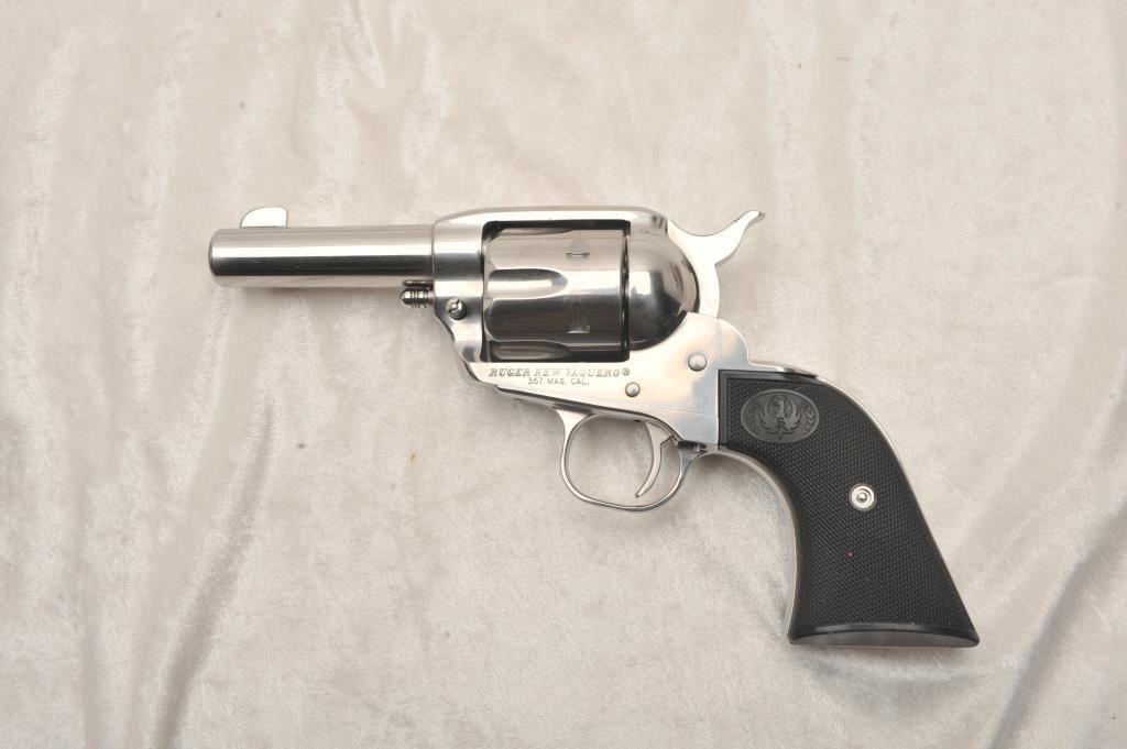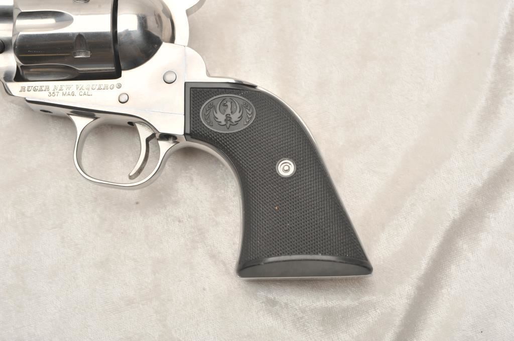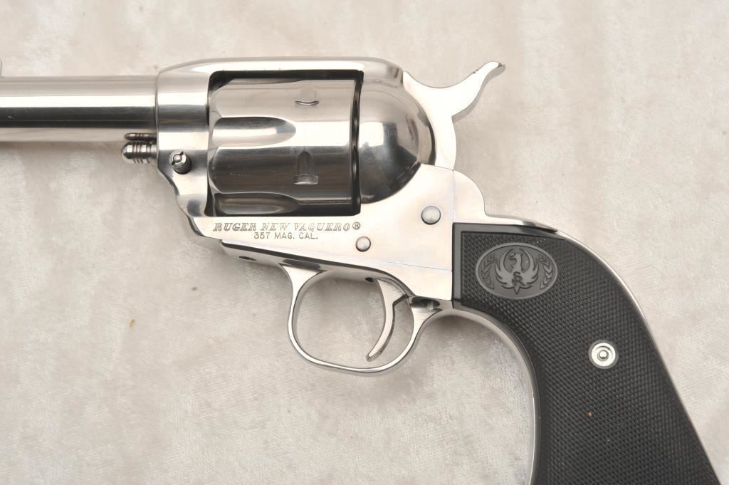Ruger New Vaquero, #510-63591, .357 Mag, 3" barrel, stainless, fixed sights with hard rubber logo grips. Revolver is in very good to near excellent condition overall, excellent action, fine bore, very good grips. Shows just minimal handling marks. (Modern) Est. $400-800