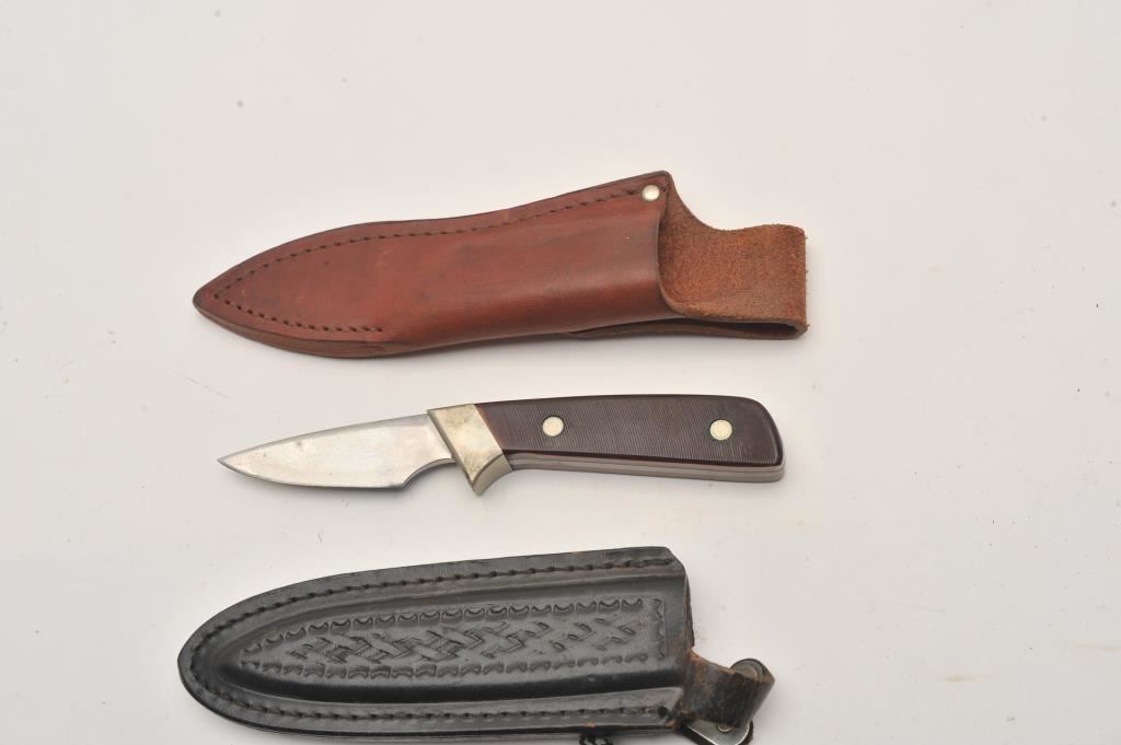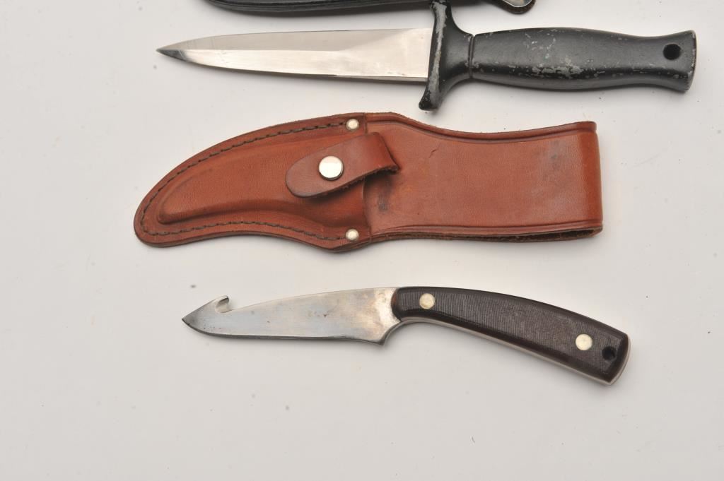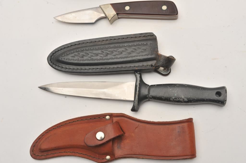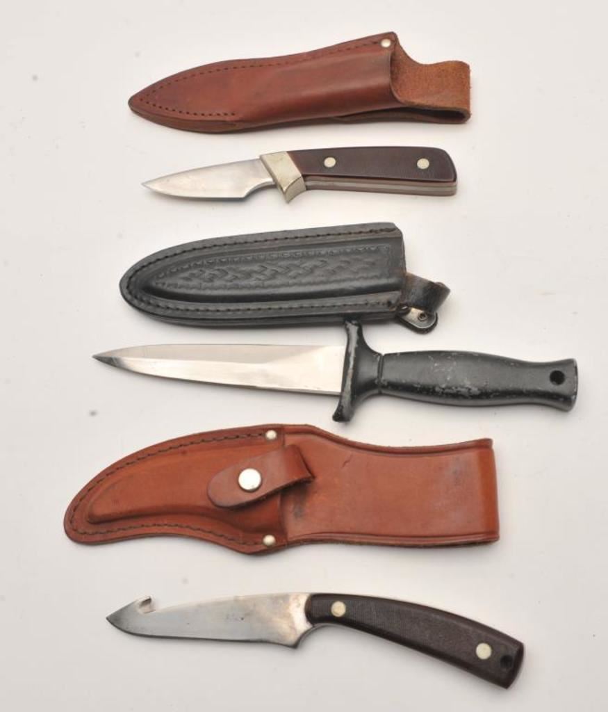 Lot of 3 knives as described; Frost cutlery fighting knife with basket weave scabbard and aluminum grip. The blade measures 5” along with 2 Schrade skinning knives. Est.: $60-$120