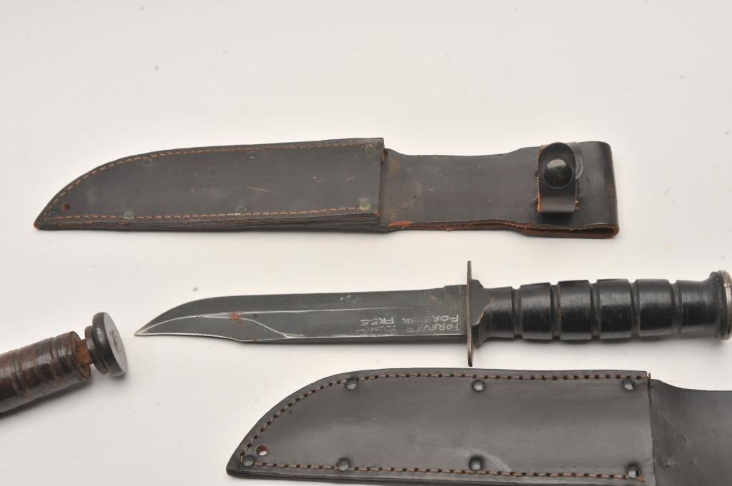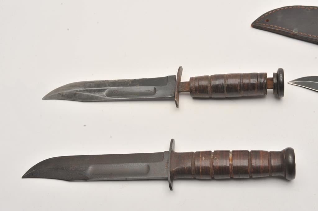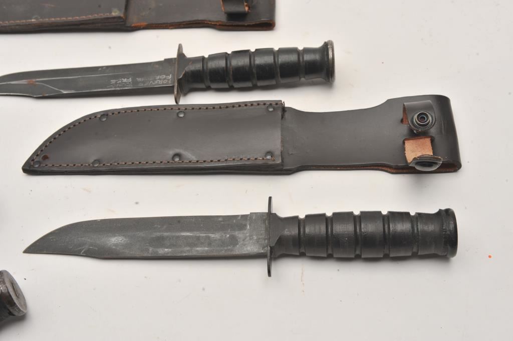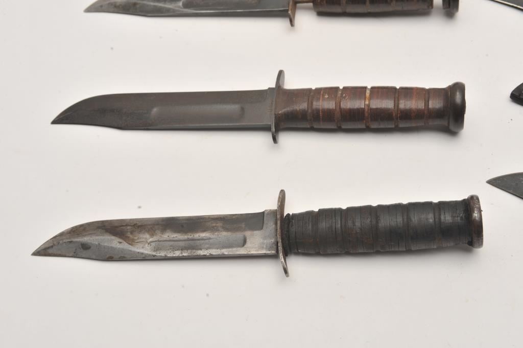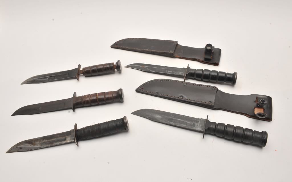 Lot of 5 military knives. 1. Kabar style fighting knife by Camillus. The blade is inscribed “Forever Young, Forever Free” with scabbard. Sharpened edge. Good plus. 2. U.S.M.C. Kabar style. No maker. Slightly rough blade, bent guard and damaged grip. Fair only. 3. U.S. Mark 1. Blade slightly sharpened. Damaged and needing repair. 4. Kabar U.S.N. marked fighting knife. Good to very good. No scabbard. 5. Kabar style U.S. Camillus. Vietnam era finish. Later scabbard. Very good plus. Est.: $200-$400