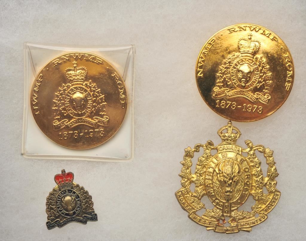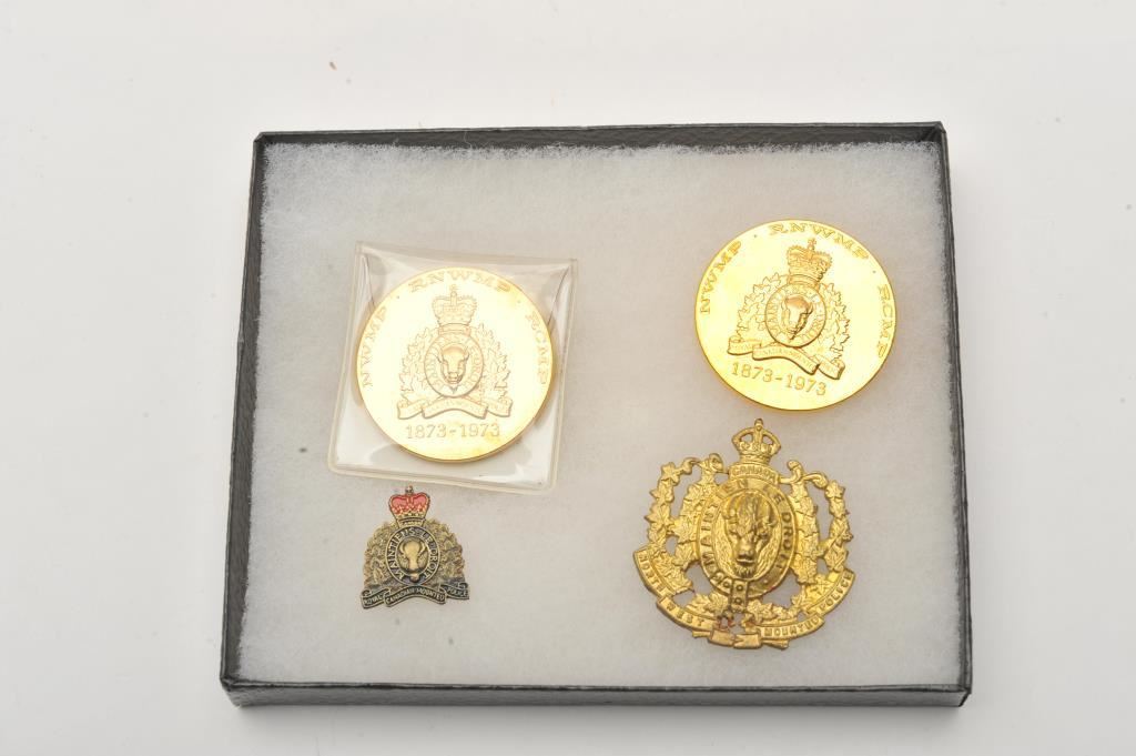 Lot of 4 misc. Royal Canadian Mounted Police pins (2) and Commemorative coins (2) in riker case. Est.: $50-$75.
