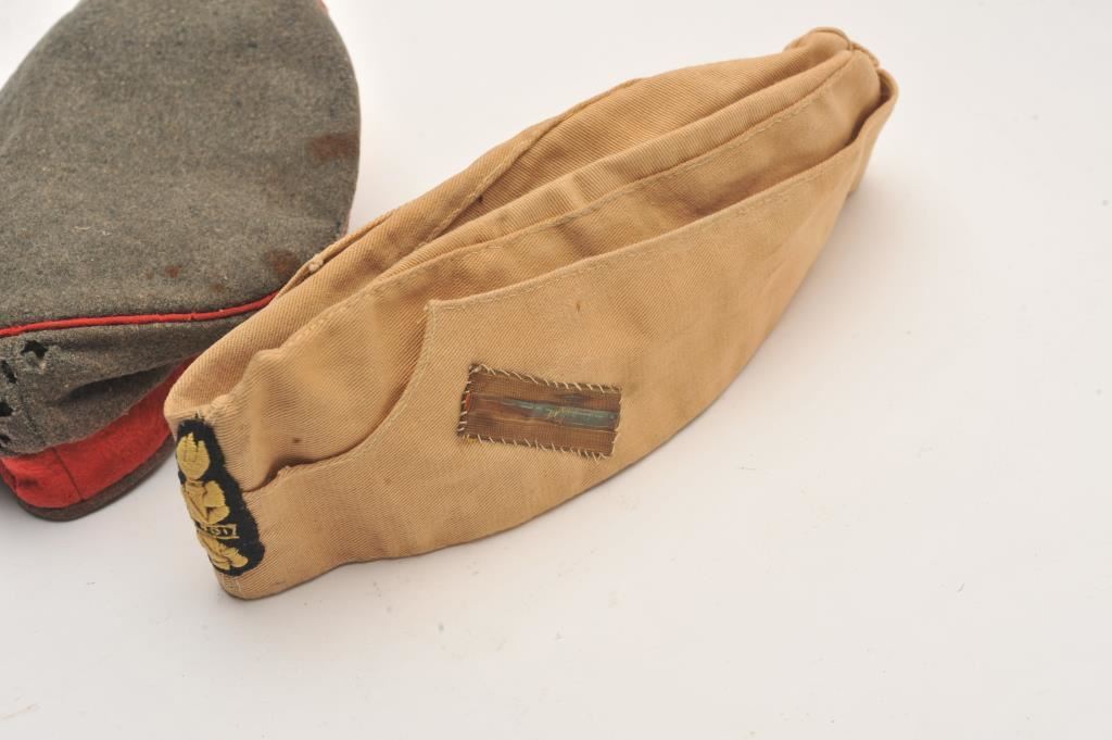 Italian field cap with severe mothing. Along with Italian tropical field cap found in Sicily probably Africa Corps with emblem and service patch. Size 58. Est.: $50-$100