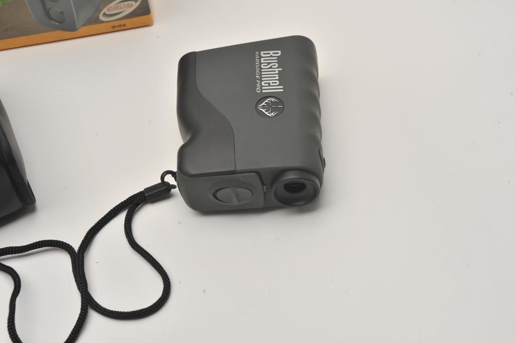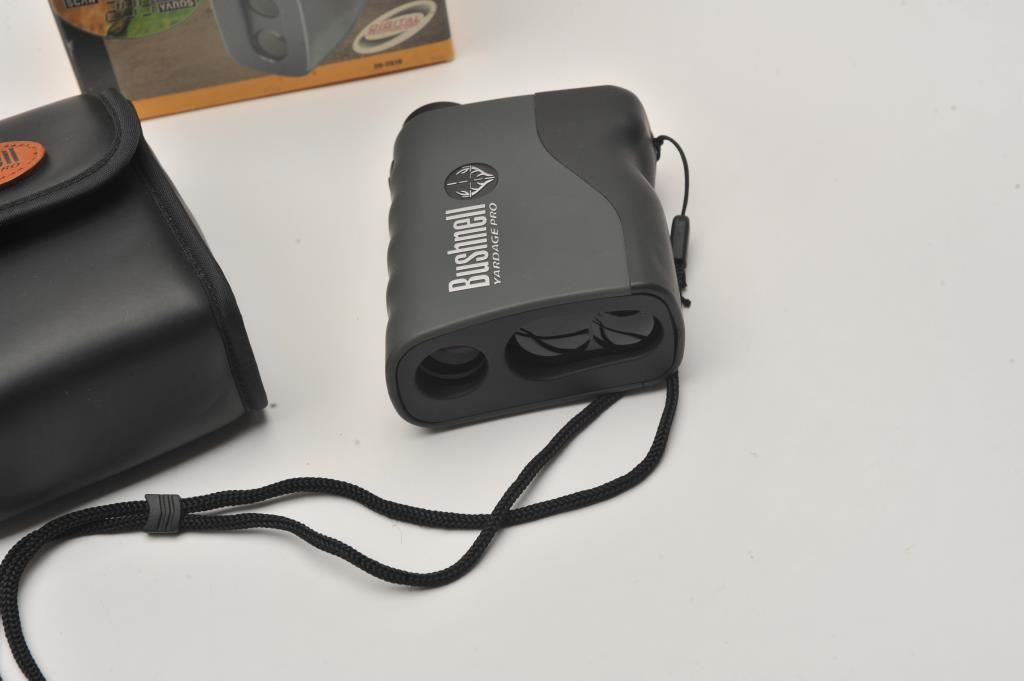 Bushnell Trophy Yardage Pro laser rangefinder. The rangefinder is in very good overall condition in the factory box. The rangefinder works on one 9 volt battery and will estimate images between 5-800 yards. Est.: $75-$150.