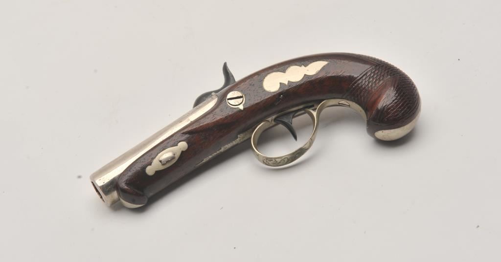 Percussion derringer, no visible markings, .44 caliber, 2.5” barrel, checkered wood single key stock, overall good condition as restored showing older re-nickel and reblued finish, good action, good stock as re-varnished. (Antique). Est.: $250-$500.