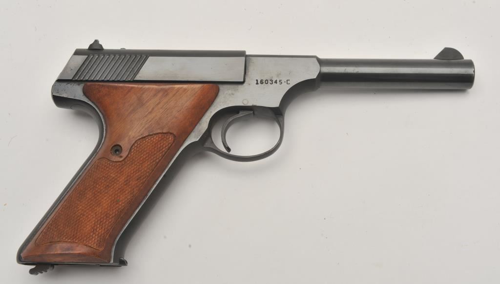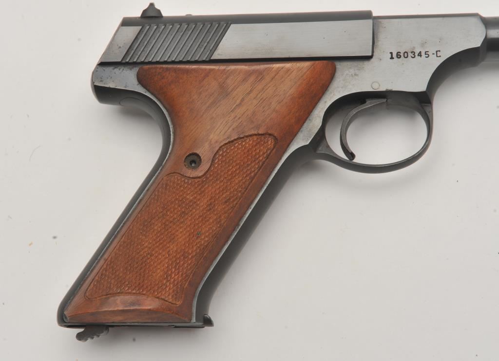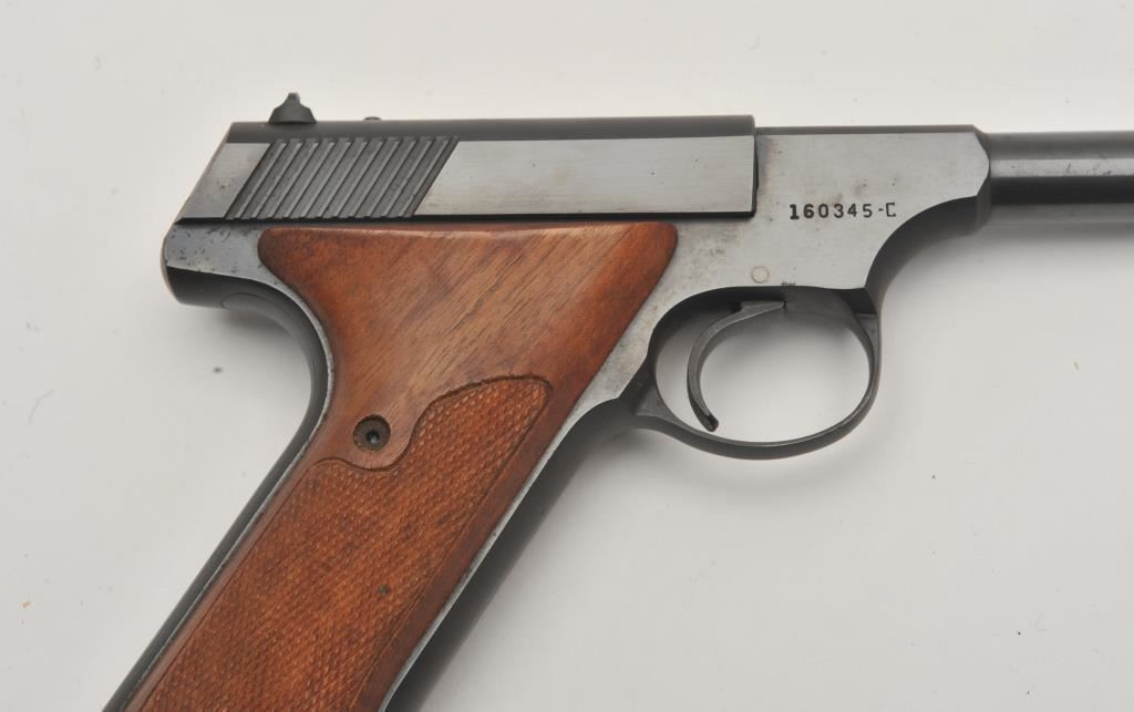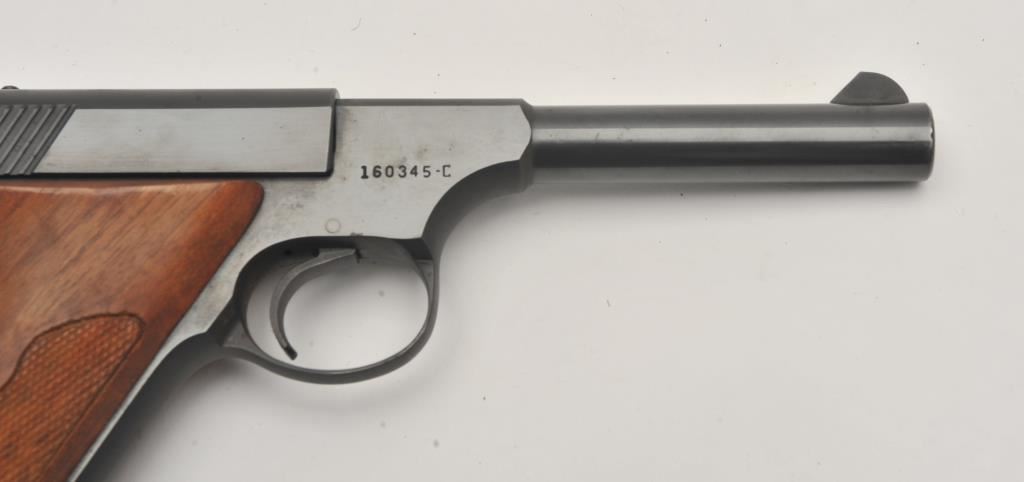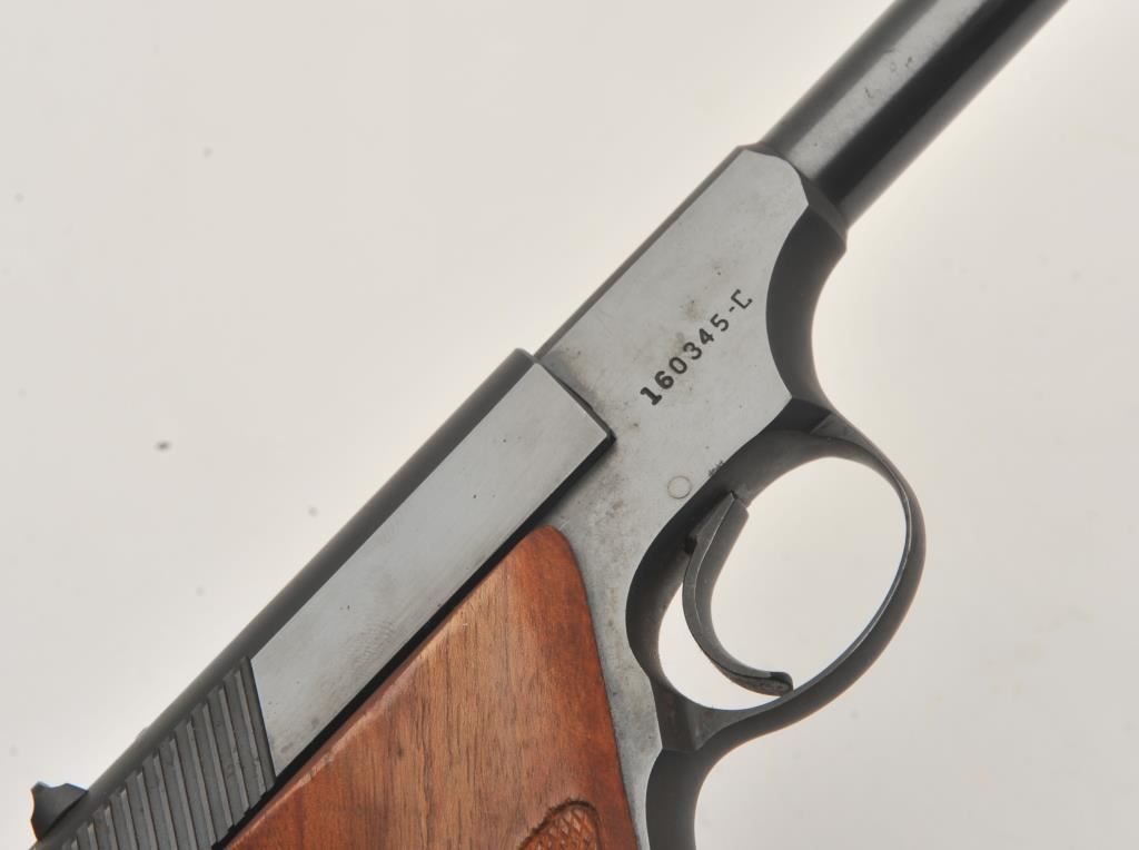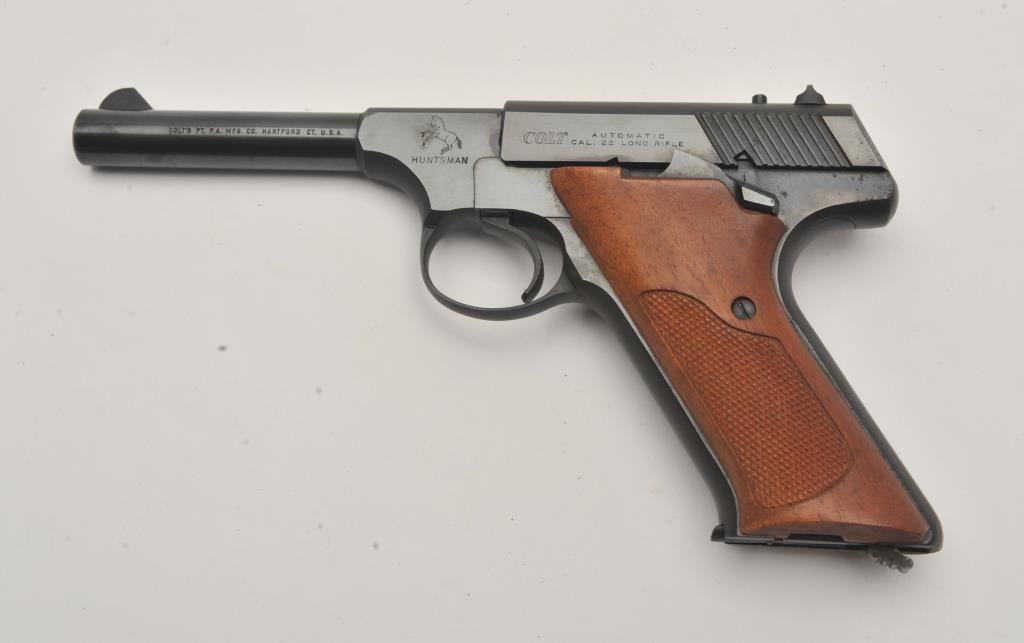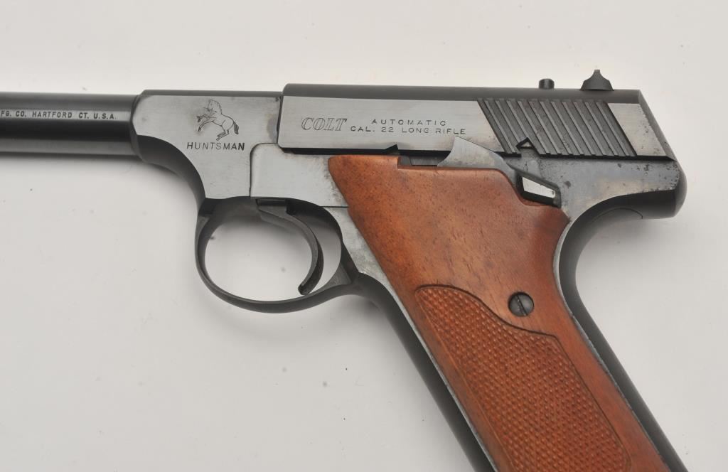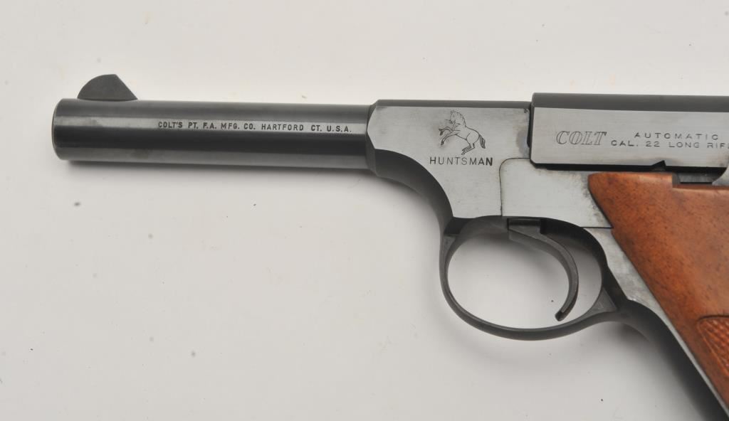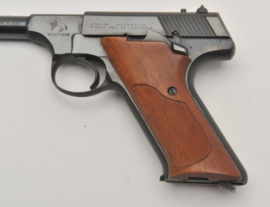 Colt Huntsman semi-automatic pistol, .22LR caliber, 4.5” barrel, blued finish, checkered wood grips, S/N 160345-C; overall fine condition showing majority of original blued finish with slight muzzle wear; fine bore, crisp action, sharp markings and fine grips. (C&R/PPT). Est.: $350-$700.