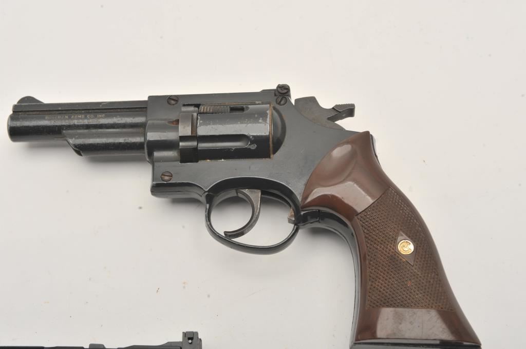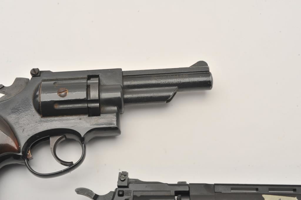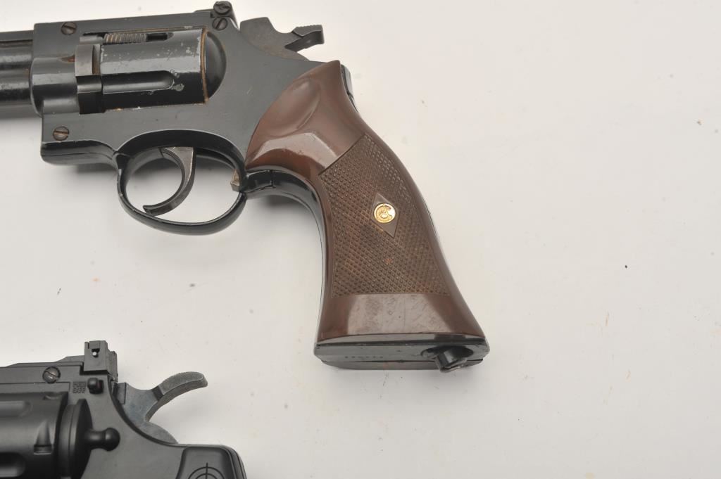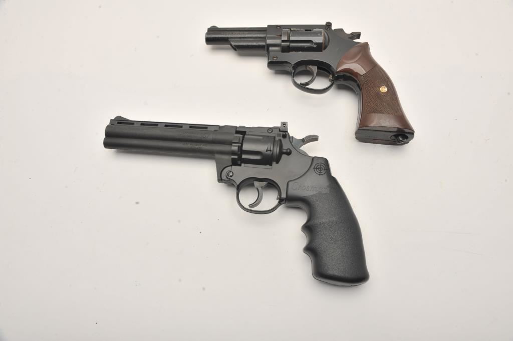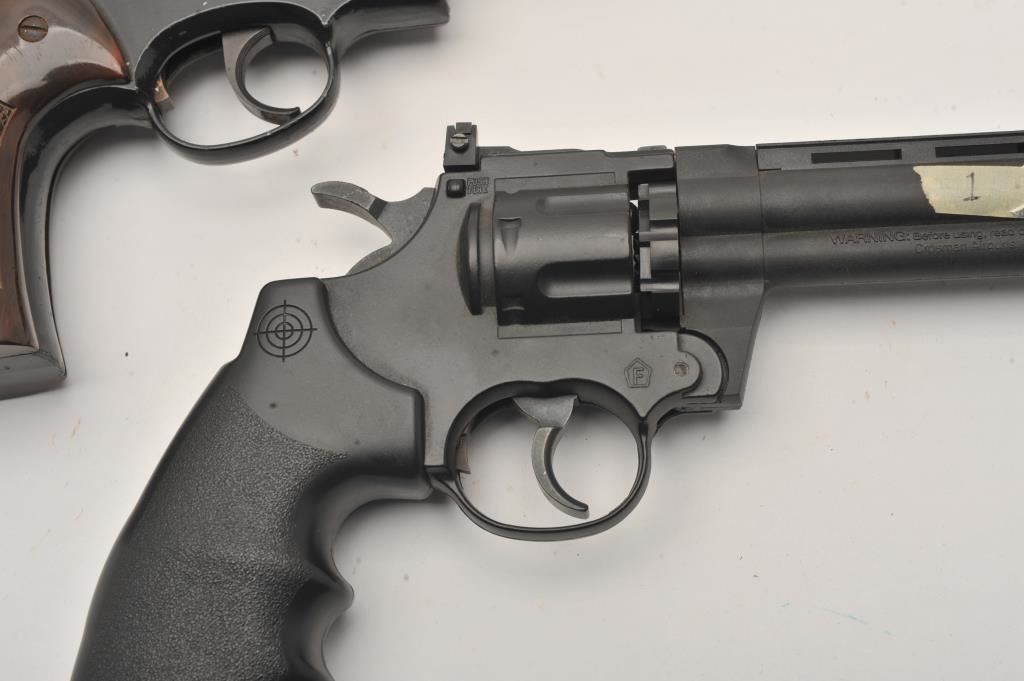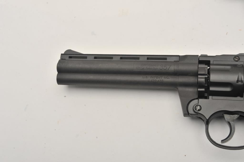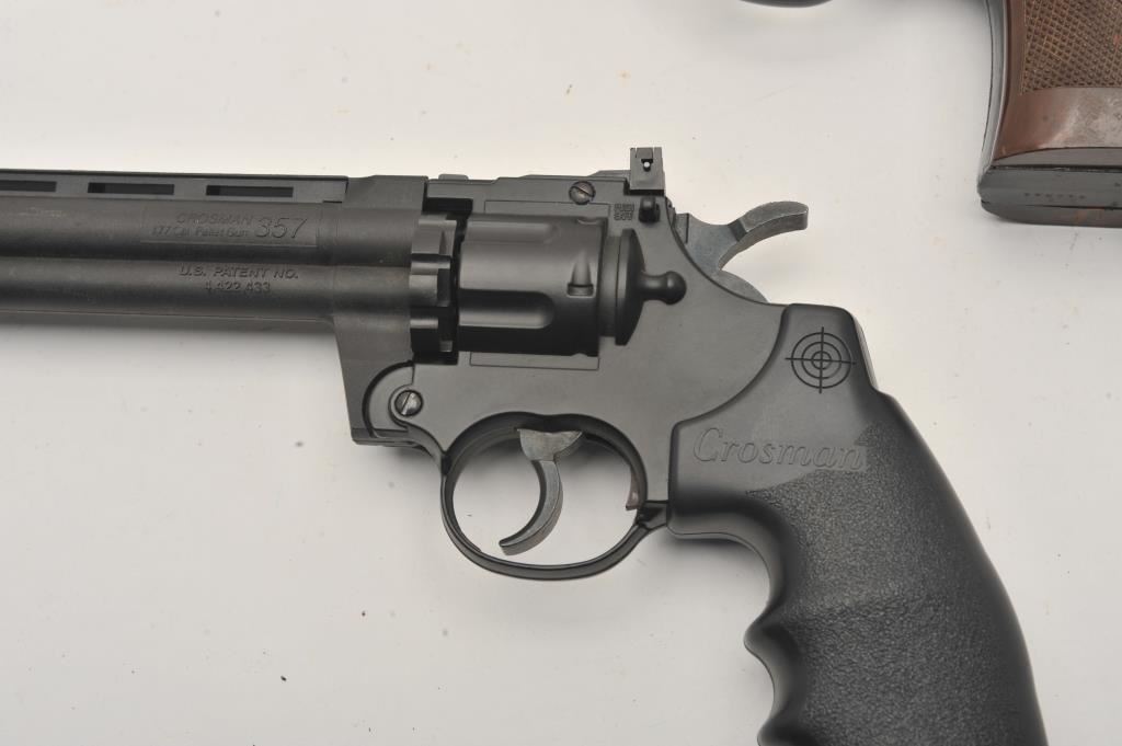 Lot of three Crosman CO2 air pistols. The lot includes a Crosman Mark II Target single shot air pistol in .177 caliber, a Crosman Model .357 air pistol revolver in .177 caliber and a Crosman Model 380 in .22 caliber. All three pistols are in good overall condition. Est.: $100-$200.