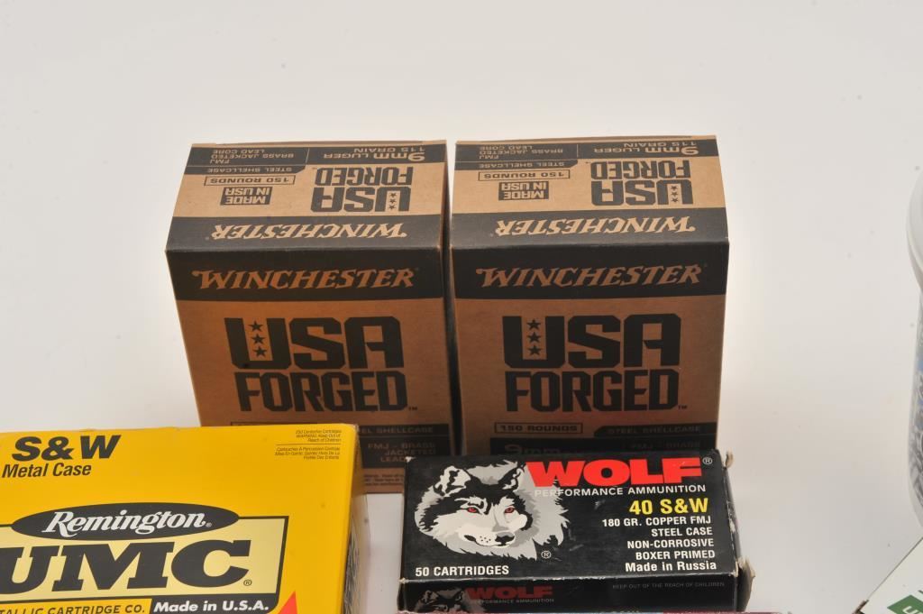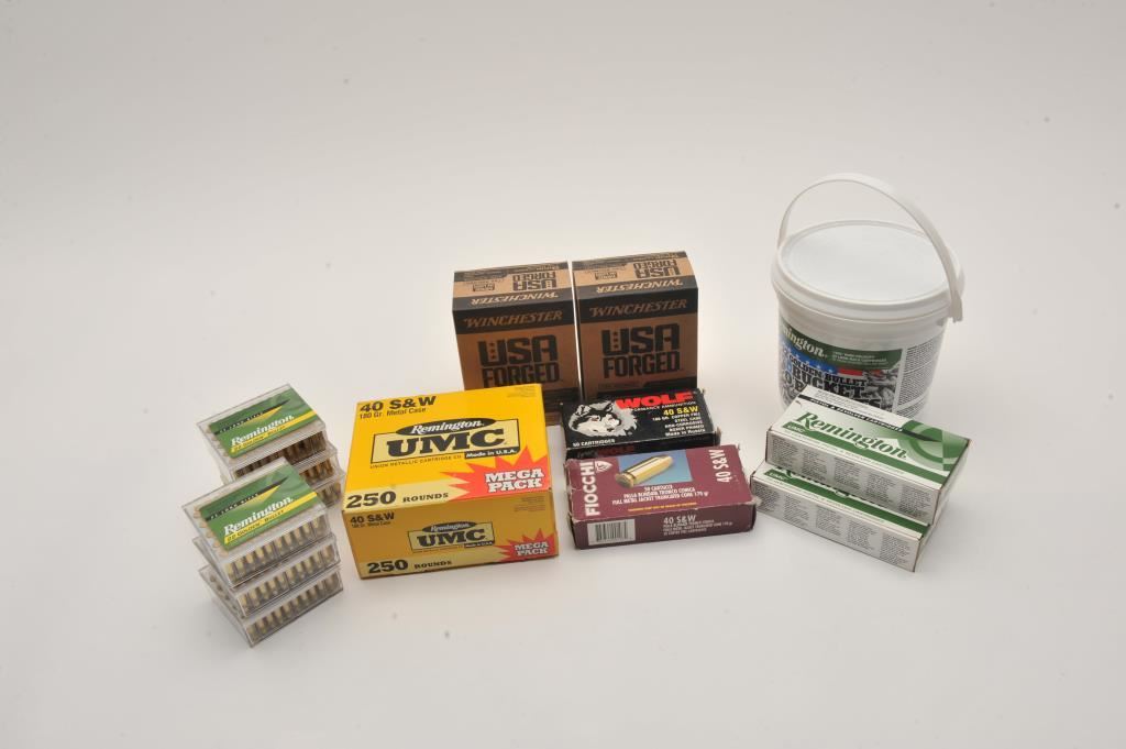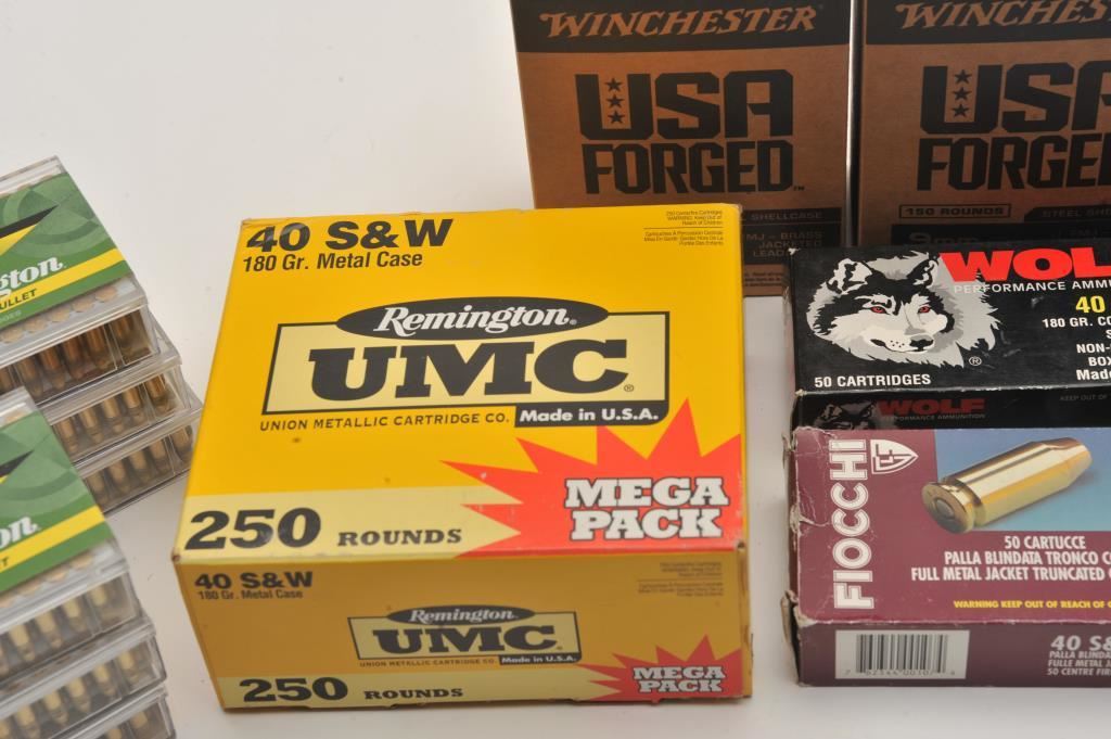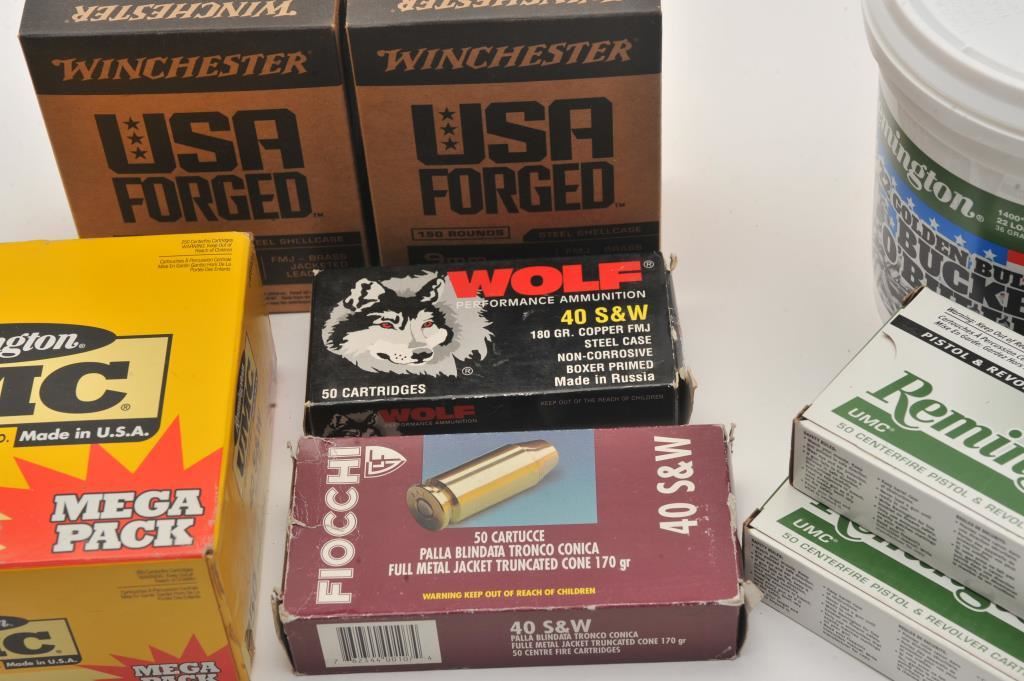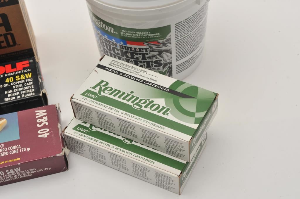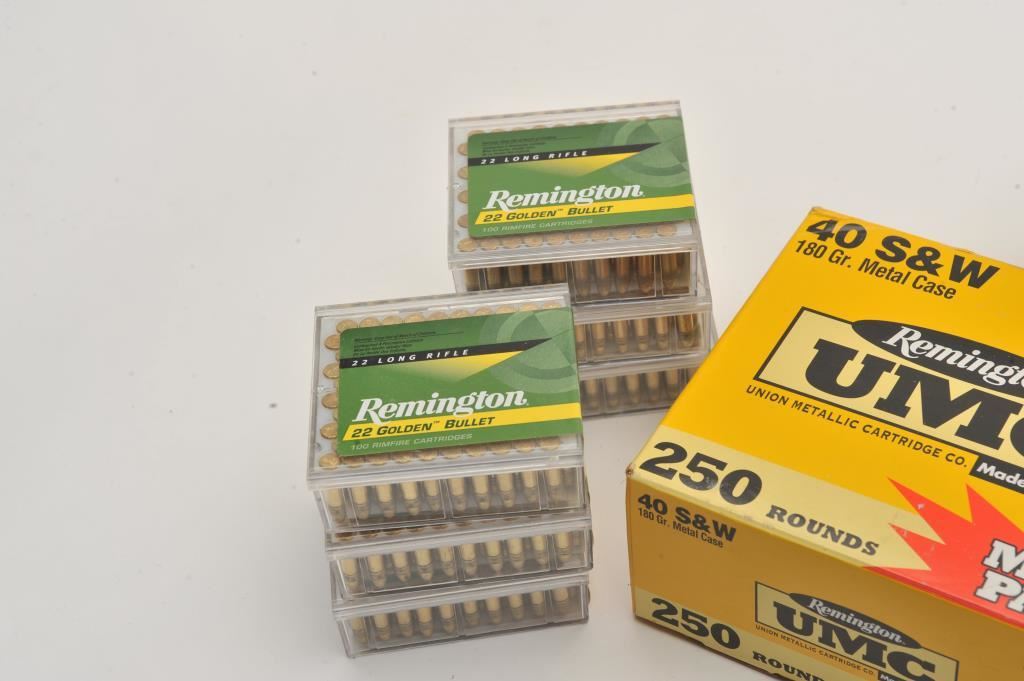 Bonanza lot of ammunition. The lot includes 450 rounds of primarily Remington .40 S&W, 300 rounds of Winchester 9mm cartridges and 2,000 rounds of Remington Golden Bullet .22 Long Rifle ammunition. All of the ammunition is factory fresh in its original packaging. A bonanza lot of ammo ready for the range. Est.: $200-$400.