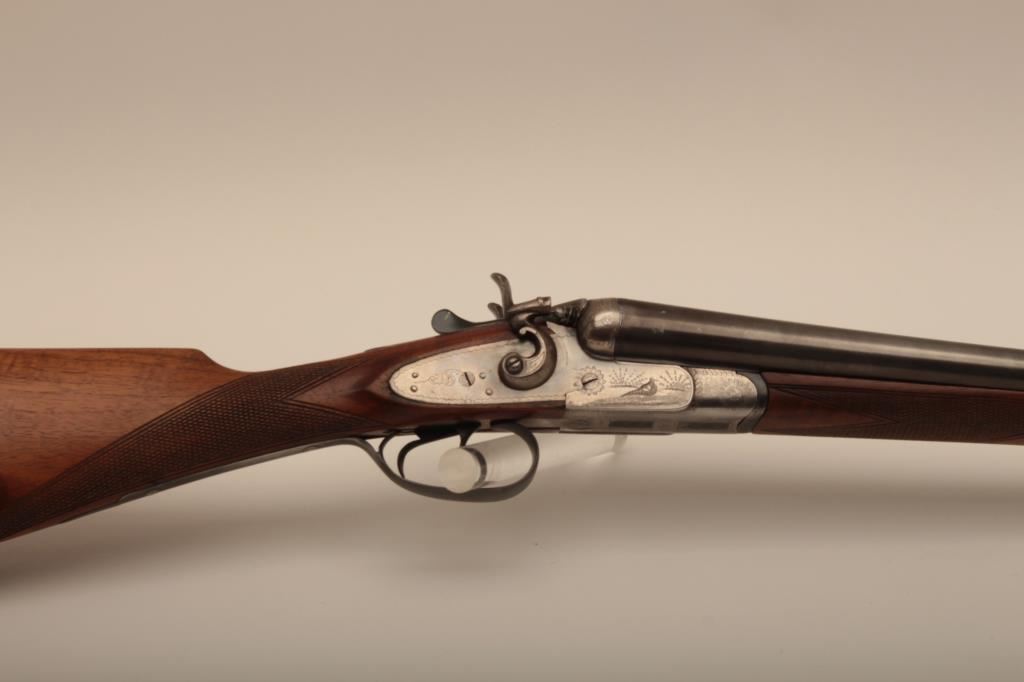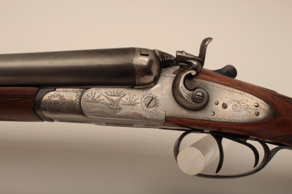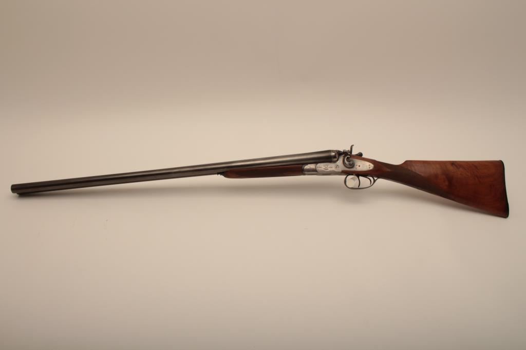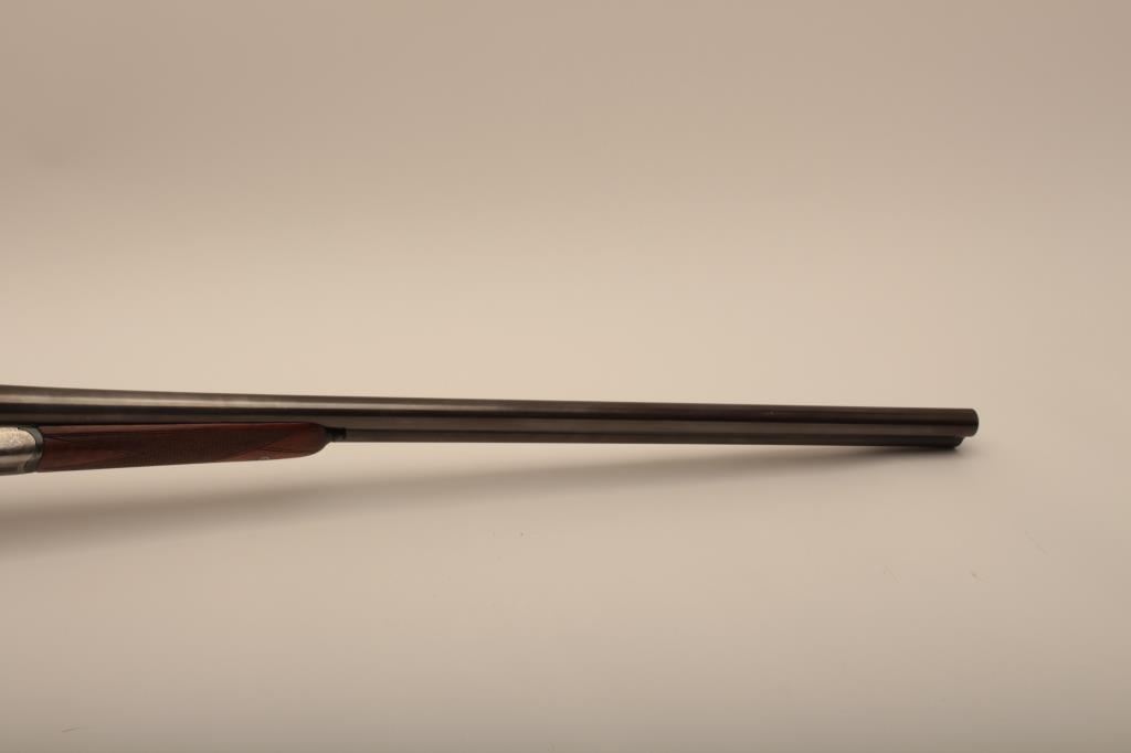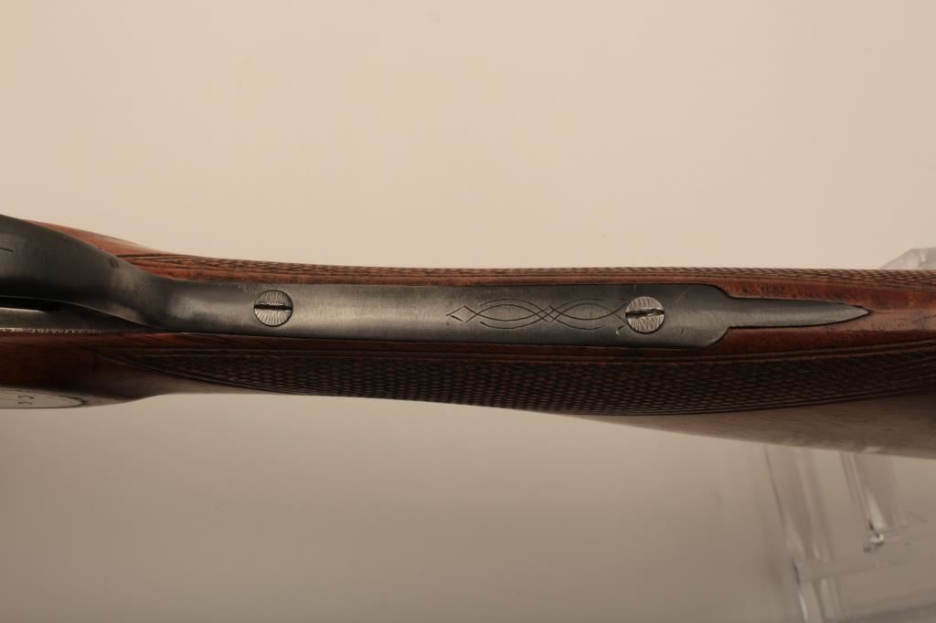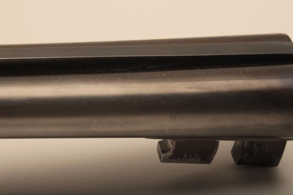 I. Marco Brescia Italy marked 12GA SxS shotgun with vikers steel, Sheffield marked barrels, exposed hammers, double triggers, standard extractors, and English style straight stock, S/N 6167. Interesting Greener cross bolt and dolls head locking mechanism. The barrels measures 27 ¾” and choked full and full. 50%-70% thinning blue on the barrels with one thumbprint 9” down on the left barrel from action. Satin gray frame is very good. The stocks are very good with hair line crack just starting behind the left lock plate. Locks tight with good bores. An interesting gun we would date shortly after WWII to 1970s before Brescia re-emerged as gun making center and British steel was sought after. Est.: $600-$1200