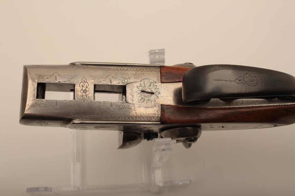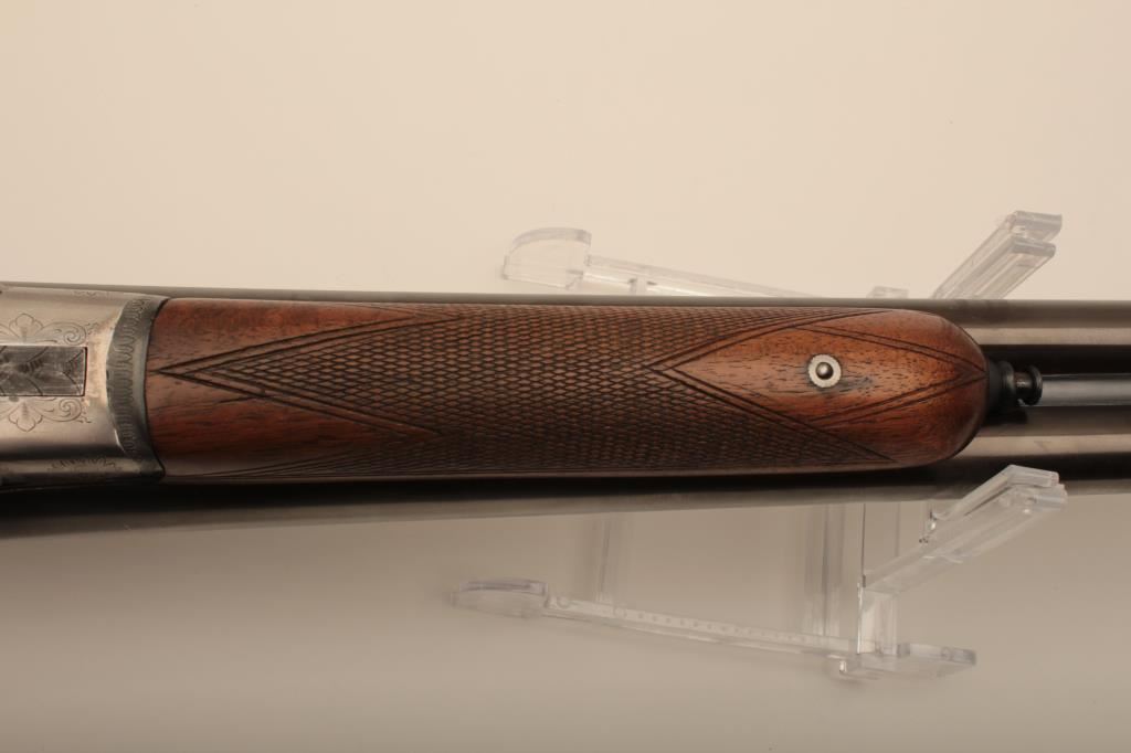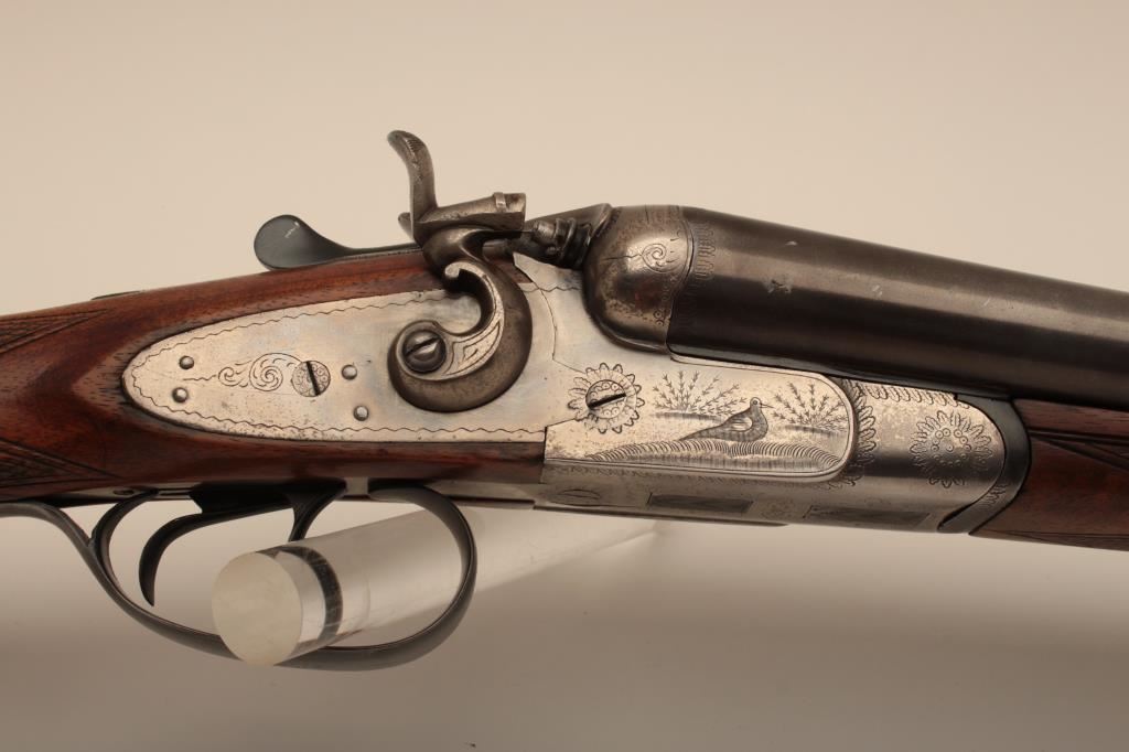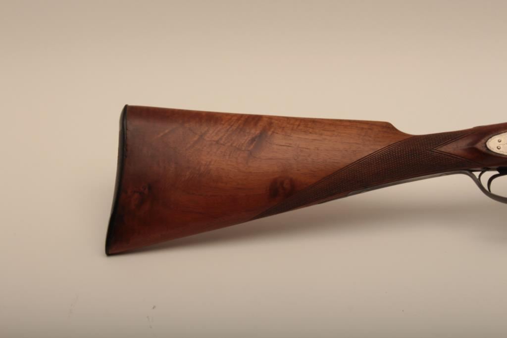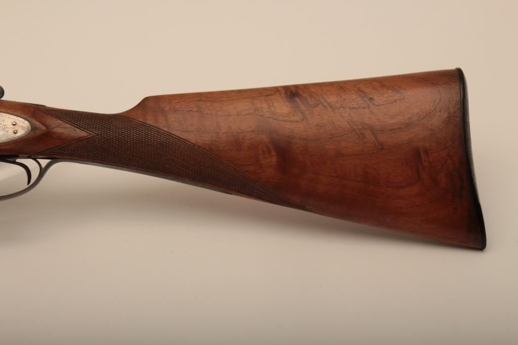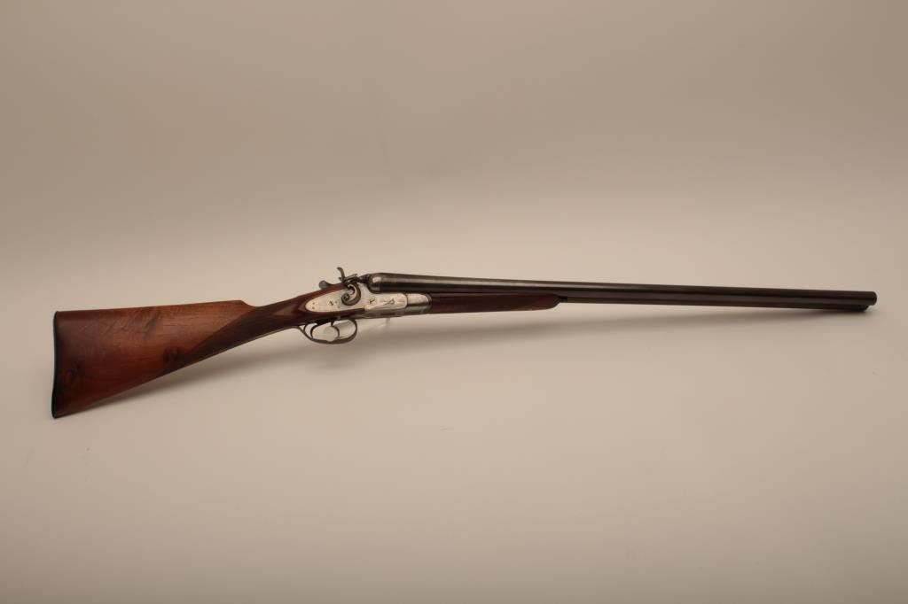 I. Marco Brescia Italy marked 12GA SxS shotgun with vikers steel, Sheffield marked barrels, exposed hammers, double triggers, standard extractors, and English style straight stock, S/N 6167. Interesting Greener cross bolt and dolls head locking mechanism. The barrels measures 27 ¾” and choked full and full. 50%-70% thinning blue on the barrels with one thumbprint 9” down on the left barrel from action. Satin gray frame is very good. The stocks are very good with hair line crack just starting behind the left lock plate. Locks tight with good bores. An interesting gun we would date shortly after WWII to 1970s before Brescia re-emerged as gun making center and British steel was sought after. Est.: $600-$1200
