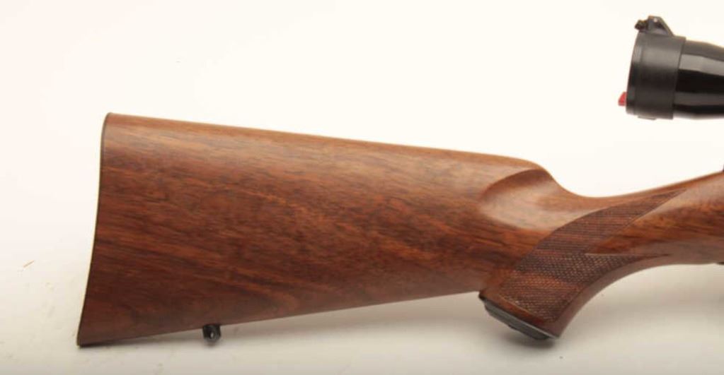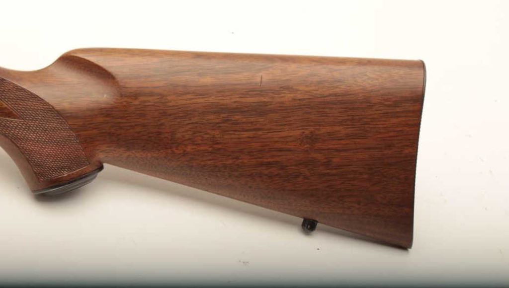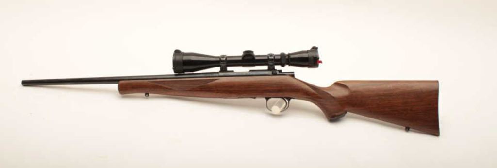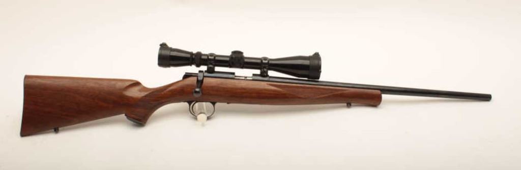 Kimber Model 82 bolt action rifle, .22 Long Rifle caliber, Serial #53474. The rifle is in fine overall condition with a 19” barrel, marked, “Kimber of Oregon”. The metal surfaces retain nearly all of their blue finish with light wear at the muzzle. The checkered wood stock is in very good condition with small mars and compressions from carry and use. The butt stock ends with a checkered steel butt plate. The rifle is topped with a Leupold Vari-X II 3 x 9 variable power rifle scope with clear, crisp optics. The bore is good, the action is crisp and the markings are sharp on this desirable sporter by Kimber of Oregon. The lot includes three correct magazines. Est.: $600-$1,200. (Modern).