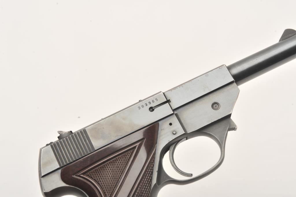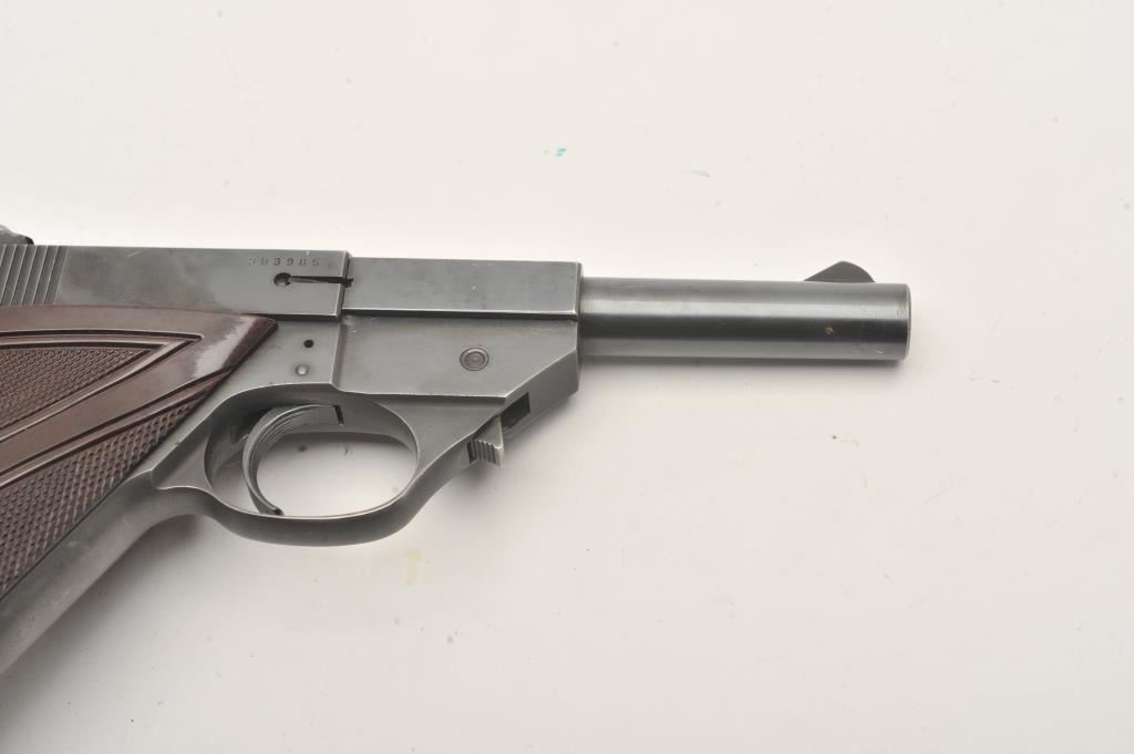 Hi-Standard Sport King, #383985, .22 LR cal., 4 1/2" barrel, blued finish, fixed sights, with checkered plastic grips. Pistol is in very good plus condition overall, showing 95%+ original finish, thinning slightly at the muzzle and high points. Some very mild erosion starting. The grips are very good plus with no chips or cracks. The bore and action are very good. Includes one correct mag. (C&R / PPT) Est. $300-600