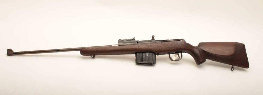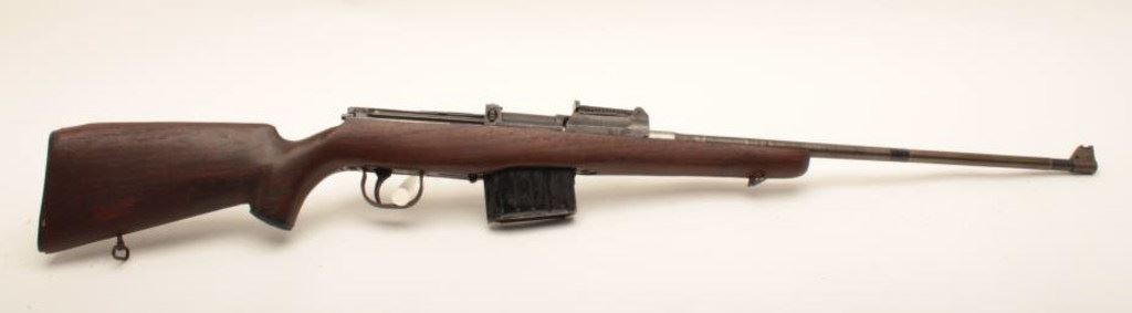 German Model G43 semi-automatic rifle, 8 x 57 caliber, Serial #7907b. The rifle is in fair overall condition with a 24” barrel with a ramped front and military tangent style rear sights. The barrel has been stripped down in an attempt to sporterize the rifle but retains a faint Nazi proof on the left side. The receiver retains a significant amount of its military finish with numerous German proofs and Nazi markings. The action is missing parts and should be inspected by a competent gunsmith. The smooth wood stock is a replacement with an exaggerated cheek piece and plastic butt plate. The bore is fair, the action is non-functioning and the markings are sharp. A scarce WWII era German battle rifle in need of some restoration. The lot includes one correct magazine. Est.: $300-$600. (C+R).