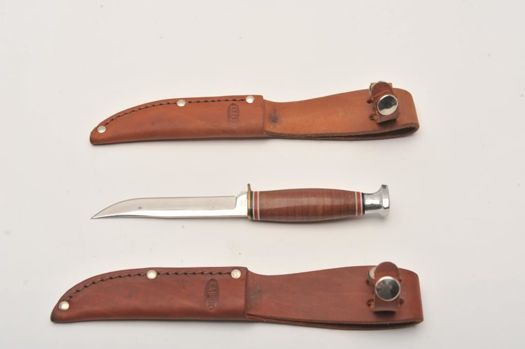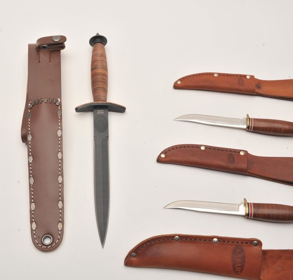 Lot of four fixed blade knives including two KA-BAR 02-1226 knives with stacked leather handles and leather scabbards, a KA-BAR 1233 Skinner with leather scabbard and a United Cutlery V-42 Stiletto. All four are new in the factory boxes. Est.: $125-$250.