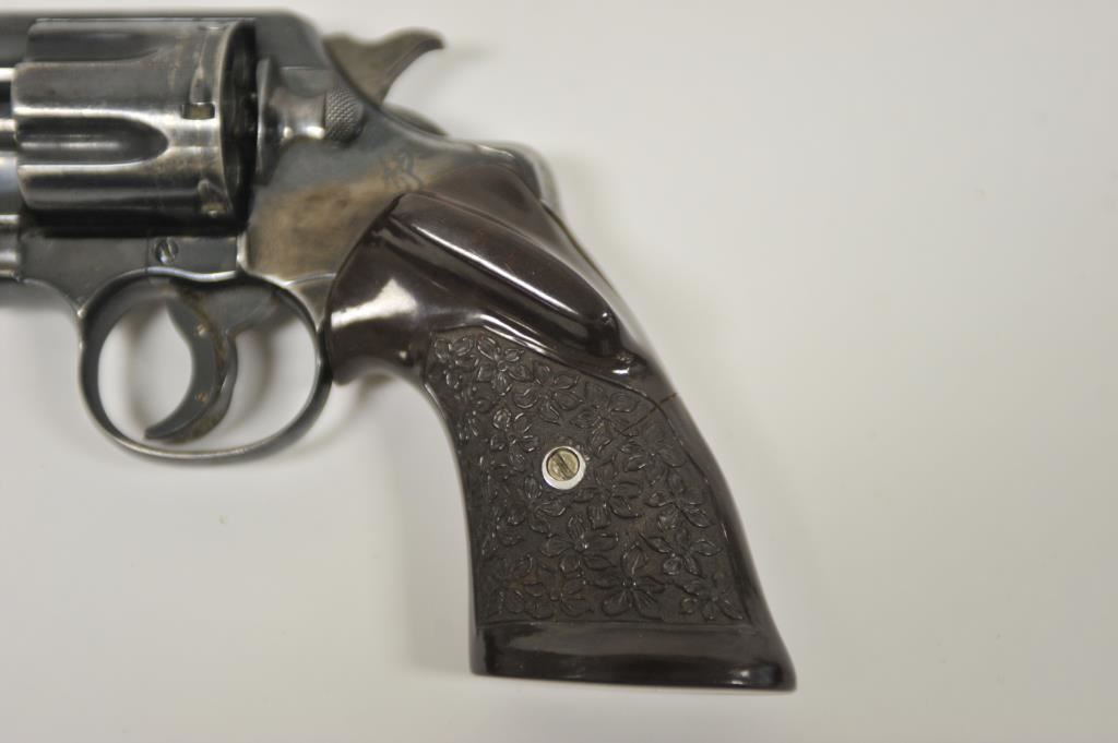 Colt Army Special, #505578, .38 cal, 5" barrel, blued finish, trigger shoe, with target thumb rest grips. Revolver is in fair condition overall, as refinished, good bore, action functions, cylinder does not stay shut. Front sight has been reshaped, crack in left grip panel. (C&R / PPT) Est. $175-350