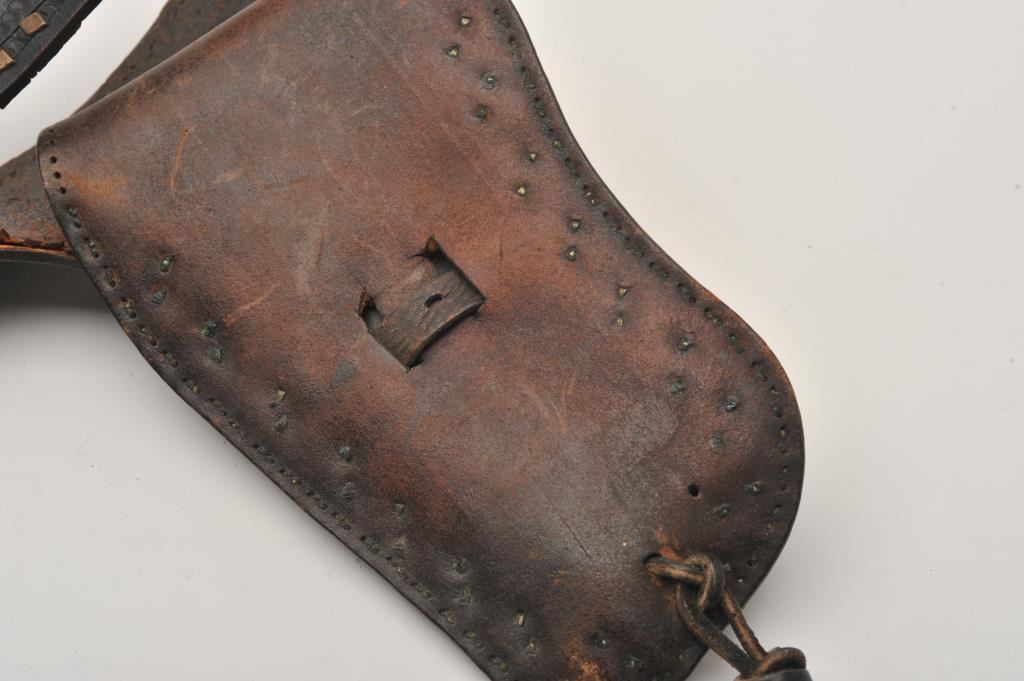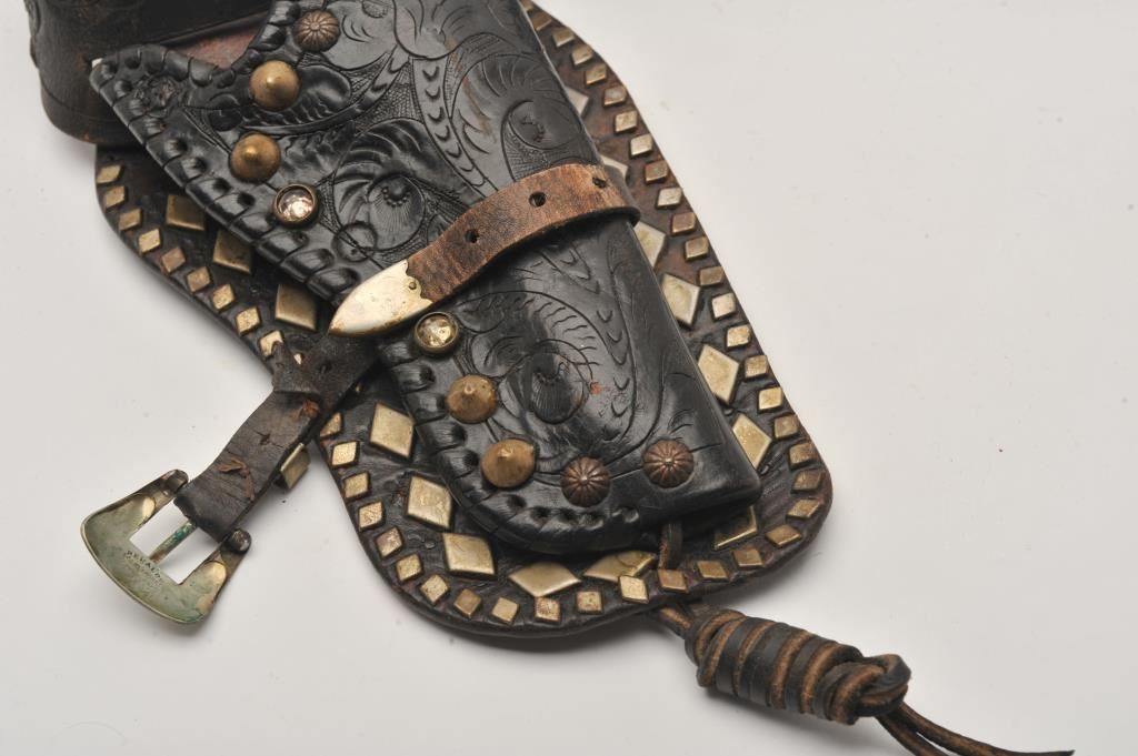 Rinalde solid nickel/Denver, Colo.-marked buckle on carved leather holster and belt, fancied-up with studs and decorations; out of RKO Movie studio according to our consignor; ca. 1950’s. Est.: $300-$600.