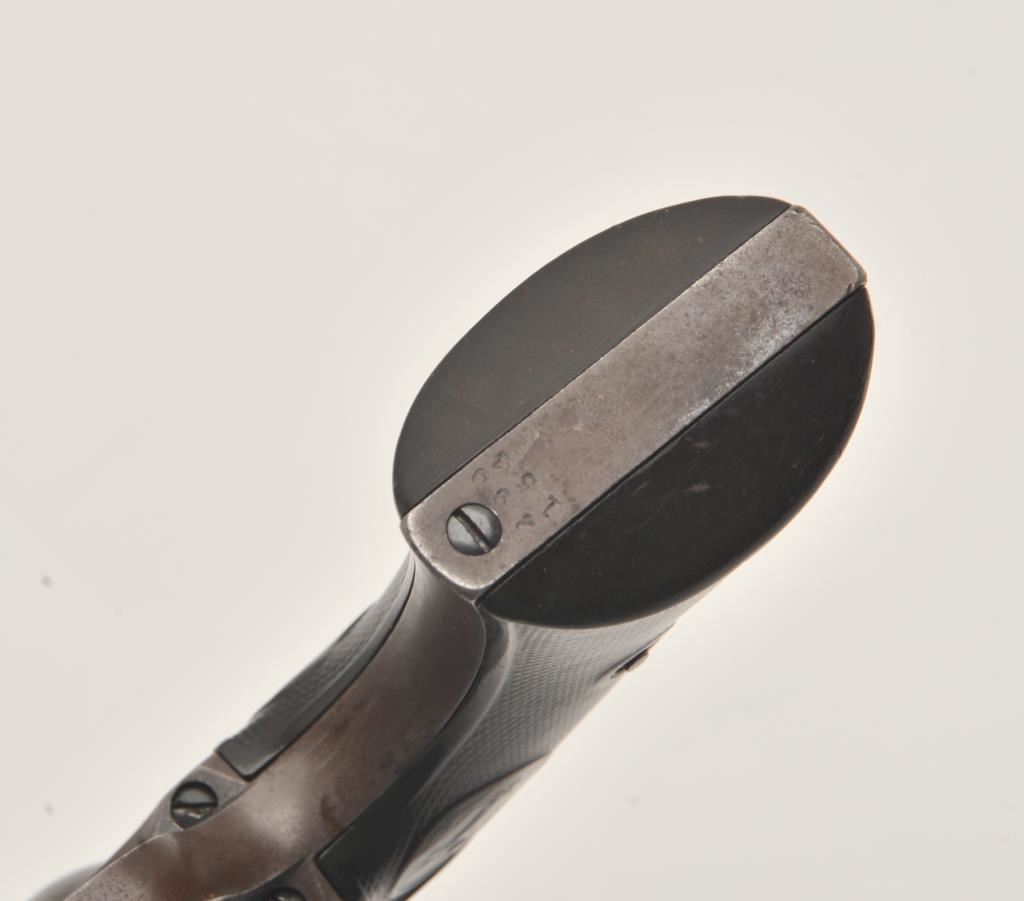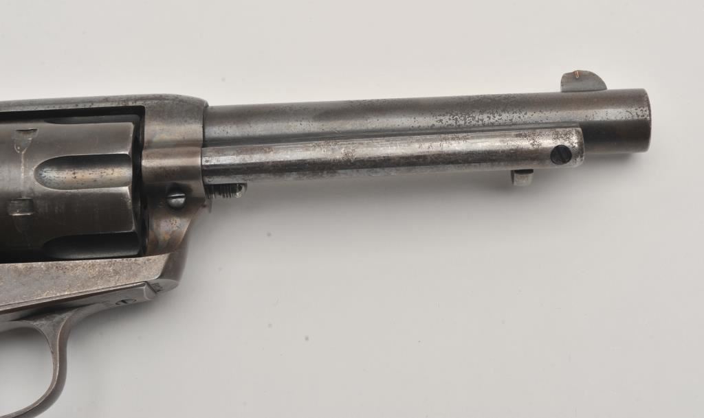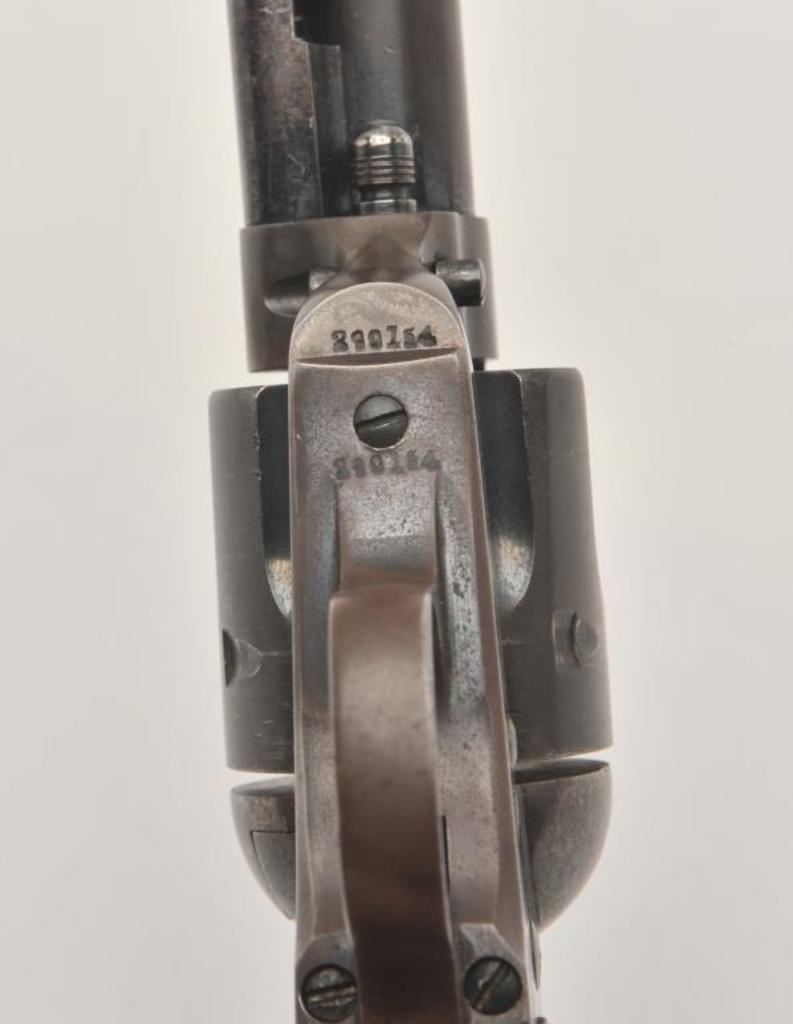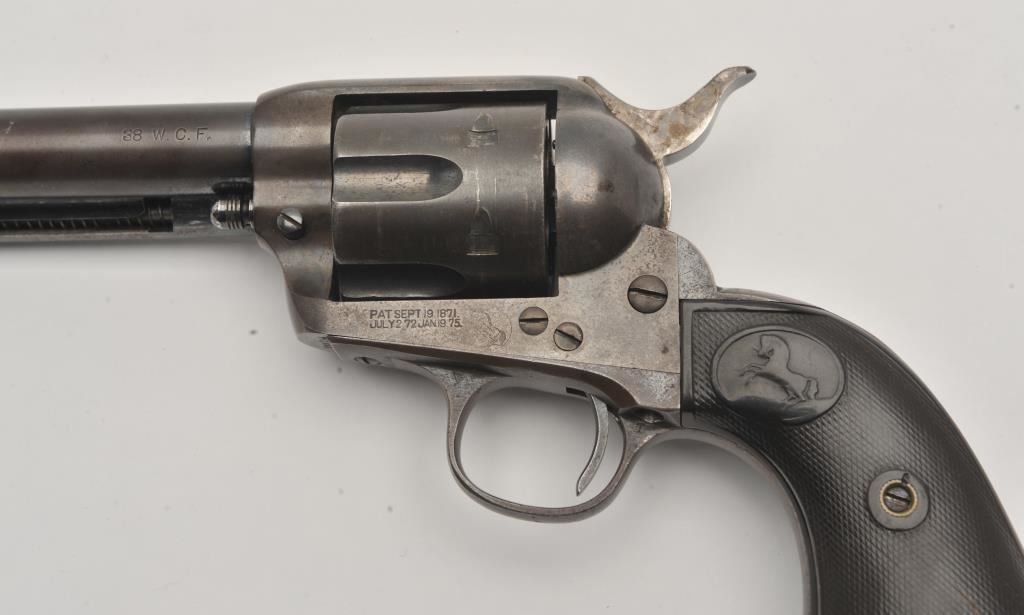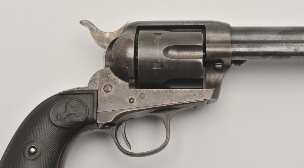 Colt SAA revolver, .38 W.C.F. caliber, 5.5” barrel, blued and case hardened finish, checkered hard rubber grips, S/N 290154; overall good + condition with some original blued finish remaining in protected areas, balance of finish gone to a pleasing plum brown patina, good bore, crisp action, sharp markings and overall good grips. (C&R/PPT). Est.: $1,500-$3,000.