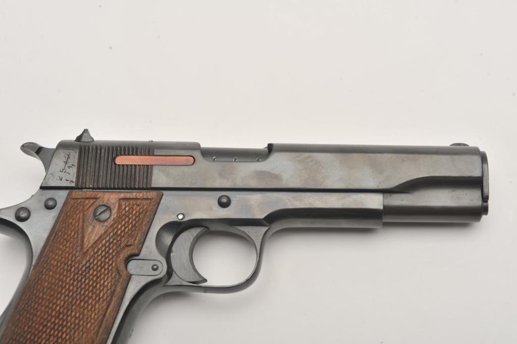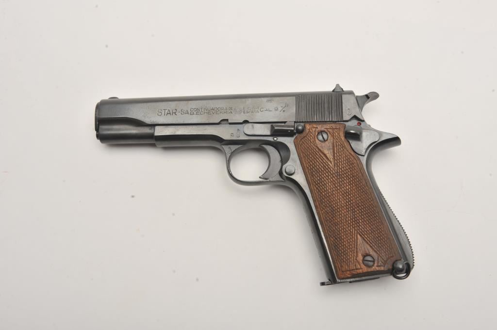 Star Model B semi-automatic pistol, 9mm caliber, Serial #236124. The pistol is in good overall condition with a 5” barrel. The pistol retains the majority on an old re-blued finish. The frame has multiple proof marks on the left side. The checkered wood grips are in good condition with dents, mars and the lanyard ring is retained at the base of the left panel. The bore is good, the action functions and the markings are legible. The lot includes one correct magazine. Est.: $200-$400. (C+R/PPT).