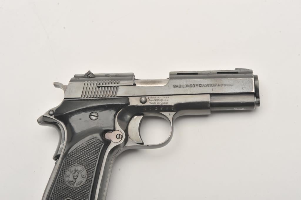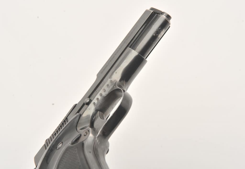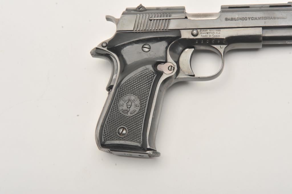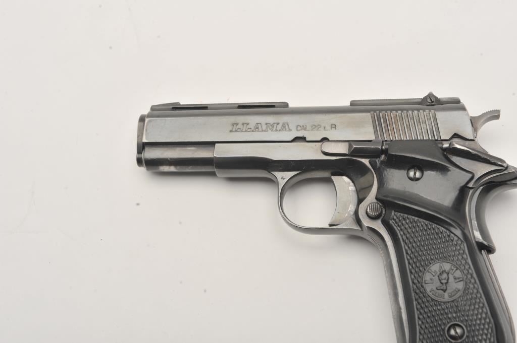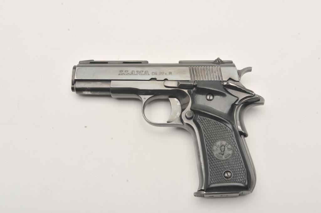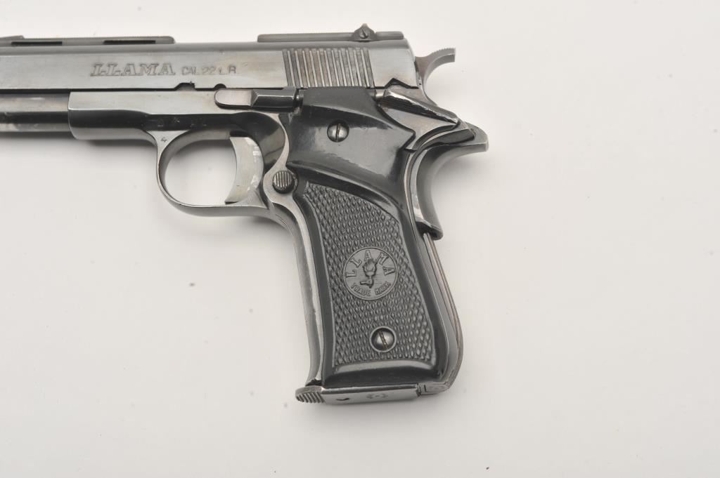 Llama Model XV semi-automatic pistol, .22 Long Rifle caliber, Serial #990528. The pistol is in very good overall condition with a 3 ½” barrel with a ventilated rib. The pistol retains the majority of its blue finish with holster wear at the muzzle. The left side of the frame has several proof marks while the right side is import marked. The checkered plastic Llama marked grips are in good condition with small mars from carry and use. The bore is good, the action functions and the markings are sharp. The lot includes one correct magazine. Est.: $200-$400. (Modern/PPT).