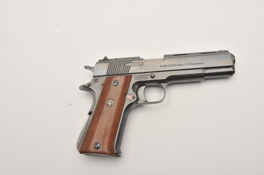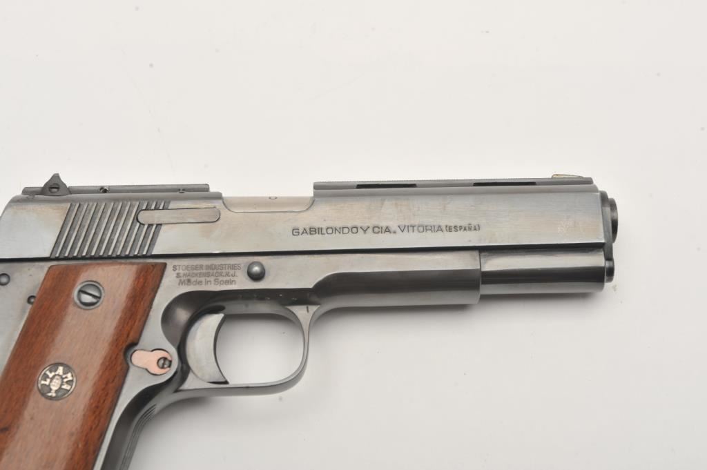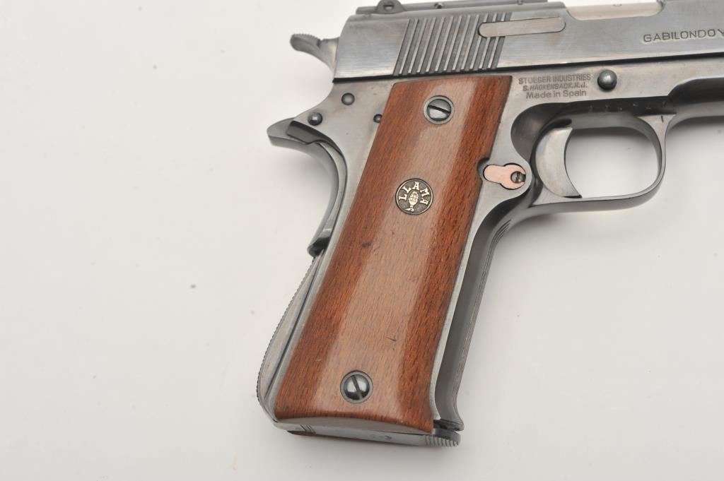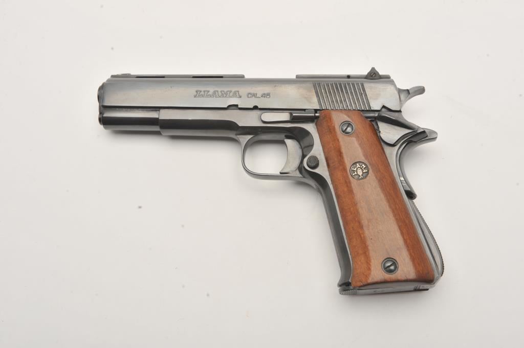 Llama Model IX-A semi-automatic pistol, .45 caliber, Serial #994741. The pistol is in very good overall condition with a 5” barrel with a ventilated rib. The pistol retains the majority of its blue finish with small mars and handling marks. The left side of the frame has several proofs while the right side is import marked. The smooth wood medallion grips are in very good condition with light compressions and storage marks. The bore is good, the action is crisp and the markings are sharp. The lot includes one correct magazine. Est.: $300-$600. (Modern/PPT).