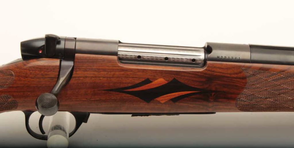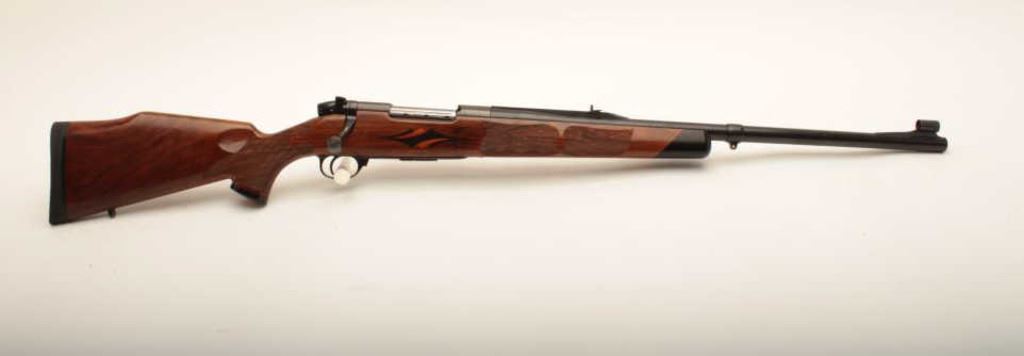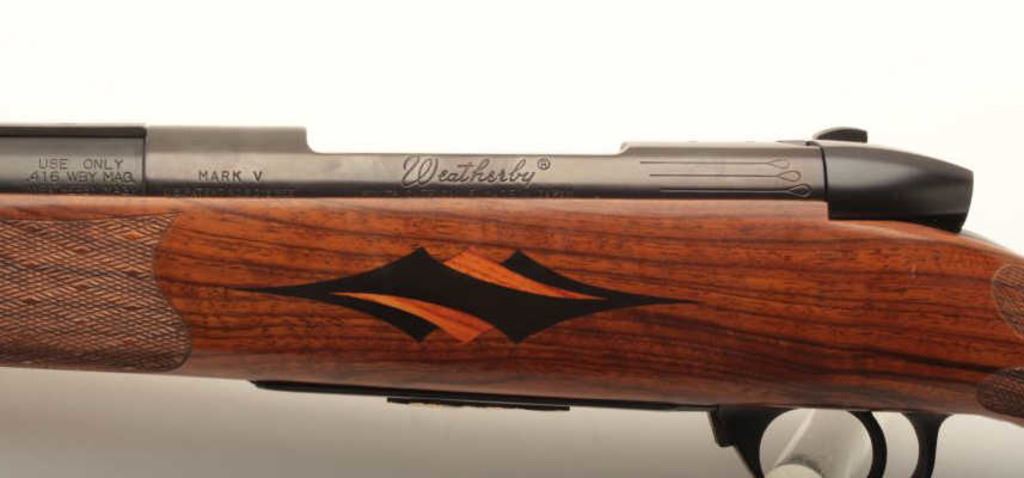 Custom Weatherby MK V bolt action rifle, .416 Weatherby caliber, Serial #H221341. The rifle is in fine overall condition with a 24” barrel. The barrel and receiver retain nearly all of their blue finish with a hooded blade front sight, barrel band swivel, quarter rib and two-leaf folding rear sight. The receiver has been drilled and tapped for scope mounting and is marked, “SOUTH GATE CALIF. MADE IN JAPAN”. Additionally, the rifle features a jeweled bolt and magazine follower. The finely checkered Walnut stock features ebony fore end and pistol grip, with custom fleur de lis checkering and inlay. A stylized gold tone escutcheon plate reading, “CEC” has been added at the fore end and a gold tone tiger embossed on the magazine plate. The butt stock shows beautiful figure and ends with a solid rubber recoil pad providing a 14” LOP. The bore is good, the action crisp and markings are sharp on this fine custom Weatherby by Gary Johnson. The lot includes a set of RCBS reloading dies. Est.: $1,500-$3,000. (Modern).