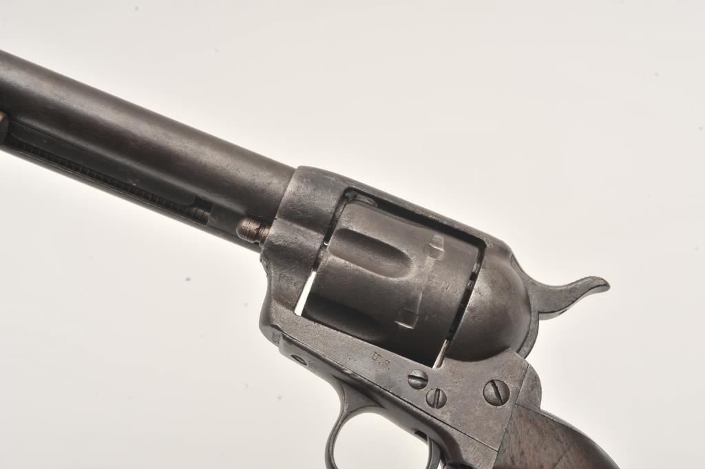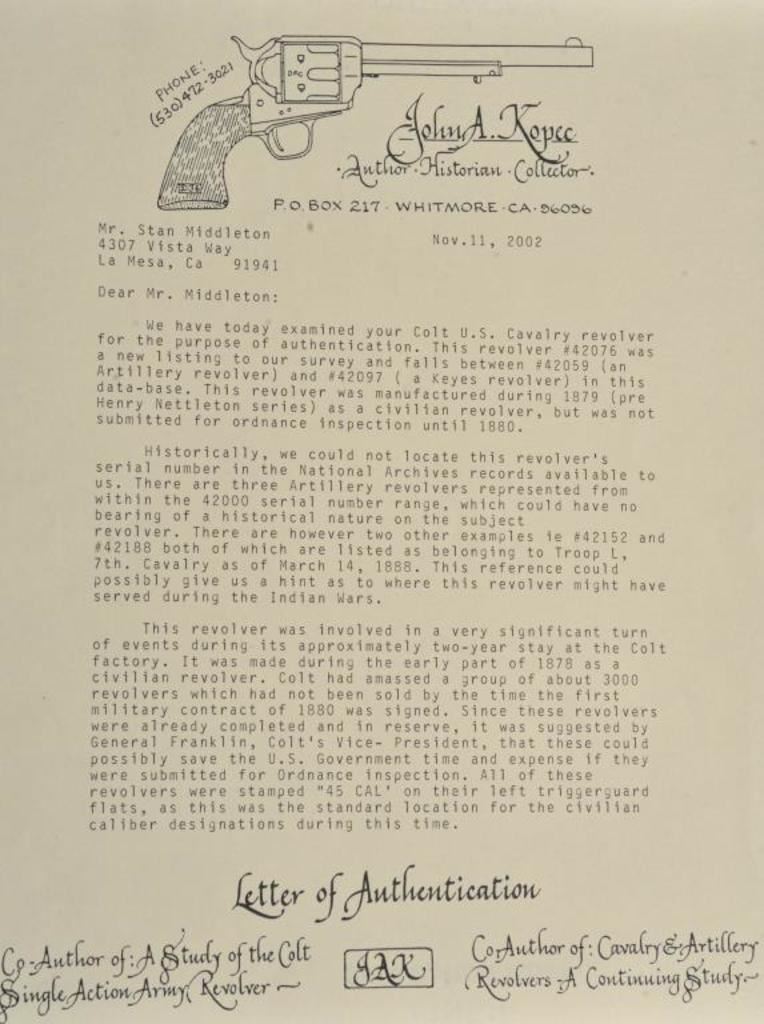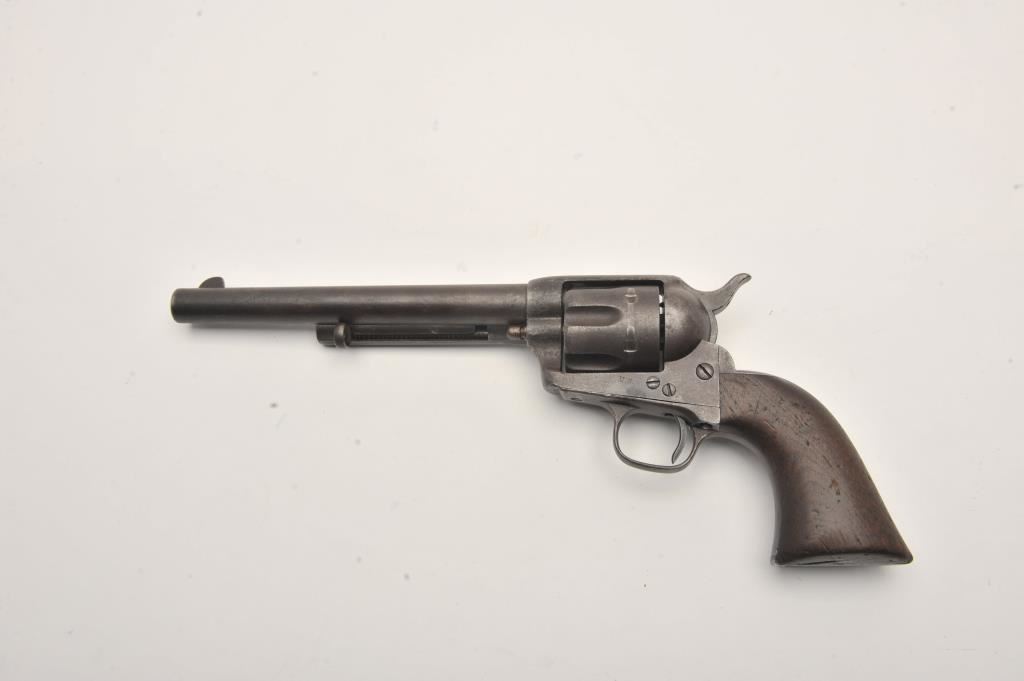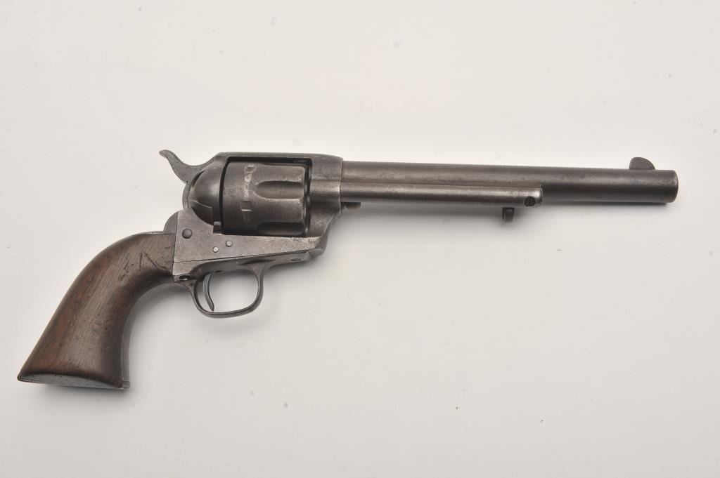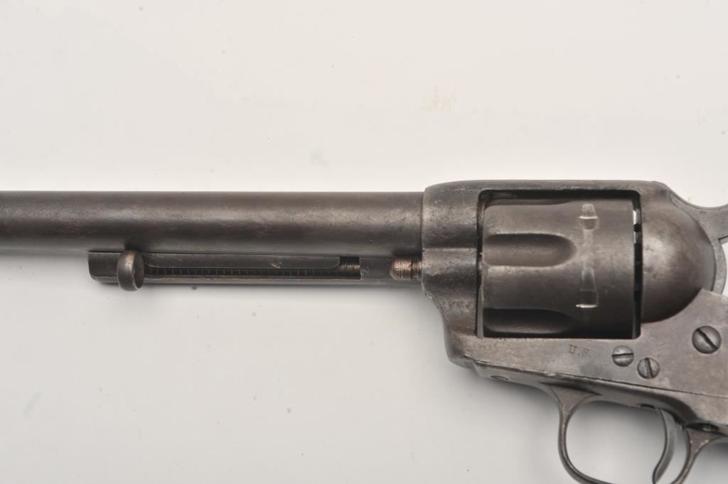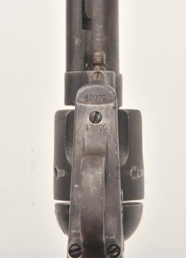 Colt U.S. Cavalry SAA revolver, .45 caliber, 7.5” barrel, dark patina, wood grips, S/N 42076 (NOTE: barrel numbered 1690 and D.F.C.-inspected; see Lot 884 with barrel also factory-numbered 1690); overall good to very good condition with dark patina and scattered light pitting to surfaces, good bore, crisp action, good markings including reverse direction barrel address and overall good grips without visible inspector cartouche from handling and wear. Included with this interesting Cavalry Model are several documents; first is a typed letter dated May 9, 2002, signed by Frederic L. Hulburd indicating this gun, by serial number was acquired by his father, Bud Hulburd around 1919 when he was the engineer on the 110-foot schooner owned by the well-known newspaper baron, E.W. Scripps (schooner named “Kemah”). Bud told Frederic the Colt had belonged to an infamous bandit (that was hung in Florida) prior to his acquisition. Also noted in the letter is that Bud was with Warner Brothers Studios for more than 30 years in the Special Effects Department with