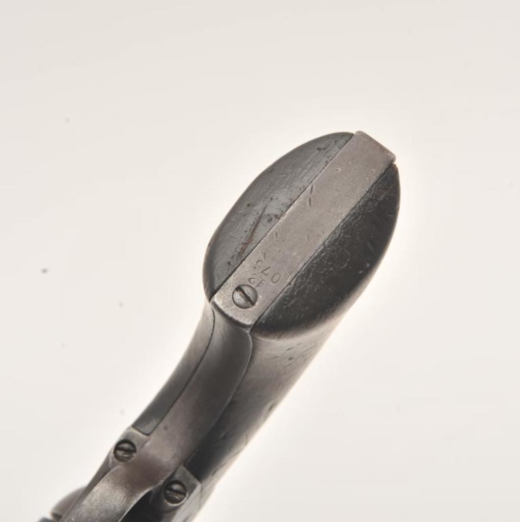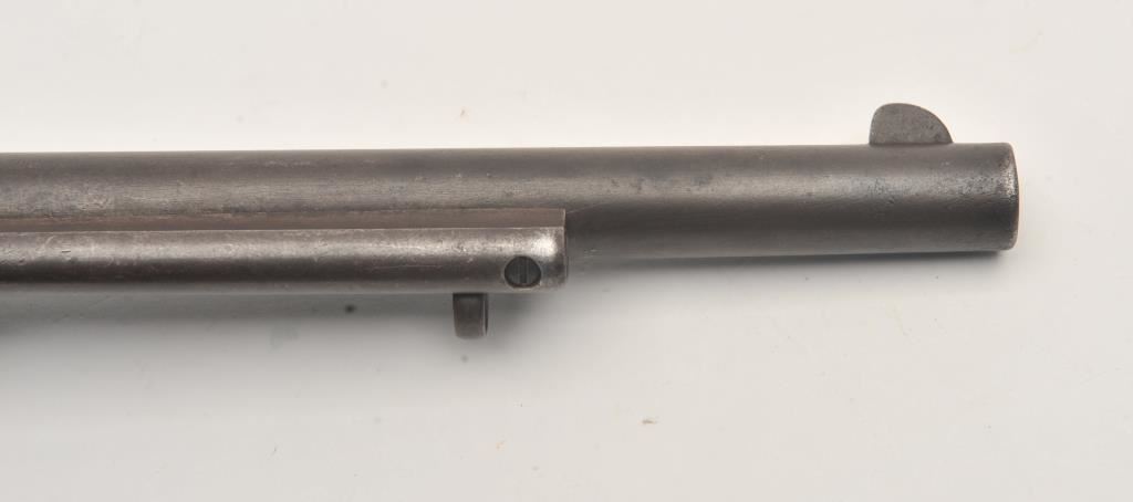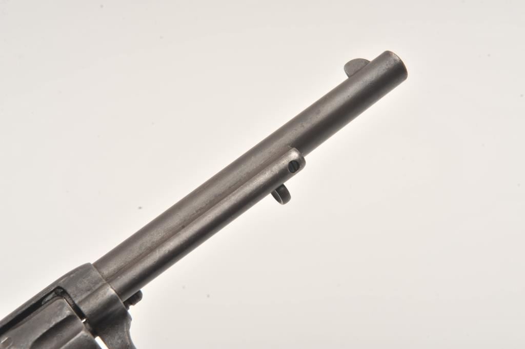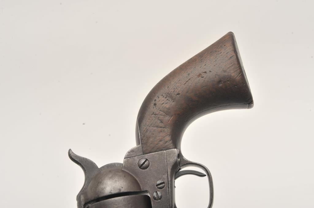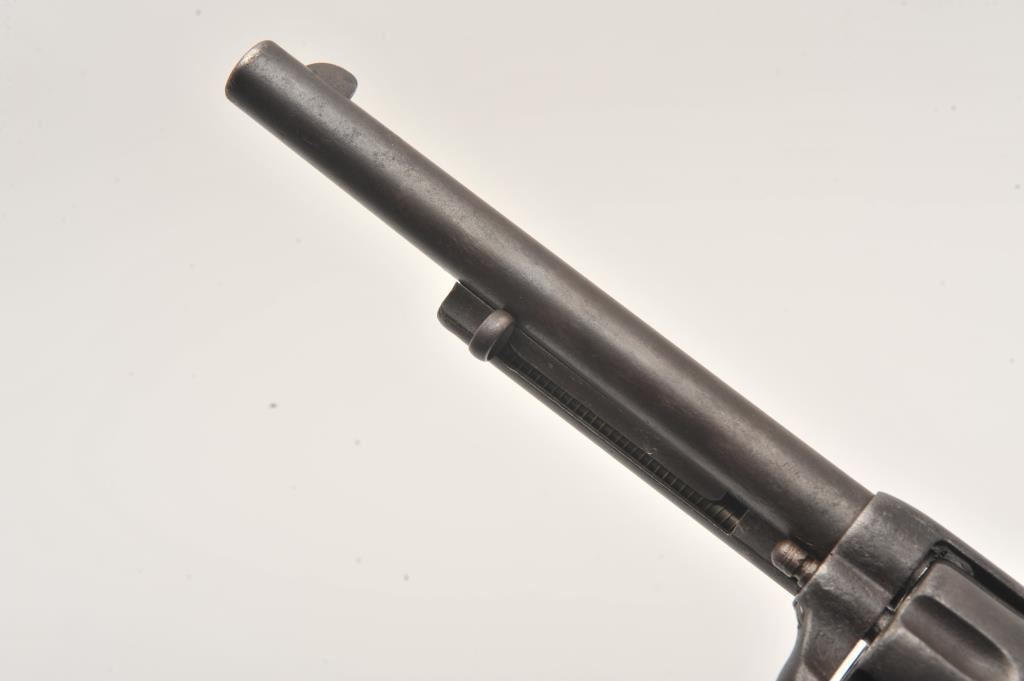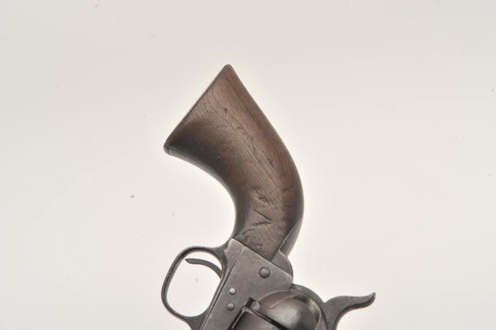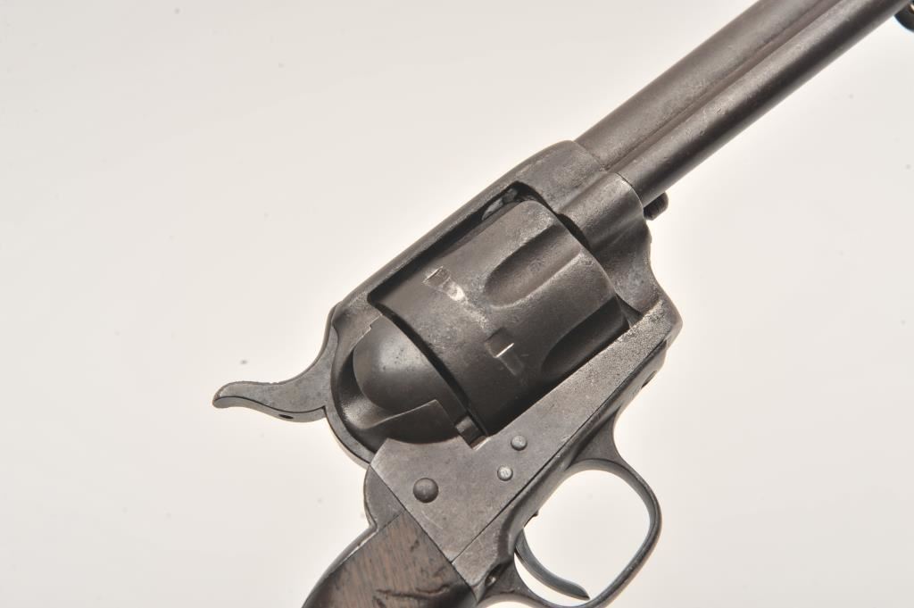 Colt U.S. Cavalry SAA revolver, .45 caliber, 7.5” barrel, dark patina, wood grips, S/N 42076 (NOTE: barrel numbered 1690 and D.F.C.-inspected; see Lot 884 with barrel also factory-numbered 1690); overall good to very good condition with dark patina and scattered light pitting to surfaces, good bore, crisp action, good markings including reverse direction barrel address and overall good grips without visible inspector cartouche from handling and wear. Included with this interesting Cavalry Model are several documents; first is a typed letter dated May 9, 2002, signed by Frederic L. Hulburd indicating this gun, by serial number was acquired by his father, Bud Hulburd around 1919 when he was the engineer on the 110-foot schooner owned by the well-known newspaper baron, E.W. Scripps (schooner named “Kemah”). Bud told Frederic the Colt had belonged to an infamous bandit (that was hung in Florida) prior to his acquisition. Also noted in the letter is that Bud was with Warner Brothers Studios for more than 30 years in the Special Effects Department with