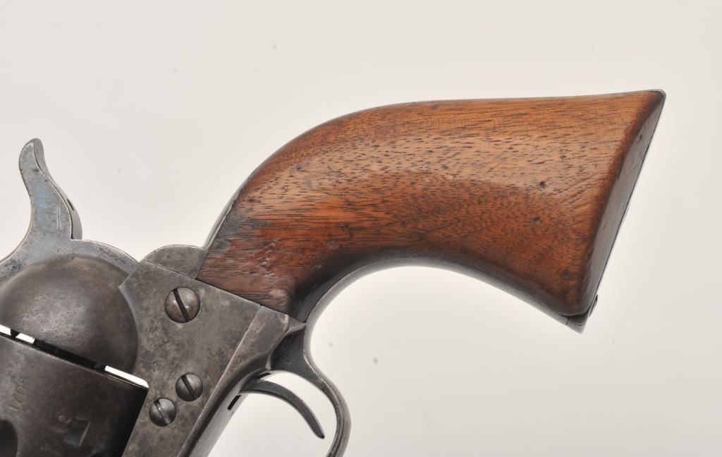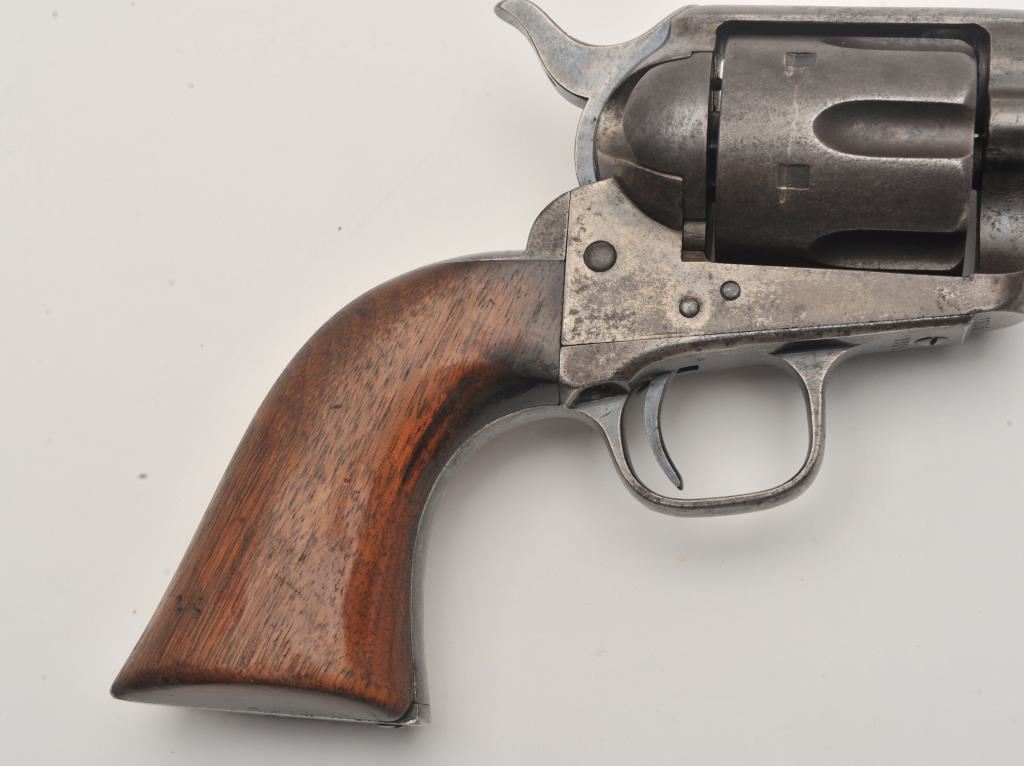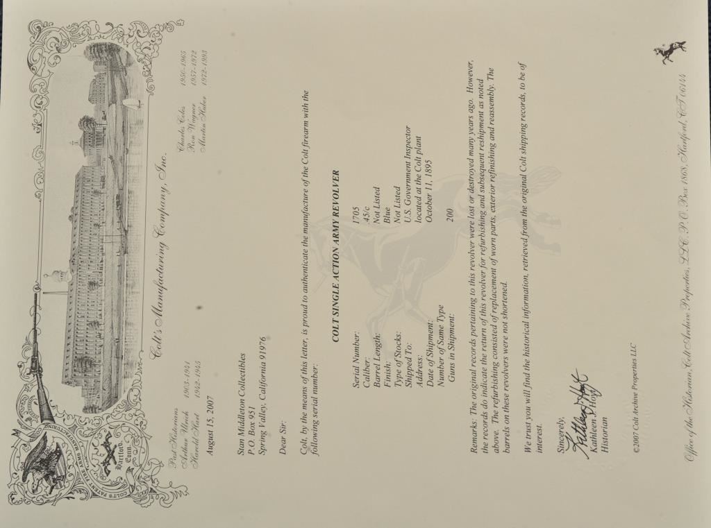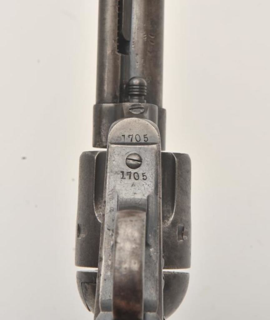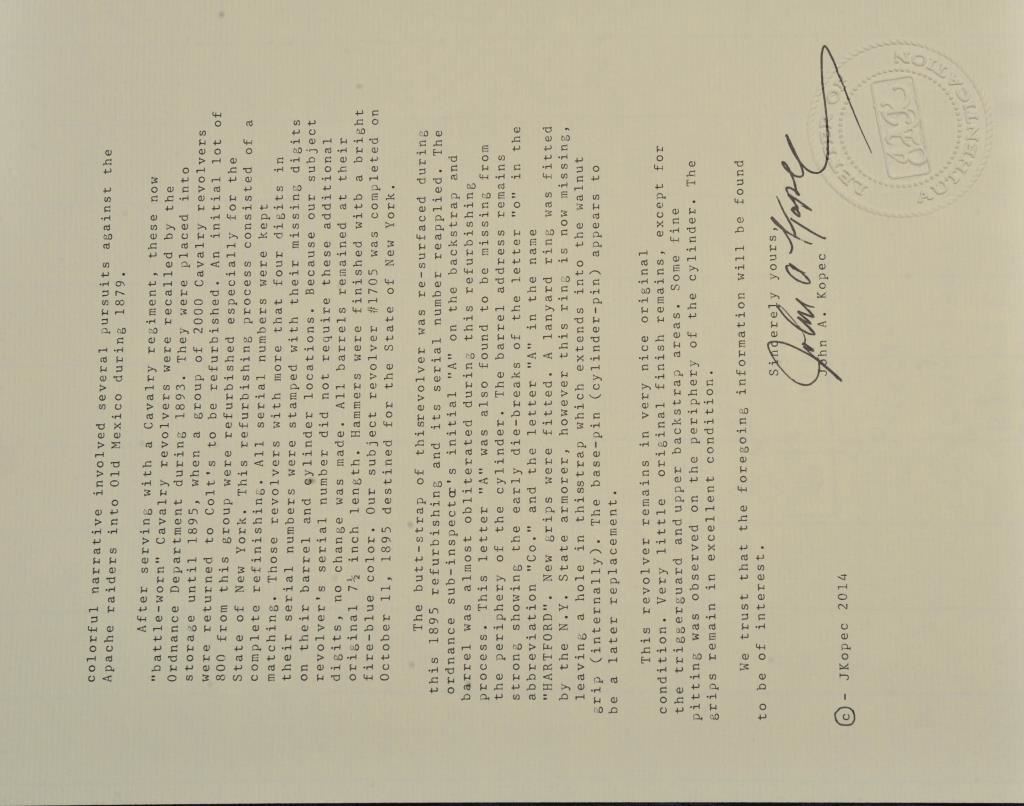 Colt U.S. Cavalry SAA revolver, .45 caliber, 7.5” barrel, dark patina, wood grips, S/N 1705; overall good to very good condition with pleasing dark patina to metal surfaces, very good bore, crisp action, sharp markings and good grips; butt strap shows center hole for lanyard ring base. Accompanied by a Colt factory letter confirming caliber and finish with barrel length and type of stocks “Not Listed”; shipped to the U.S. Government Inspector located at the Colt plant on October 11, 1895, 200 guns in shipment; under Remarks, indication is the original records pertaining to this revolver were lost or destroyed many years ago however, the records do indicate the return of this revolver for refurbishing and subsequent reshipment as noted above. Additionally, there is a Kopec letter that covers interesting information on his findings that several guns in this serial number range were in his data base and were related to the 6th Cavalry that was stationed at Fort Gibson and Camp Supply, Indian Territory with heavy engagements in many Indian battles during the early years in