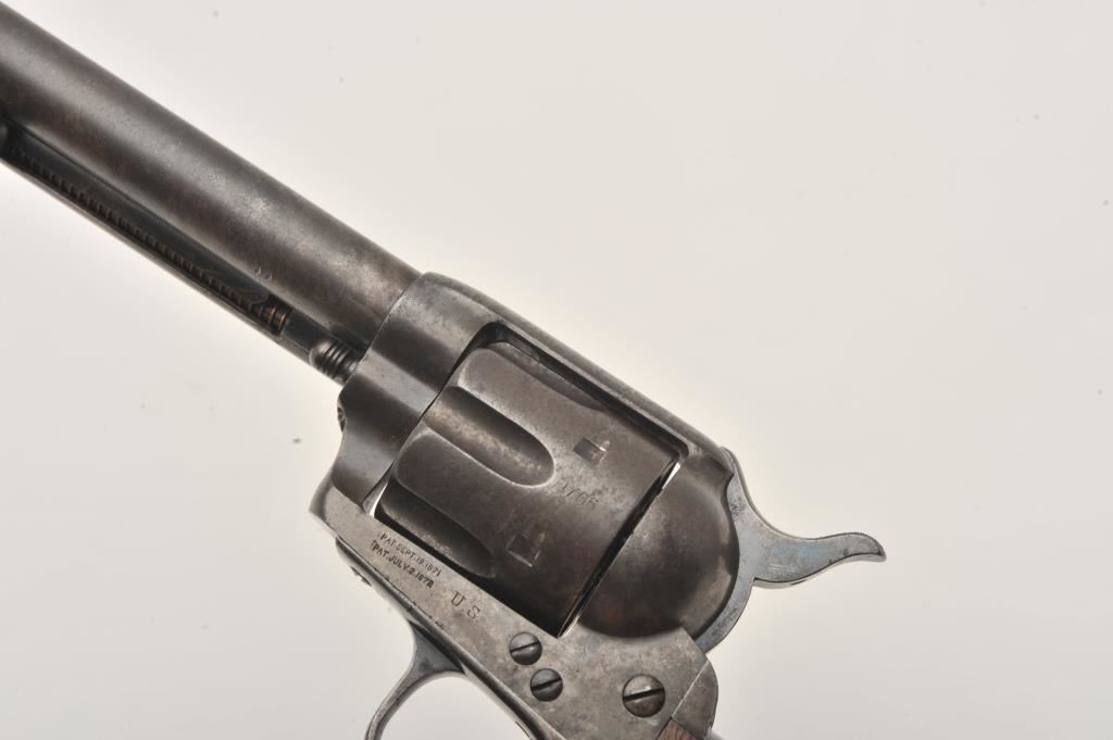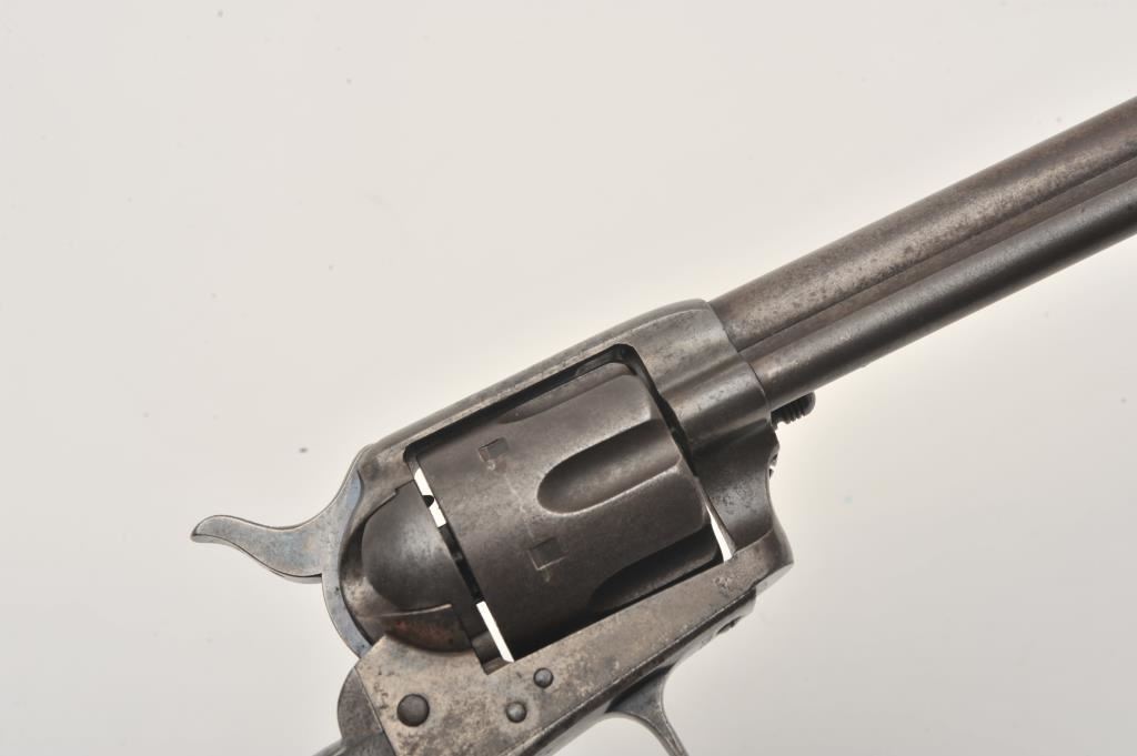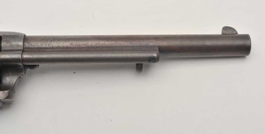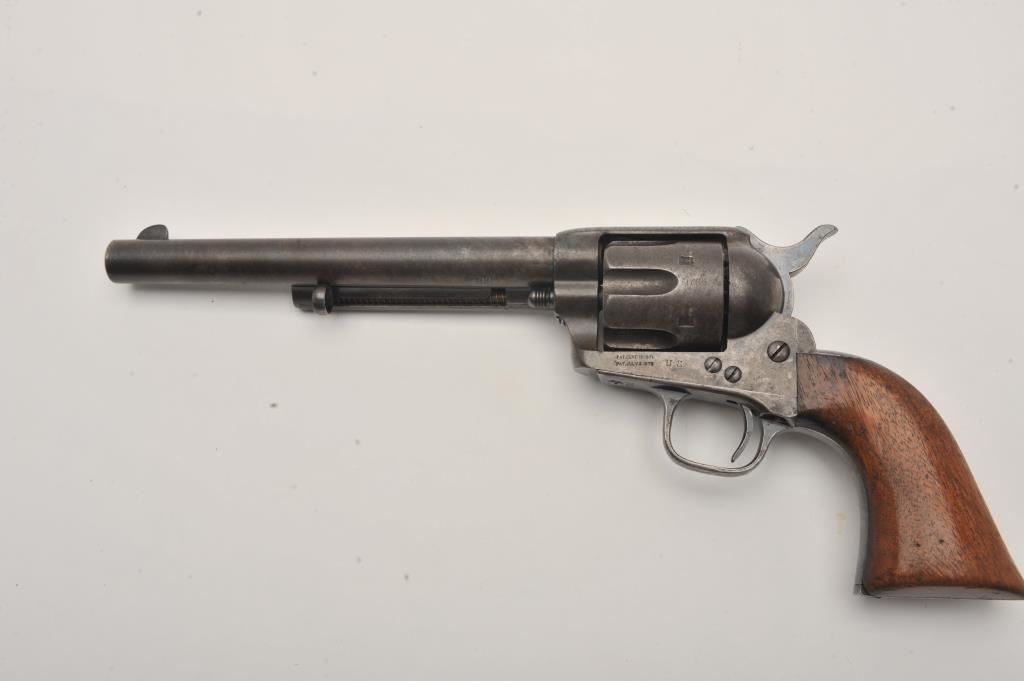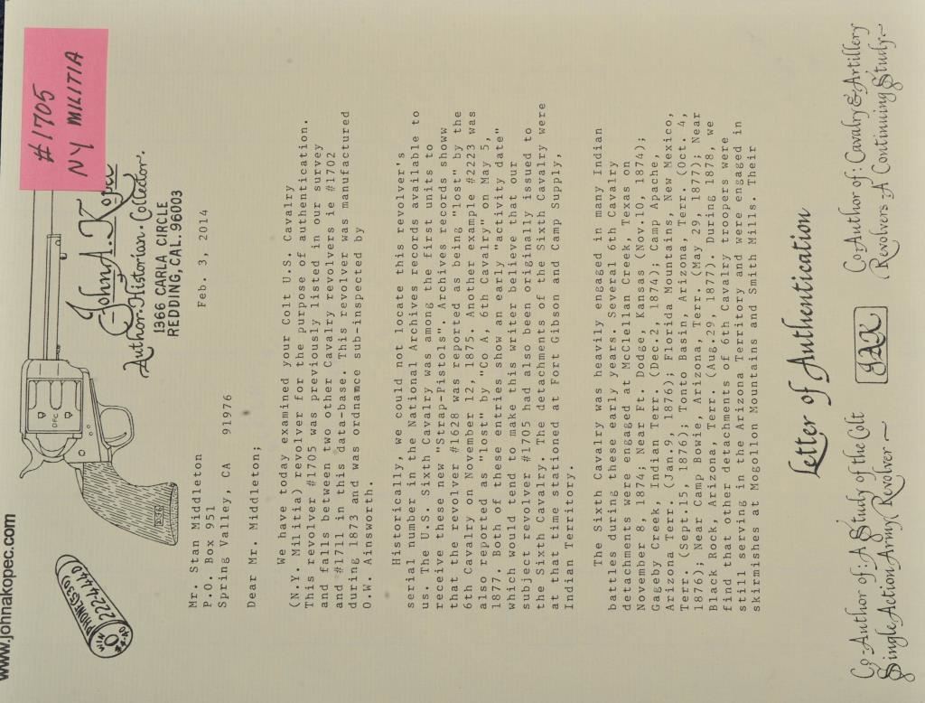 Colt U.S. Cavalry SAA revolver, .45 caliber, 7.5” barrel, dark patina, wood grips, S/N 1705; overall good to very good condition with pleasing dark patina to metal surfaces, very good bore, crisp action, sharp markings and good grips; butt strap shows center hole for lanyard ring base. Accompanied by a Colt factory letter confirming caliber and finish with barrel length and type of stocks “Not Listed”; shipped to the U.S. Government Inspector located at the Colt plant on October 11, 1895, 200 guns in shipment; under Remarks, indication is the original records pertaining to this revolver were lost or destroyed many years ago however, the records do indicate the return of this revolver for refurbishing and subsequent reshipment as noted above. Additionally, there is a Kopec letter that covers interesting information on his findings that several guns in this serial number range were in his data base and were related to the 6th Cavalry that was stationed at Fort Gibson and Camp Supply, Indian Territory with heavy engagements in many Indian battles during the early years in