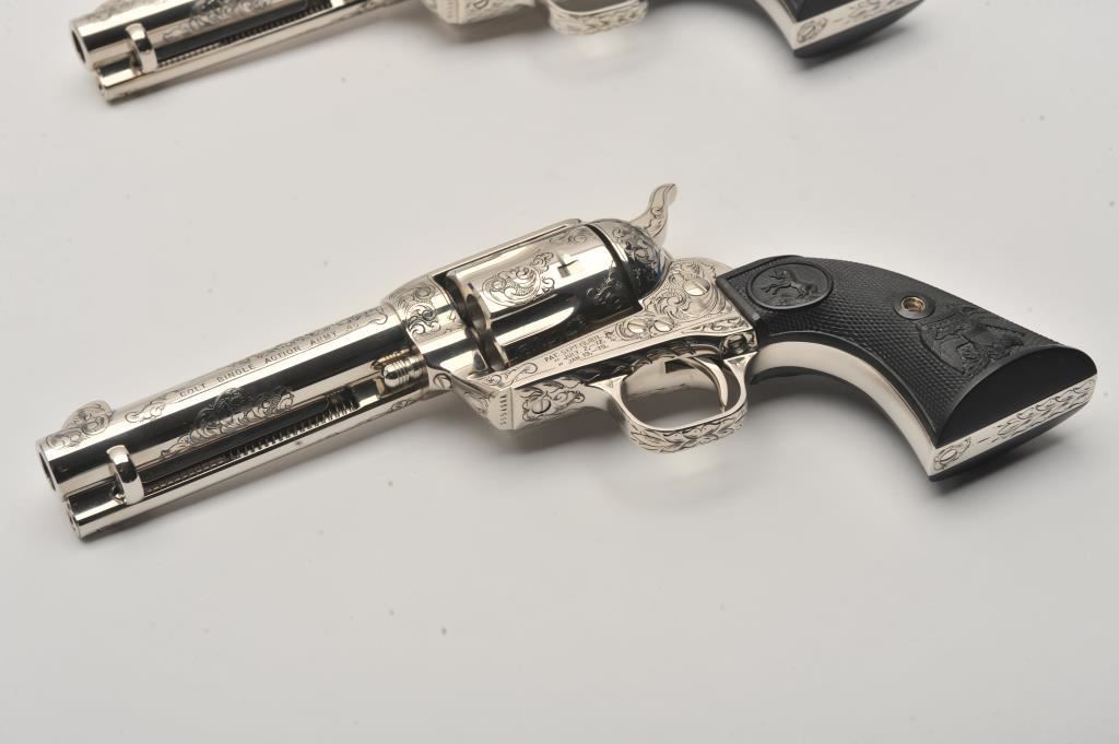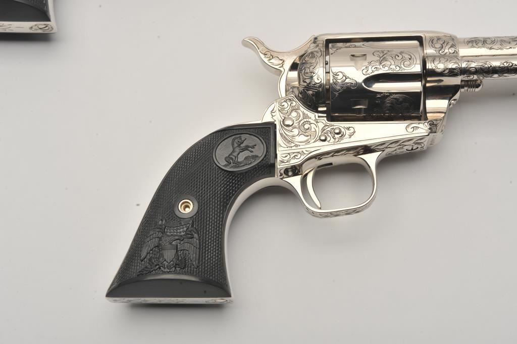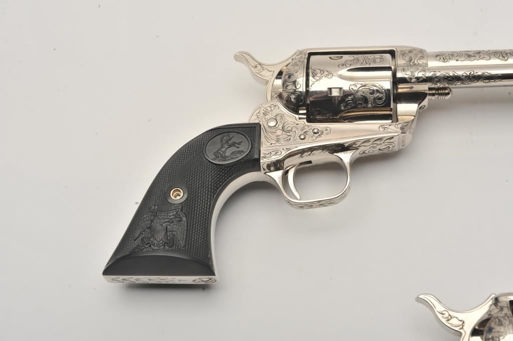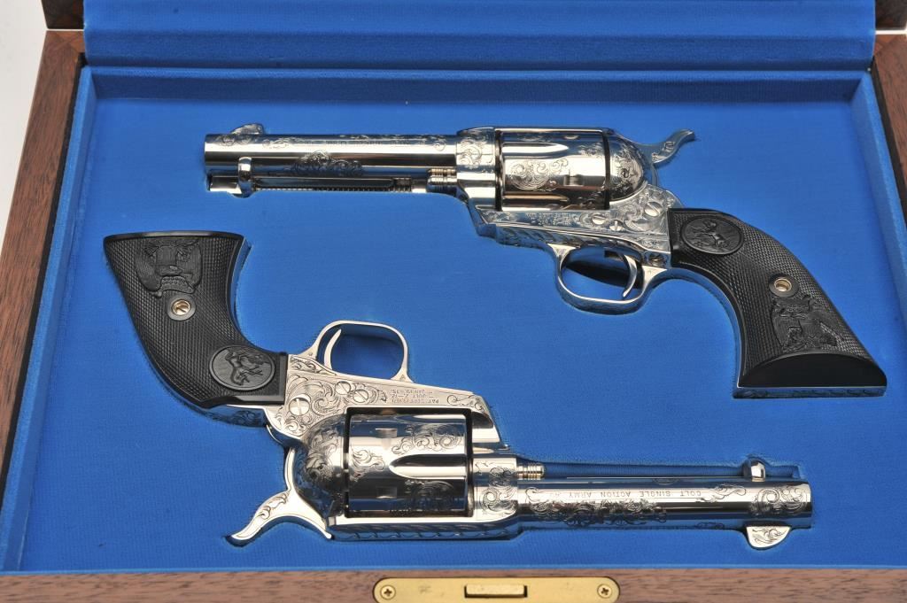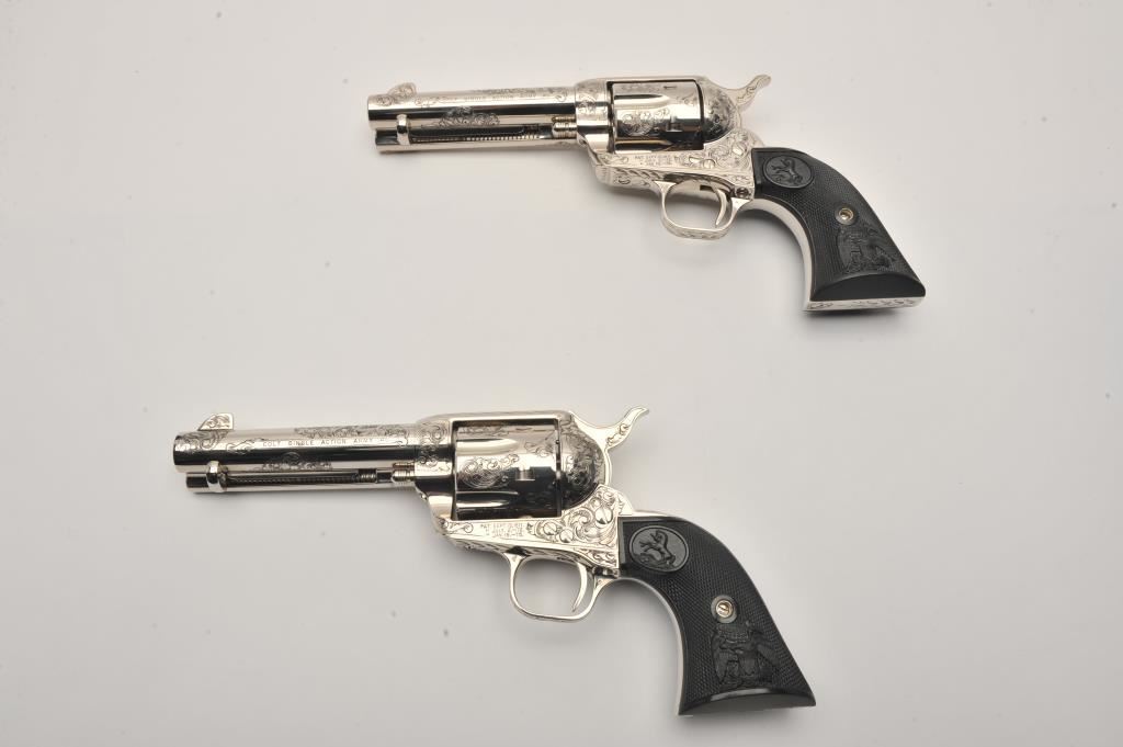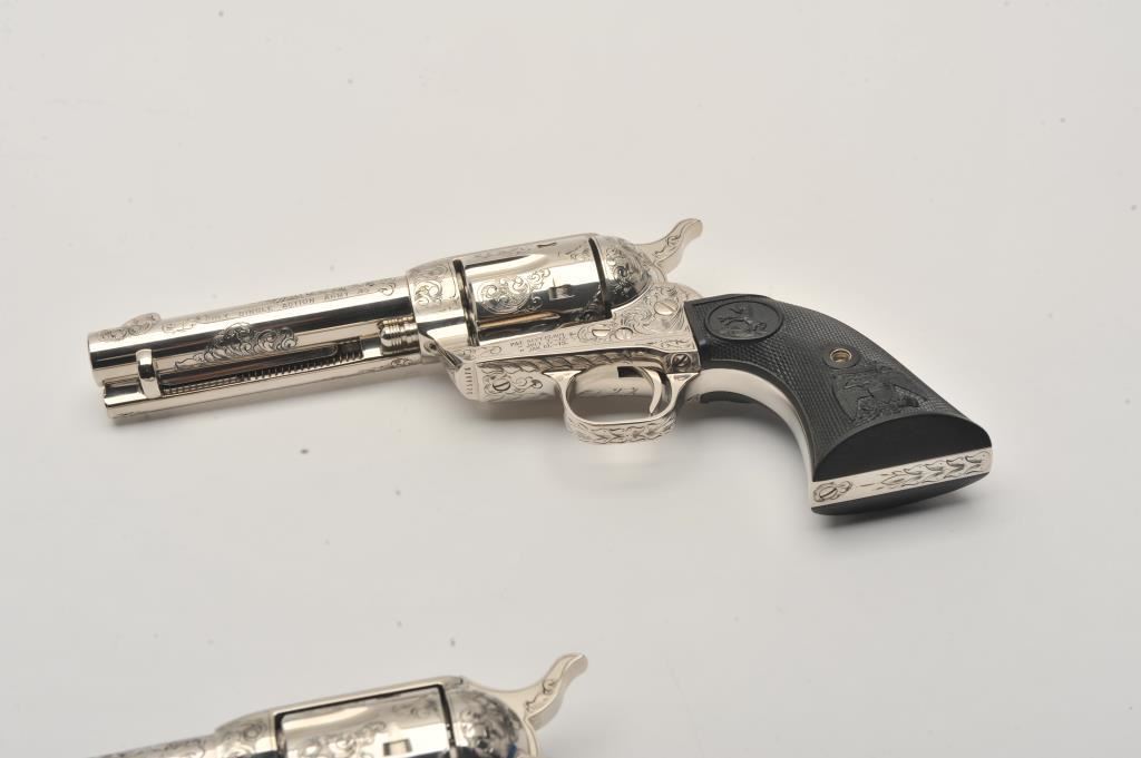 Pair of Colt SAA revolvers, factory āCā engraved, nickel plated, 4 ¾ā barrels, black powder cylinder pin and patent dates, eagle grips, S/N S05406A and S/N S05407A. Excellent to mint in original cardboard boxes with presentation style display case. The black powder frame, patent dates and unusual pattern of engraving makes this set unique. Special ordered by noted Colt aficionado and collector Marvin Essenmacher approximately 30-40 years ago. (Modern/No PPT) Est.: $6,000-$12,000