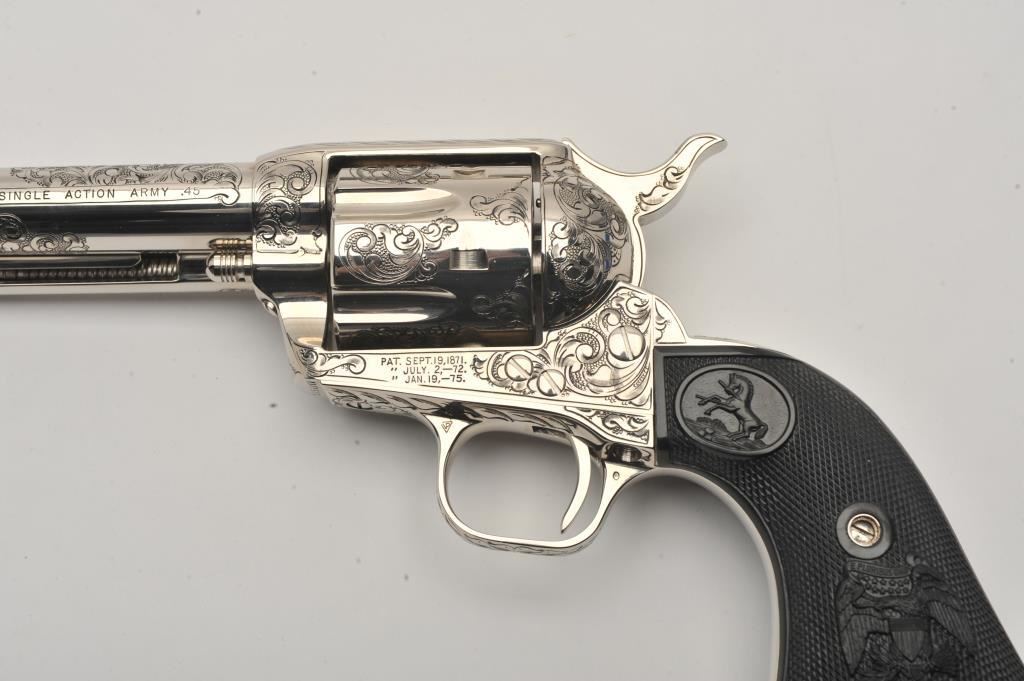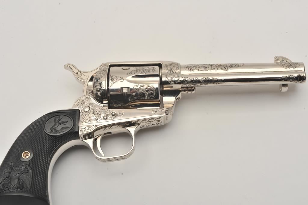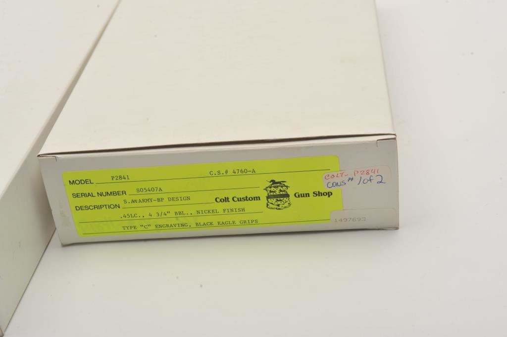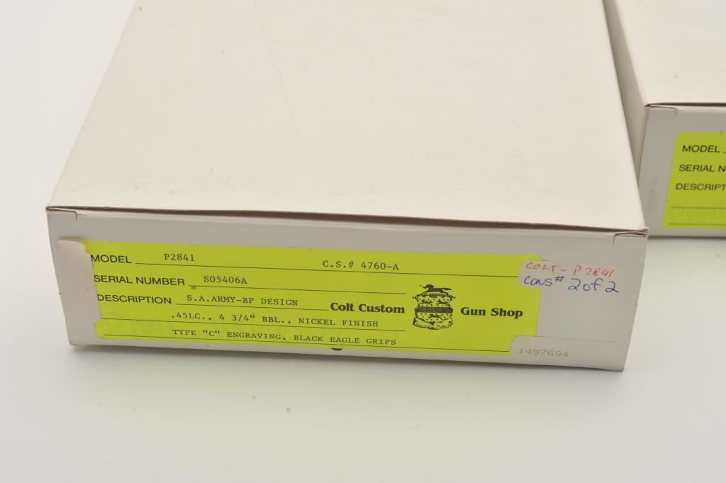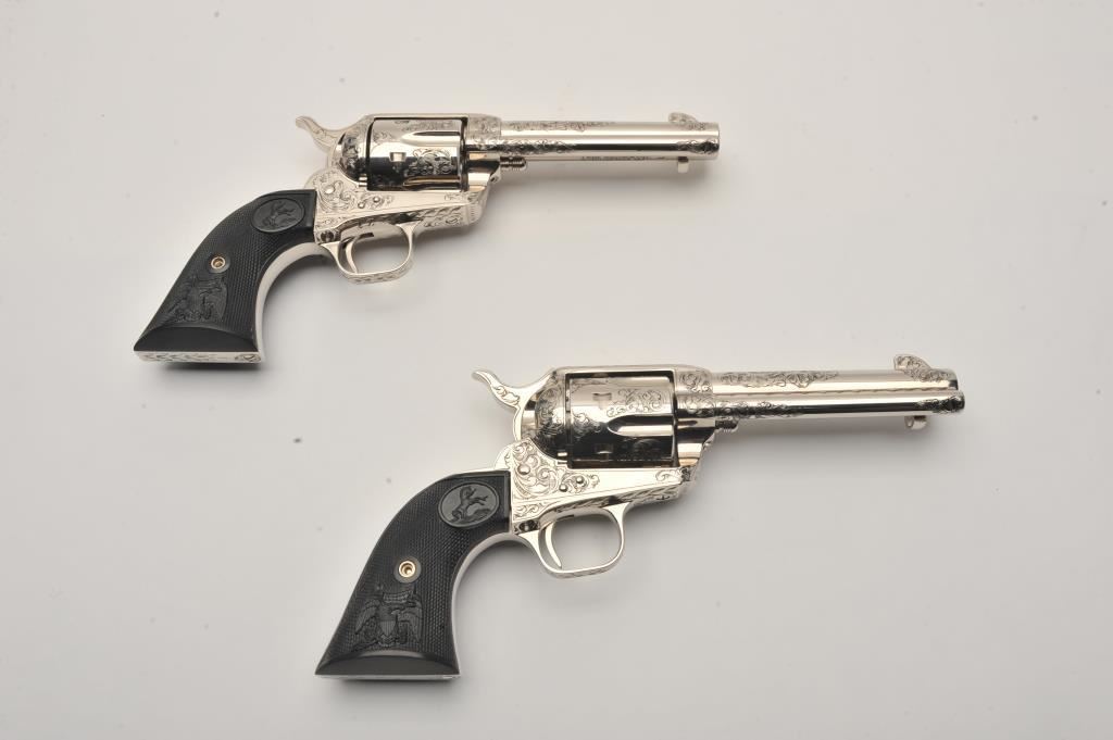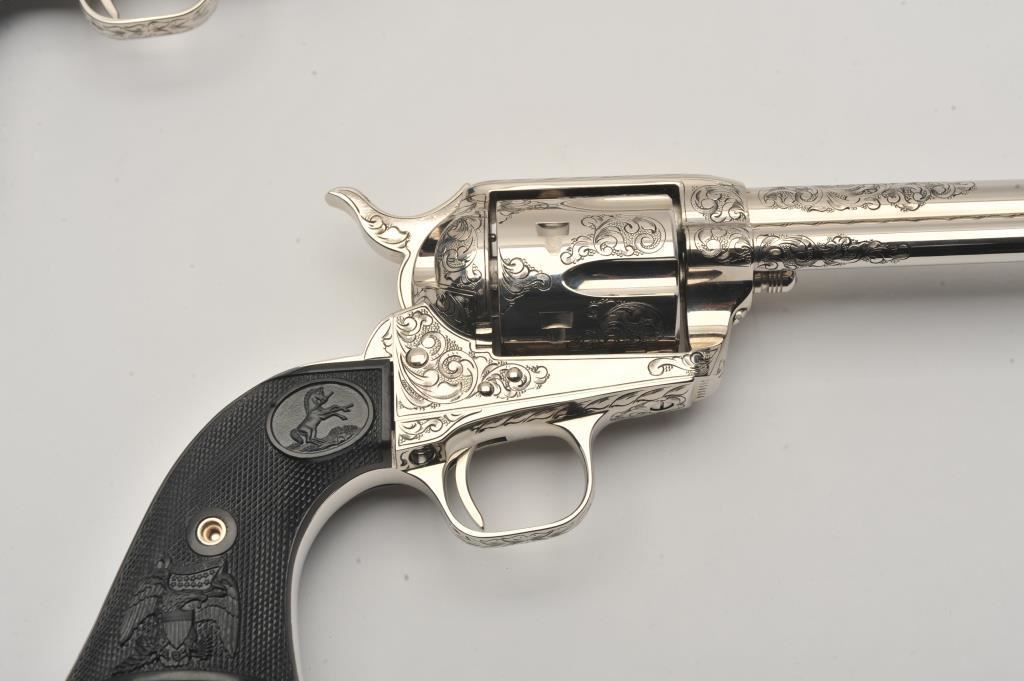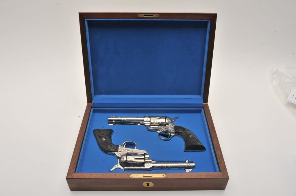 Pair of Colt SAA revolvers, factory āCā engraved, nickel plated, 4 ¾ā barrels, black powder cylinder pin and patent dates, eagle grips, S/N S05406A and S/N S05407A. Excellent to mint in original cardboard boxes with presentation style display case. The black powder frame, patent dates and unusual pattern of engraving makes this set unique. Special ordered by noted Colt aficionado and collector Marvin Essenmacher approximately 30-40 years ago. (Modern/No PPT) Est.: $6,000-$12,000