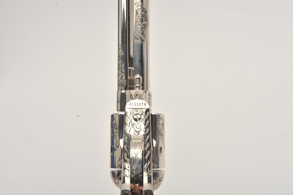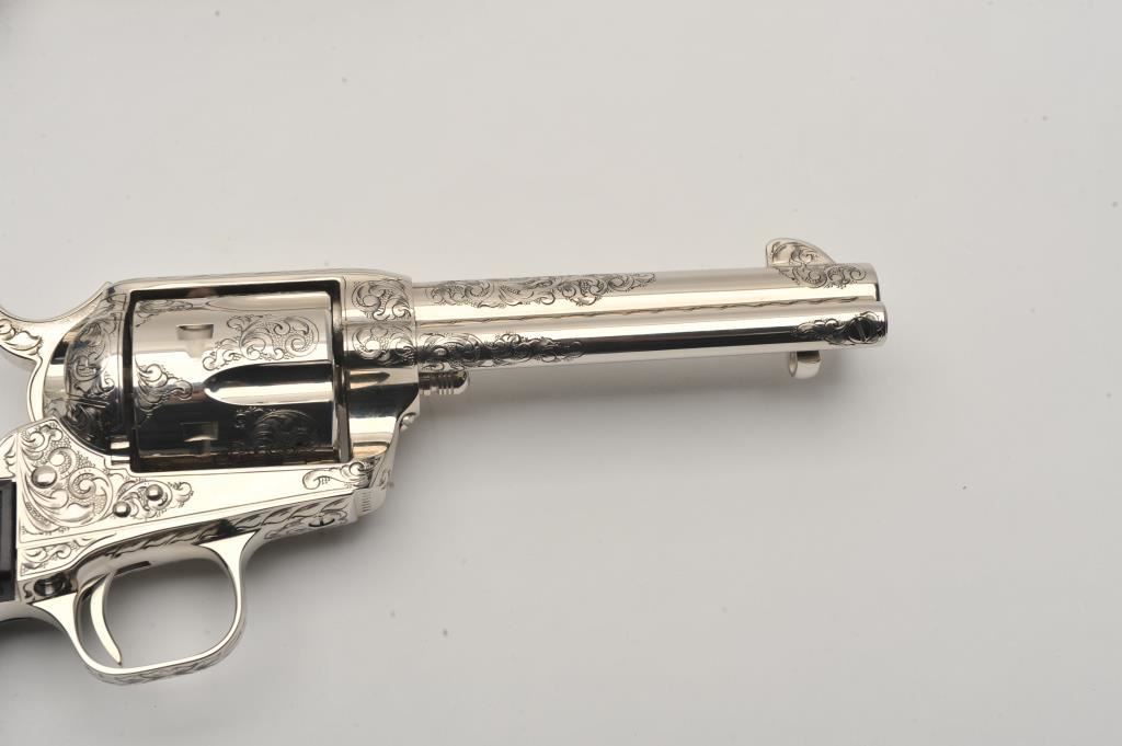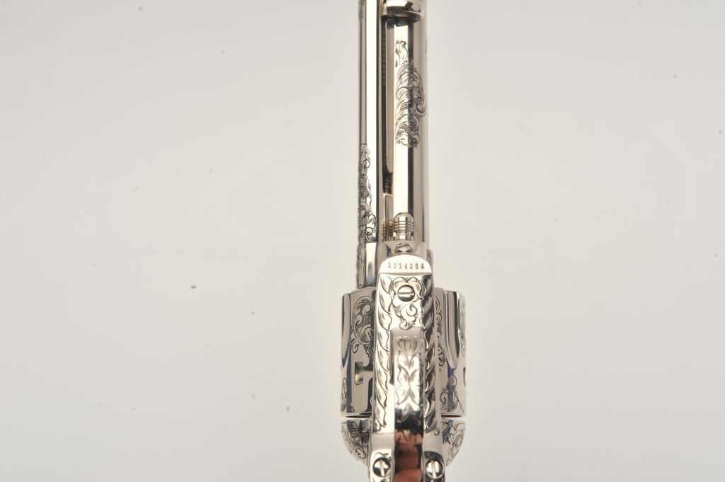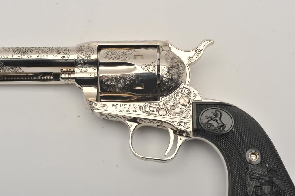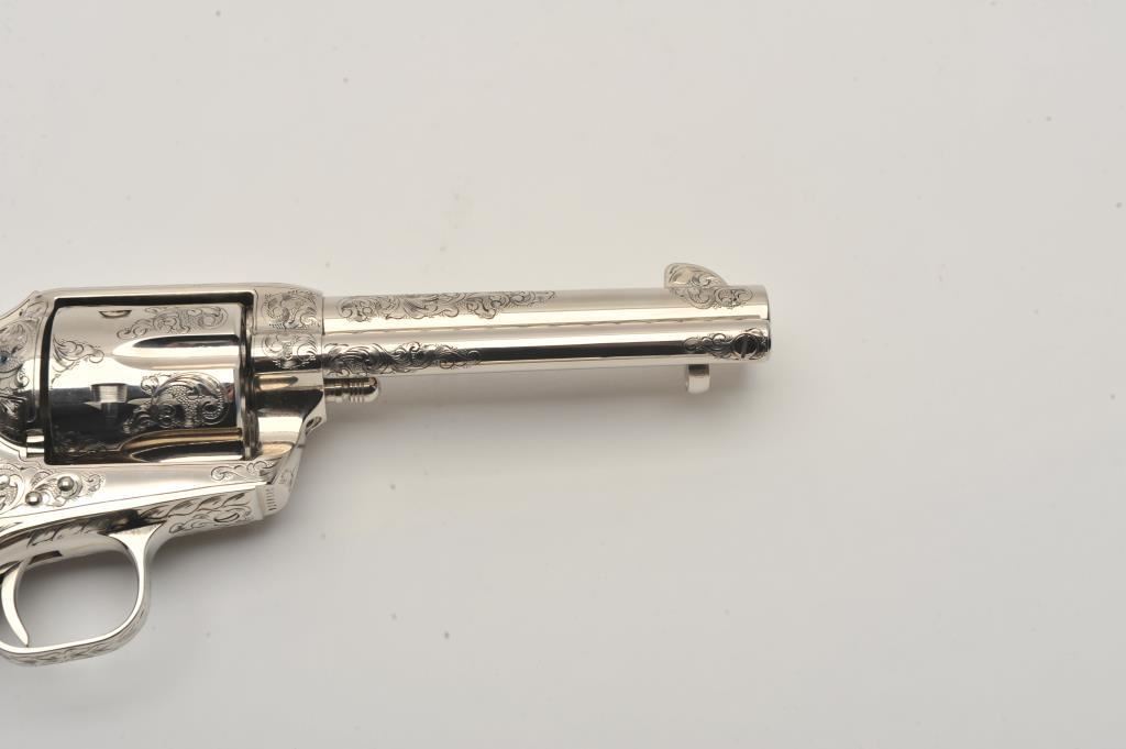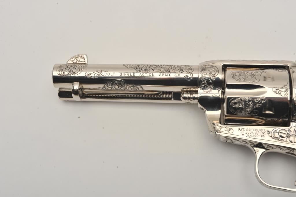 Pair of Colt SAA revolvers, factory āCā engraved, nickel plated, 4 ¾ā barrels, black powder cylinder pin and patent dates, eagle grips, S/N S05406A and S/N S05407A. Excellent to mint in original cardboard boxes with presentation style display case. The black powder frame, patent dates and unusual pattern of engraving makes this set unique. Special ordered by noted Colt aficionado and collector Marvin Essenmacher approximately 30-40 years ago. (Modern/No PPT) Est.: $6,000-$12,000