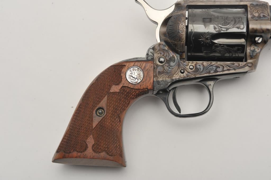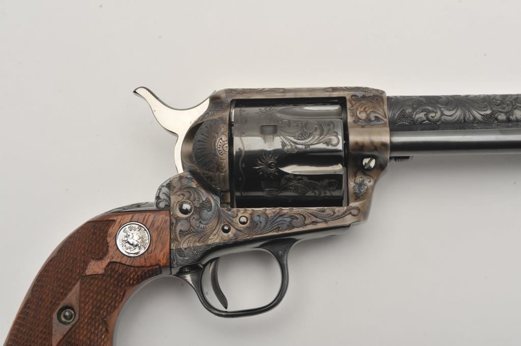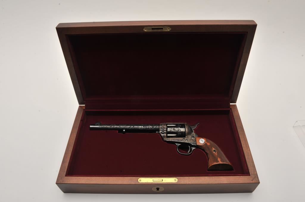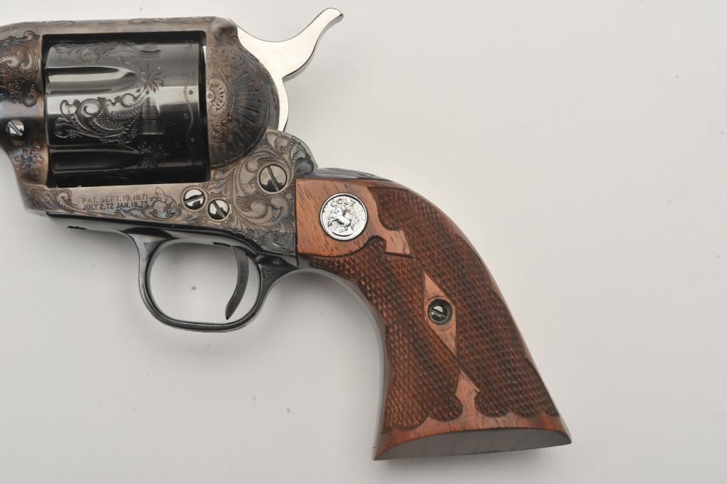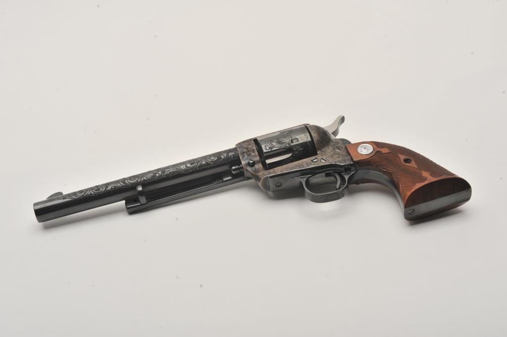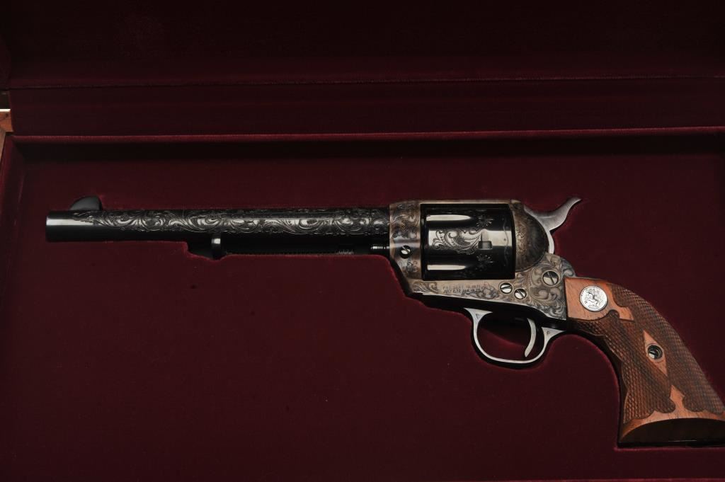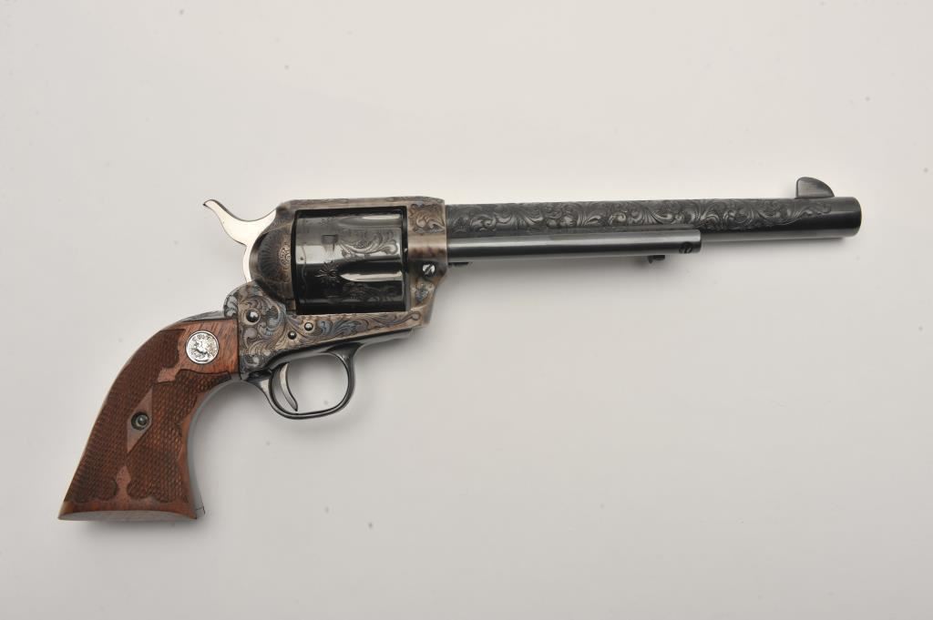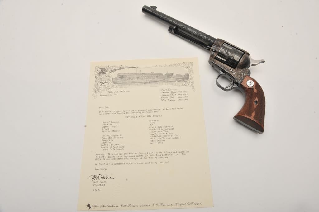 Colt SAA .45 caliber revolver with a 7 ½” barrel, factory “D” engraved, blue case hardened finish, and checkered grips with silver medallions. Engraved by Oscar Flores and supplied with French fitted case. Don Mitchell, Loan Acct., Colt Firearms (Display gun) May 5, 1972, 1 gun in shipment. Factory letter confirms all features under remarks “This arm was engraved in custom scroll by Mr. Flores and submitted to Colt for marketing consideration”. Don Mitchell was Colt marketing manager at this time. Excellent to mint condition with stagecoach box also included. A terrific transition 2nd to 3rd generation used as a factory display gun. Also displayed in Colt display at Buffalo Bill museum. (C&R/No PPT) Est.: $6,000-$12,000