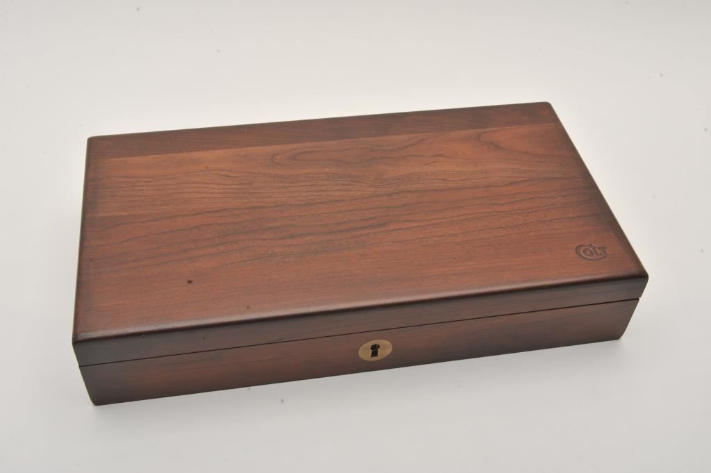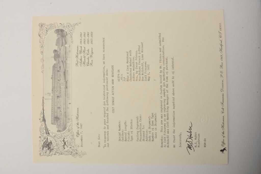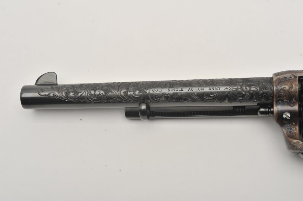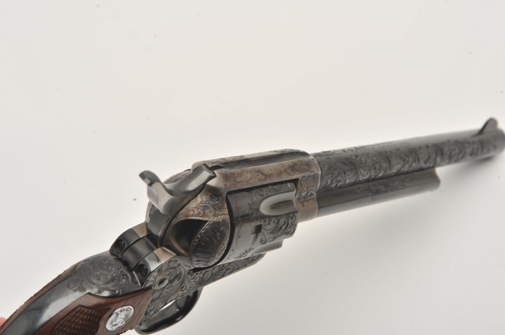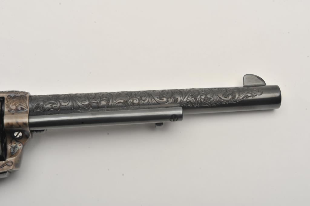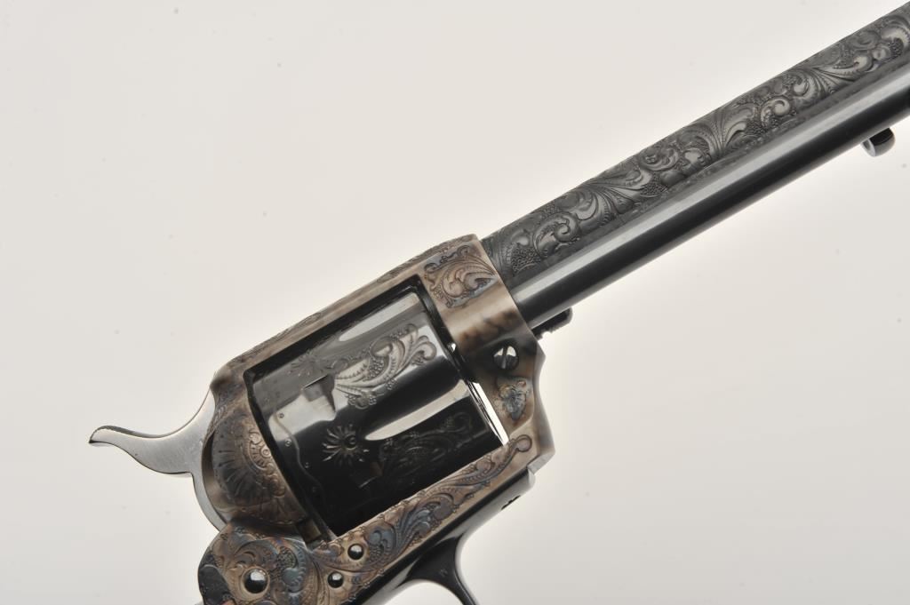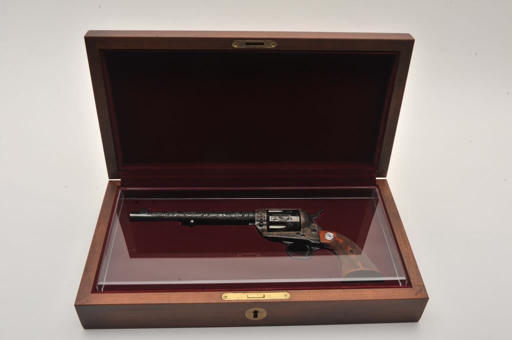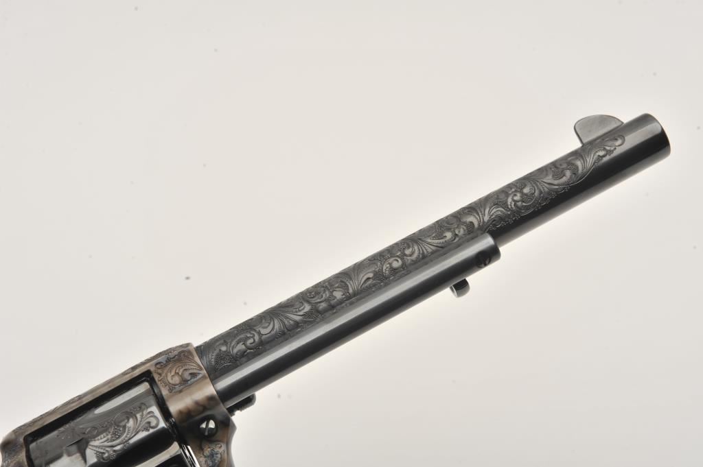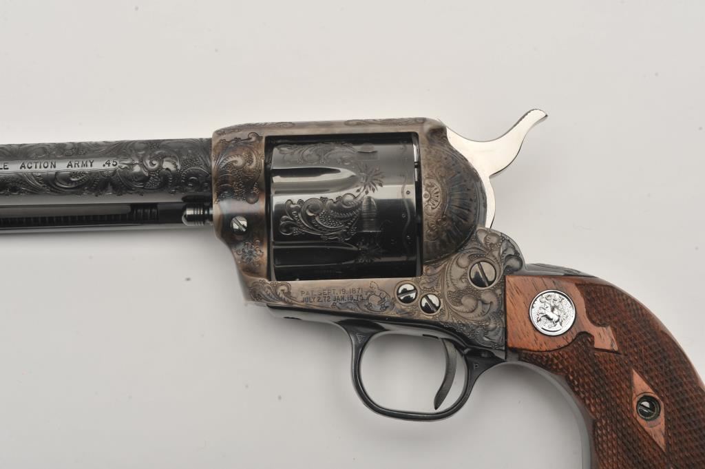 Colt SAA .45 caliber revolver with a 7 ½” barrel, factory “D” engraved, blue case hardened finish, and checkered grips with silver medallions. Engraved by Oscar Flores and supplied with French fitted case. Don Mitchell, Loan Acct., Colt Firearms (Display gun) May 5, 1972, 1 gun in shipment. Factory letter confirms all features under remarks “This arm was engraved in custom scroll by Mr. Flores and submitted to Colt for marketing consideration”. Don Mitchell was Colt marketing manager at this time. Excellent to mint condition with stagecoach box also included. A terrific transition 2nd to 3rd generation used as a factory display gun. Also displayed in Colt display at Buffalo Bill museum. (C&R/No PPT) Est.: $6,000-$12,000