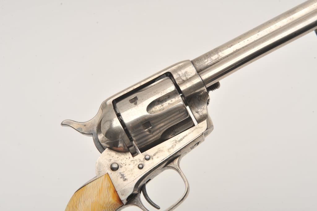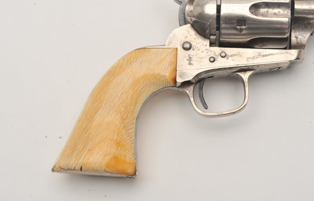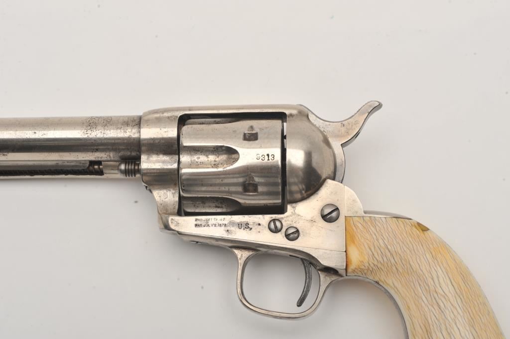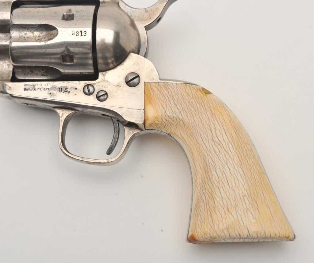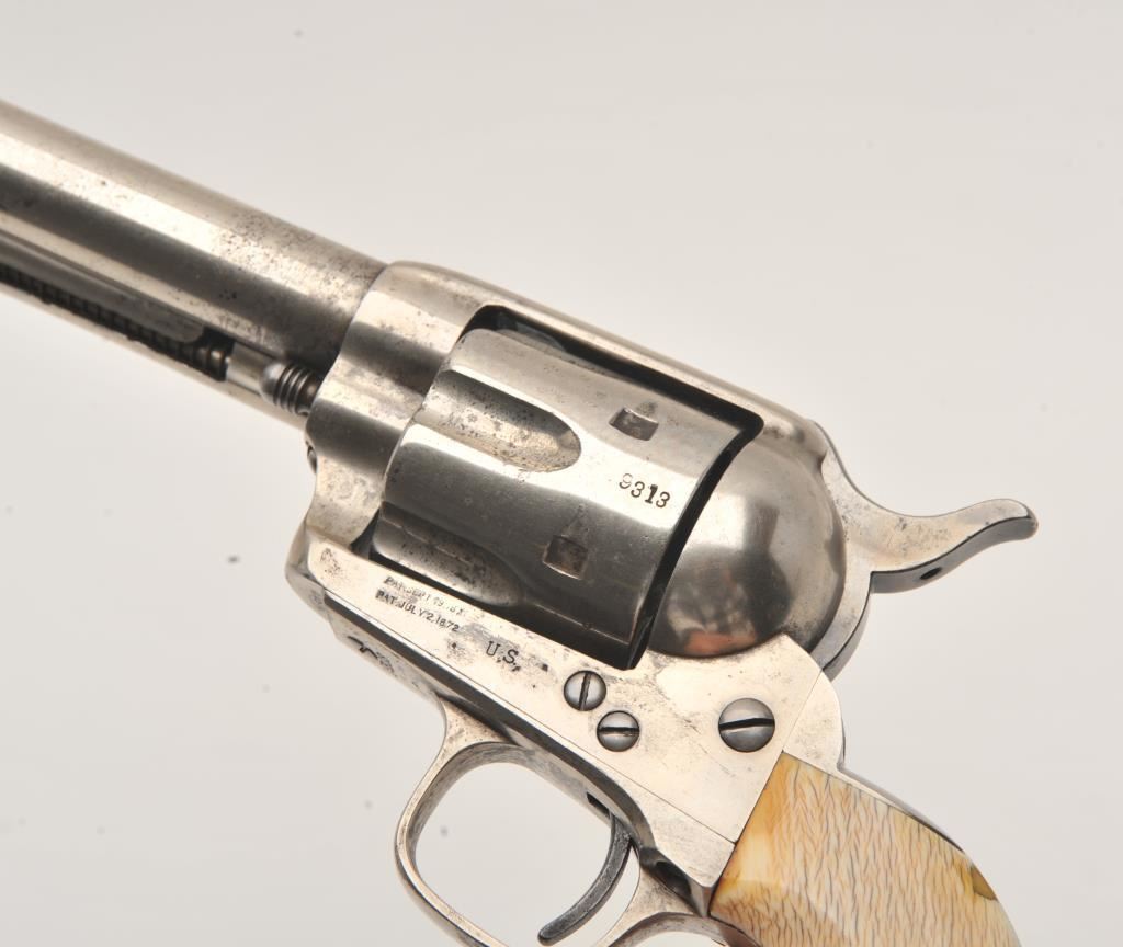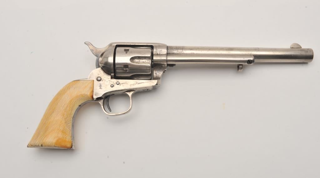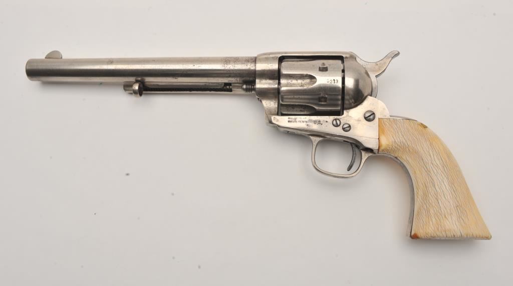 Colt SAA revolver, .45 caliber, 7.5” barrel, nickel finish, ivory grips, “c” inspection markings and a re-stamped “U.S.” on the left side of the lower frame, S/N 19313, with factory letter confirming caliber, barrel length “not listed”, blue finish, type of stocks “not listed”, shipped to B. Kittredge Co., Cincinnati, OH for Shuyler, Hartley and Graham on June 24, 1876, 50 guns in shipment. Under “Remarks”: letter further states “As noted above, this firearm was shipped as a commercial model. We have no records available to check to see if this was originally a government condemned gun”. Also included are copies of pages from John Kopec’s book “Cavalry and Artillery Revolvers” (pages 161-163) which include an analysis of Serial #19313, where in summary, Kopec opines this gun was a “Buy-back” surplus Militia revolver that were then “nickel plated in brand-new condition, fitted with ivory stocks, and resold following the year of manufacture to B. Kittredge Co. of Cincinnati, Ohio”. He further notes the “c” inspections are for ordinance sub-inspector