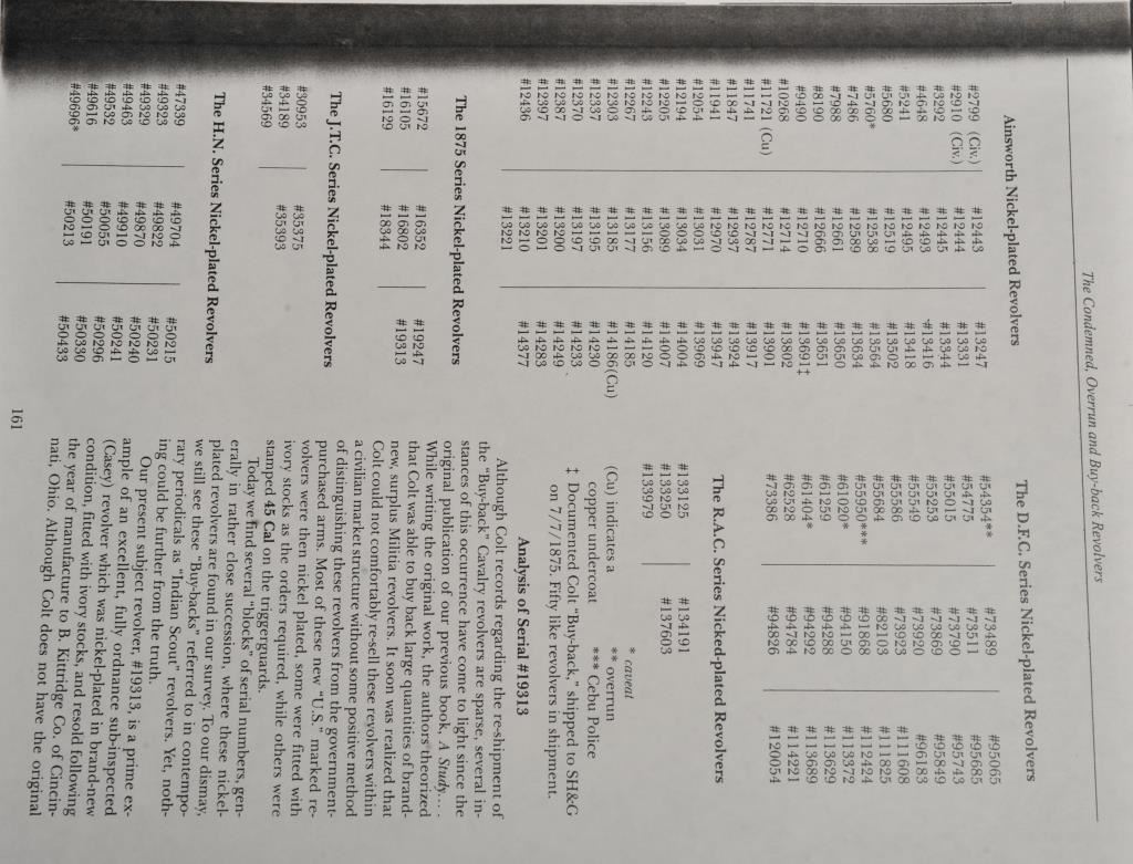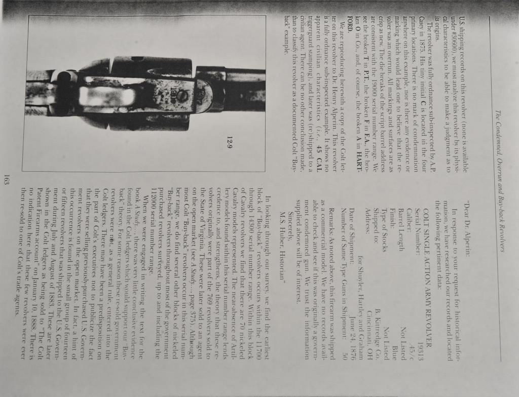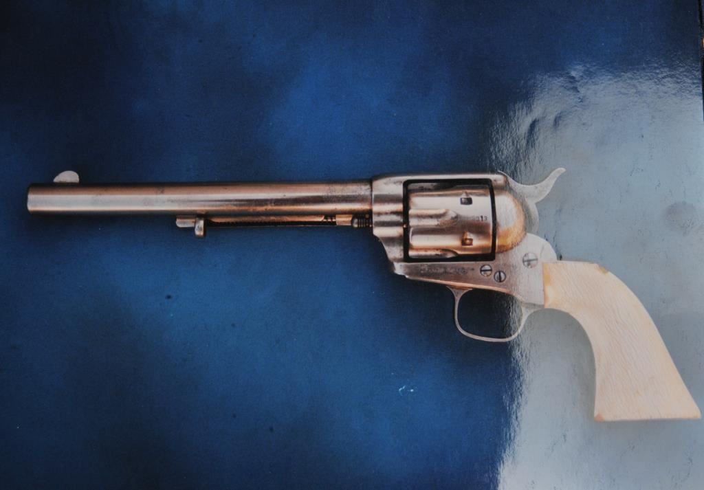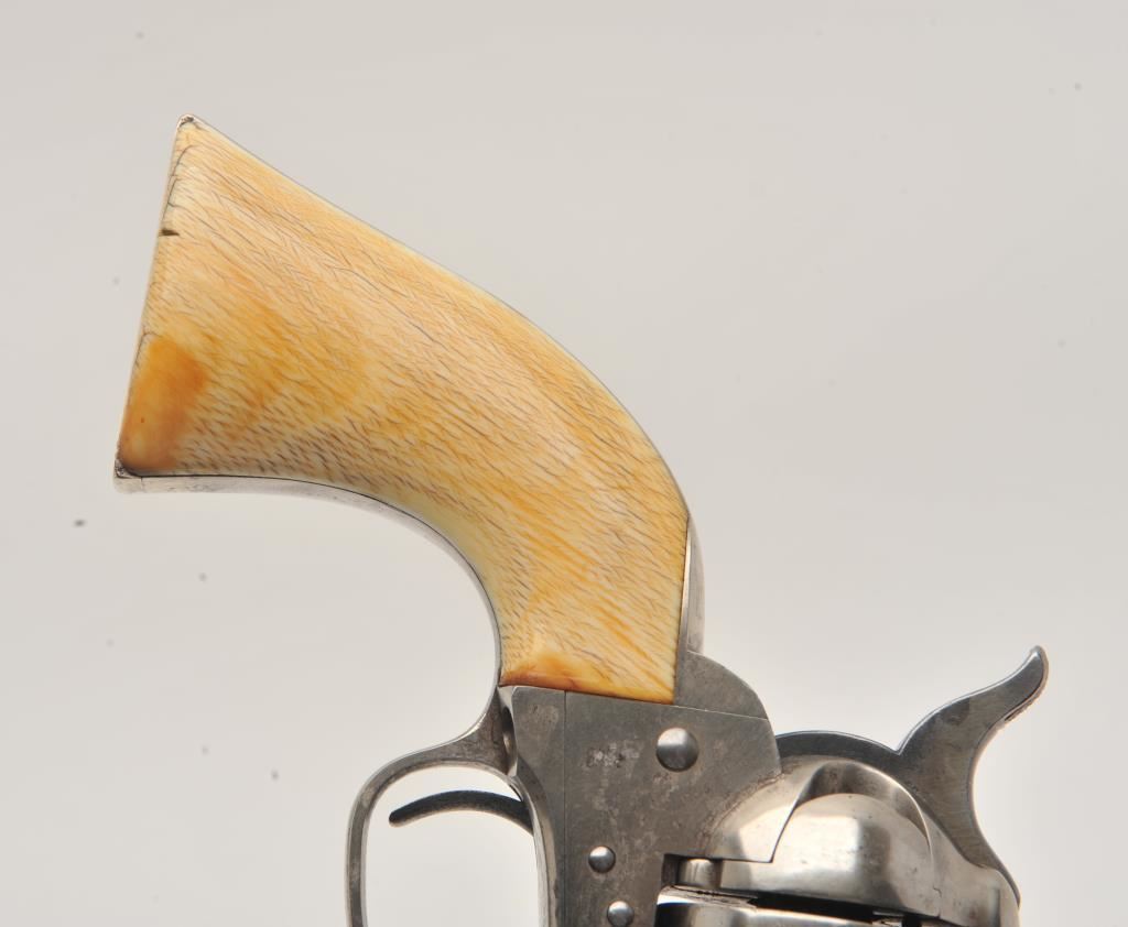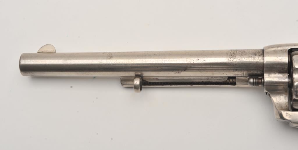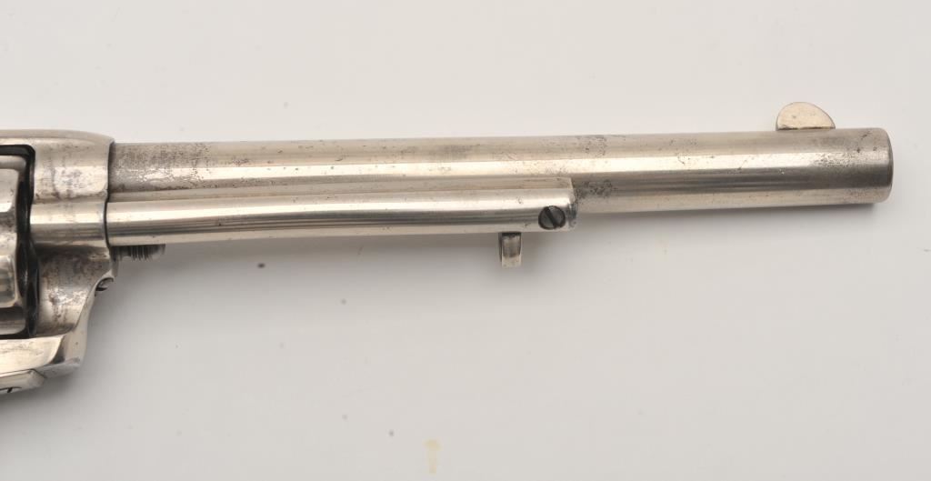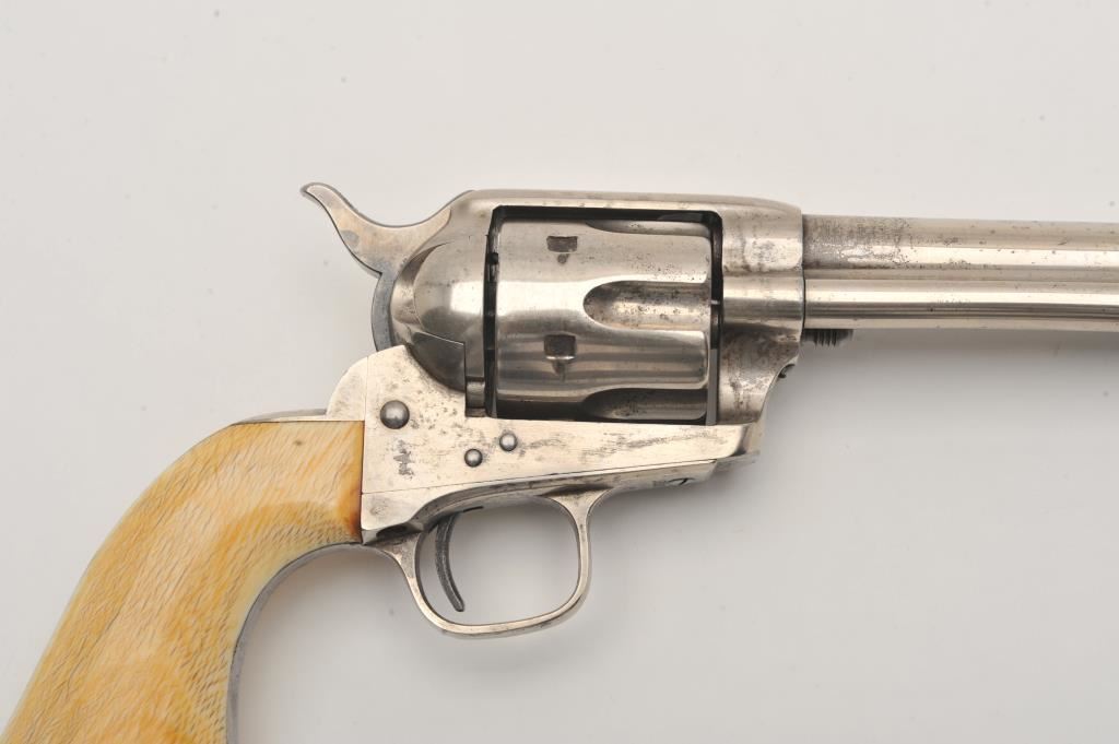 Colt SAA revolver, .45 caliber, 7.5” barrel, nickel finish, ivory grips, “c” inspection markings and a re-stamped “U.S.” on the left side of the lower frame, S/N 19313, with factory letter confirming caliber, barrel length “not listed”, blue finish, type of stocks “not listed”, shipped to B. Kittredge Co., Cincinnati, OH for Shuyler, Hartley and Graham on June 24, 1876, 50 guns in shipment. Under “Remarks”: letter further states “As noted above, this firearm was shipped as a commercial model. We have no records available to check to see if this was originally a government condemned gun”. Also included are copies of pages from John Kopec’s book “Cavalry and Artillery Revolvers” (pages 161-163) which include an analysis of Serial #19313, where in summary, Kopec opines this gun was a “Buy-back” surplus Militia revolver that were then “nickel plated in brand-new condition, fitted with ivory stocks, and resold following the year of manufacture to B. Kittredge Co. of Cincinnati, Ohio”. He further notes the “c” inspections are for ordinance sub-inspector