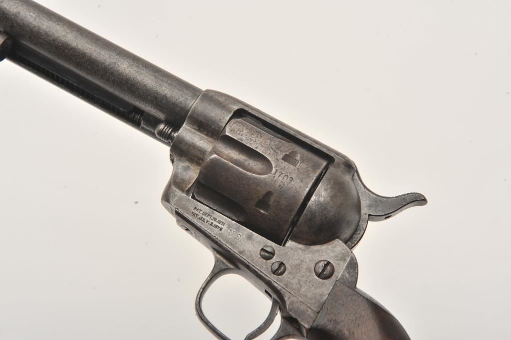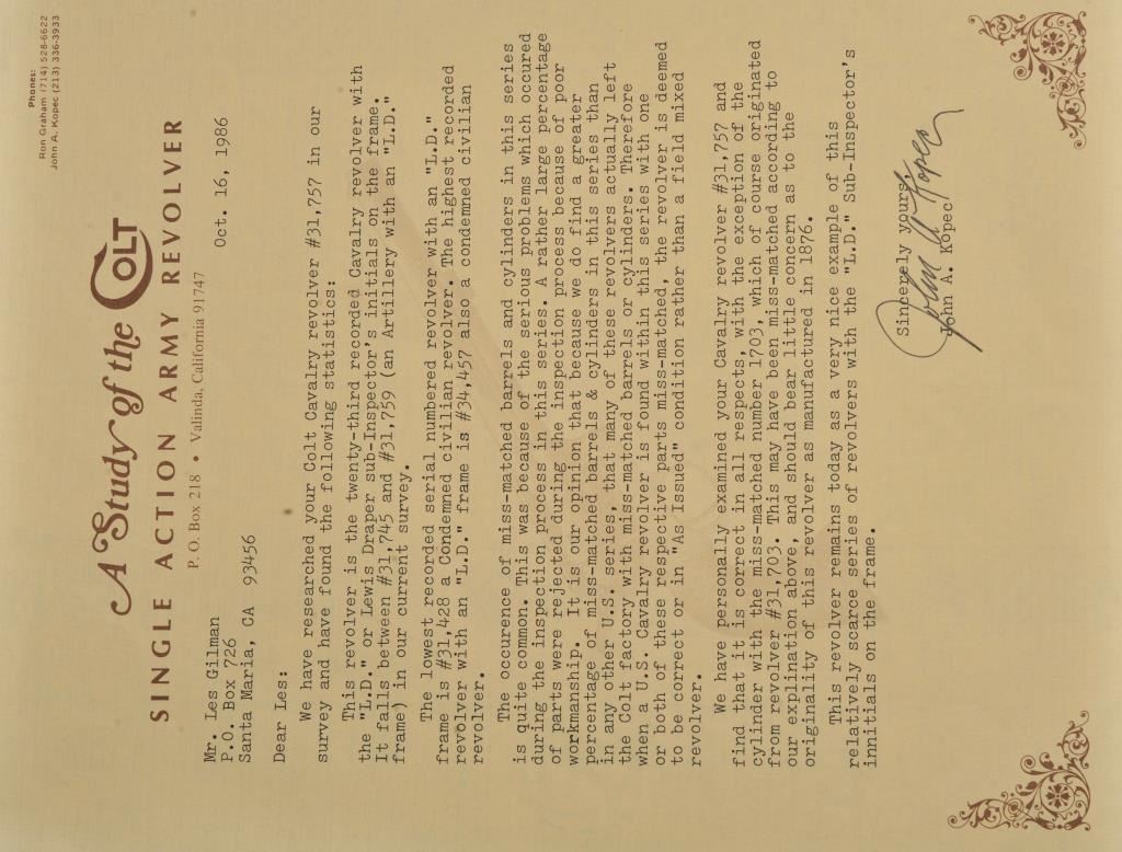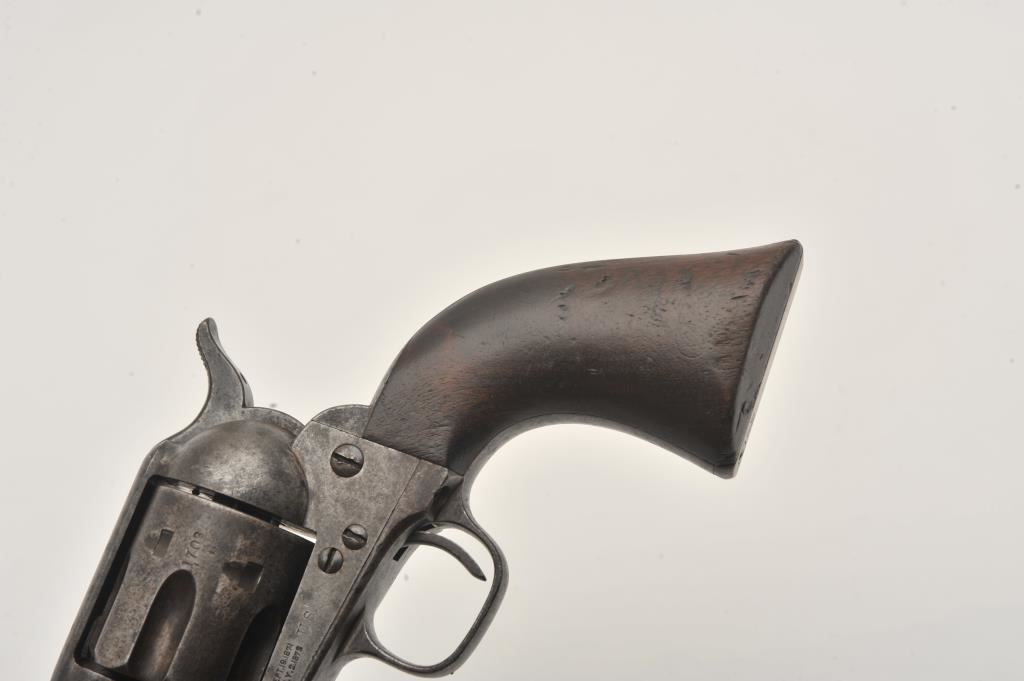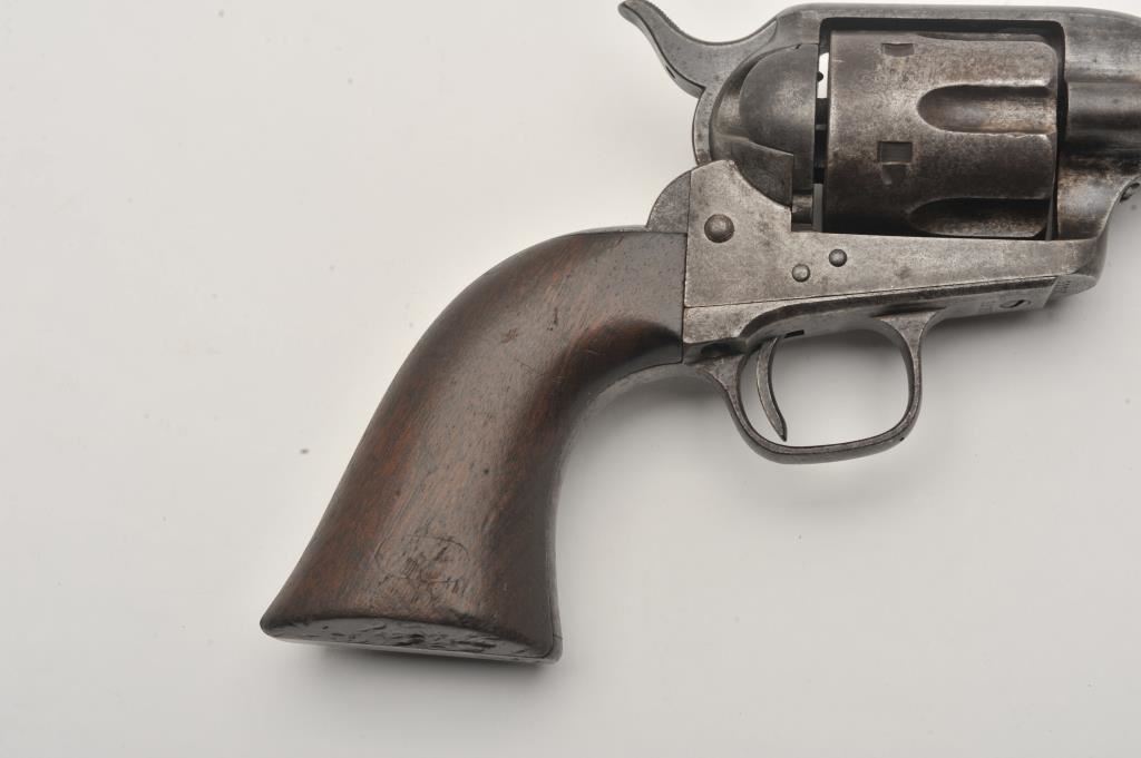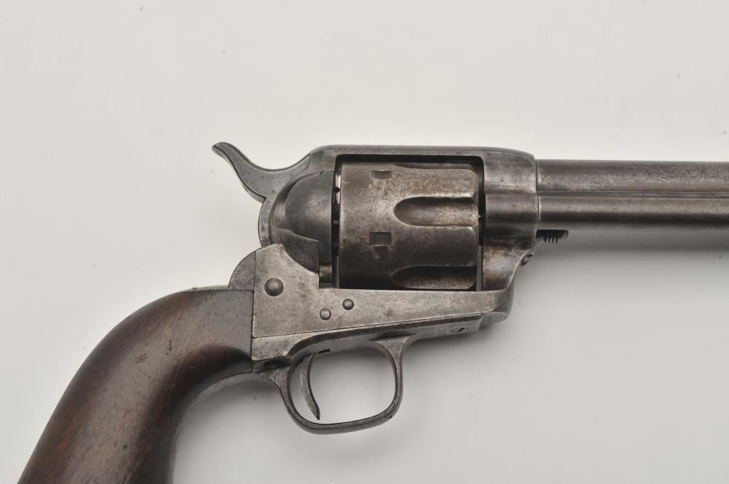 Colt U.S. Cavalry SAA revolver, .45 caliber, 7.5” barrel, dark patina to metal surfaces with scattered pinprick pitting, wood grips displaying partially visible inspector cartouches and the date “1876” on the left side of grips; S/N 31757 (cylinder #1709); overall good condition with a good bore, crisp action, good markings and good grips; accompanied by a Colt factory letter indicating delivery to the U.S. Government Inspector at the Colt plant on December 8, 1876, 200 guns in shipment. Also included with this lot is an early Kopec letter dated Oct. 16, 1986; Kopec cites the “L.D.” (Lewis Draper) sub-inspector mark on the revolver’s frame and further notes “The occurrence of miss-matched barrels and cylinders in this series is quite common. This was because of the serious problems which occurred during the inspection process in this series. A rather large percentage of parts were rejected during the inspection process because of poor workmanship. It is our opinion that because we do find a greater percentage of miss-matched barrels &