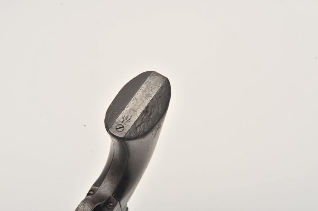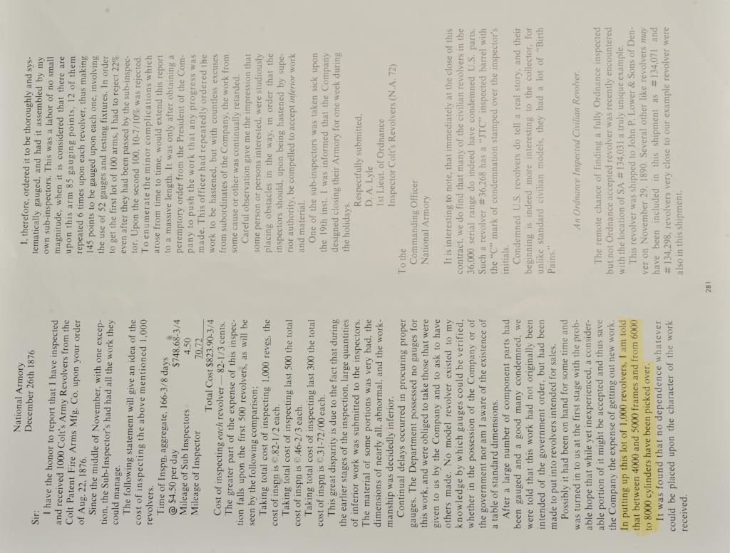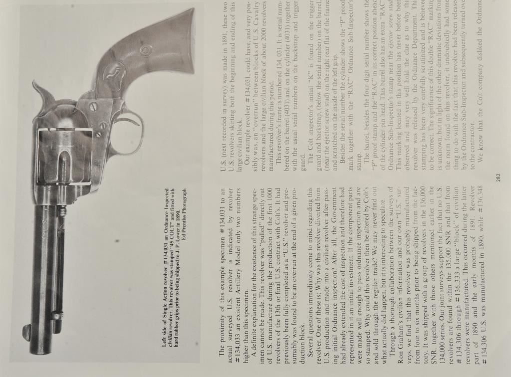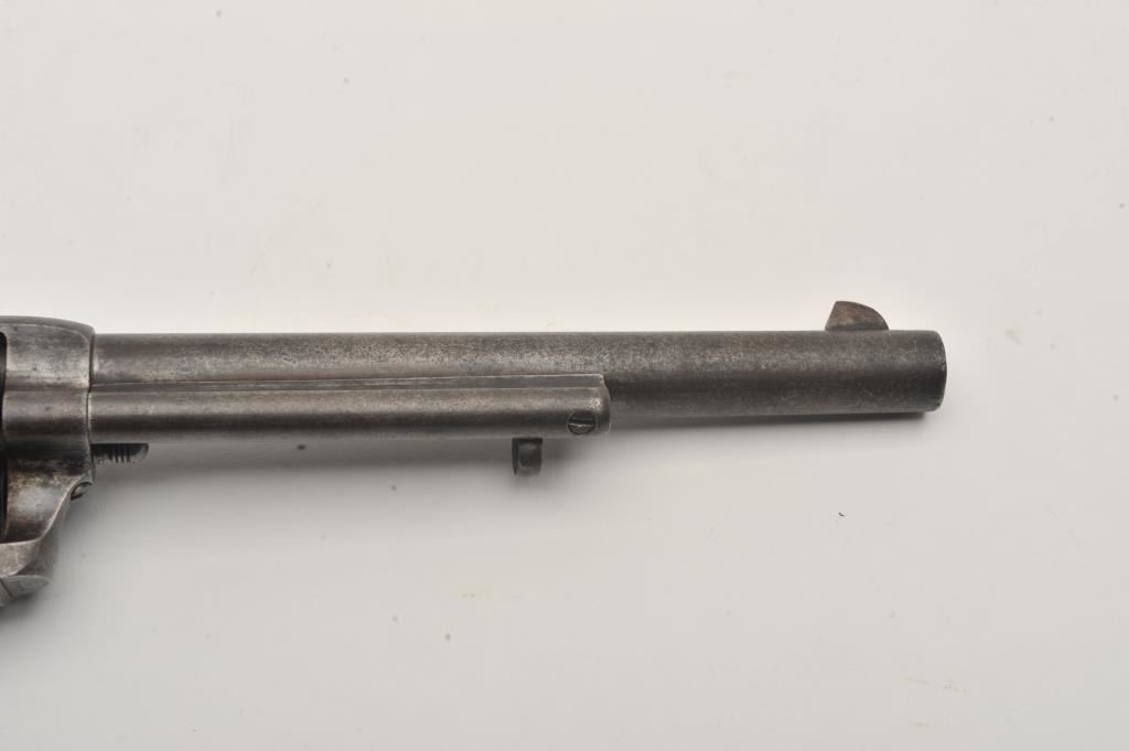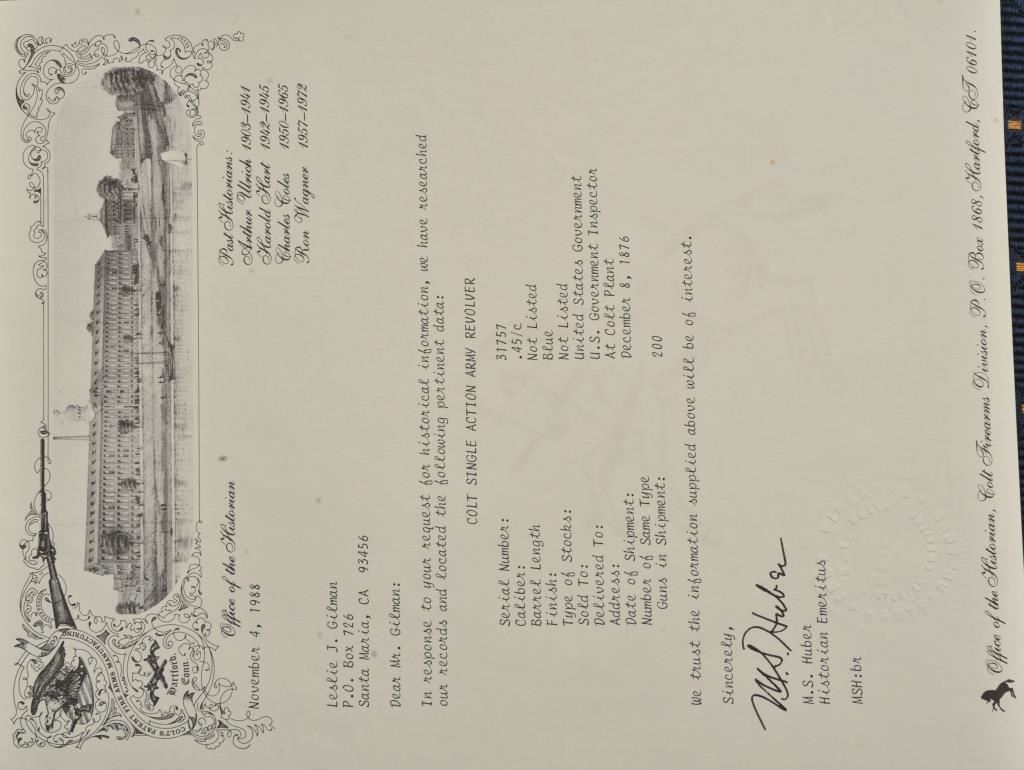 Colt U.S. Cavalry SAA revolver, .45 caliber, 7.5” barrel, dark patina to metal surfaces with scattered pinprick pitting, wood grips displaying partially visible inspector cartouches and the date “1876” on the left side of grips; S/N 31757 (cylinder #1709); overall good condition with a good bore, crisp action, good markings and good grips; accompanied by a Colt factory letter indicating delivery to the U.S. Government Inspector at the Colt plant on December 8, 1876, 200 guns in shipment. Also included with this lot is an early Kopec letter dated Oct. 16, 1986; Kopec cites the “L.D.” (Lewis Draper) sub-inspector mark on the revolver’s frame and further notes “The occurrence of miss-matched barrels and cylinders in this series is quite common. This was because of the serious problems which occurred during the inspection process in this series. A rather large percentage of parts were rejected during the inspection process because of poor workmanship. It is our opinion that because we do find a greater percentage of miss-matched barrels &