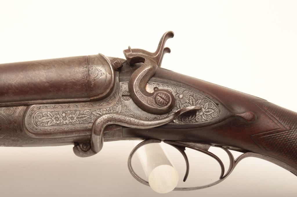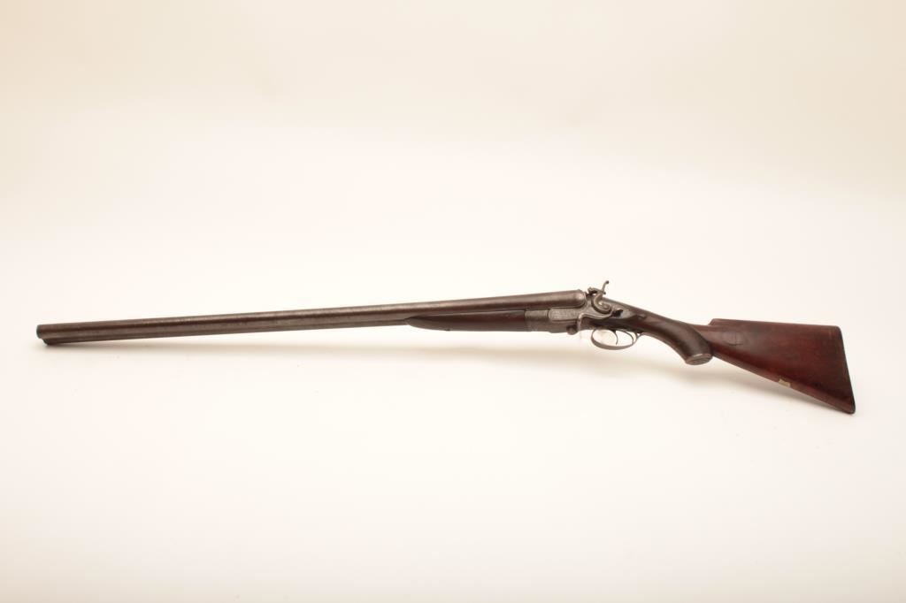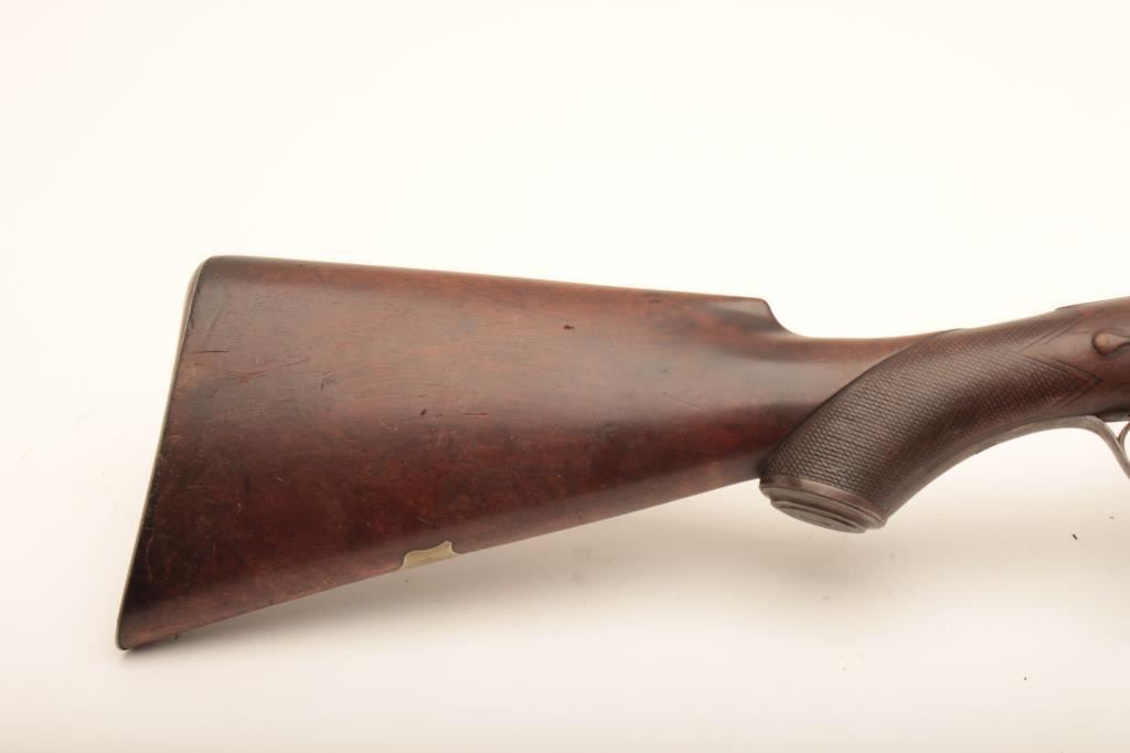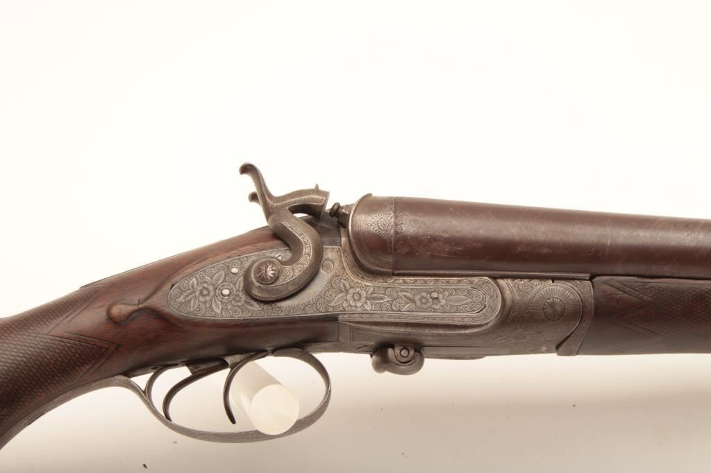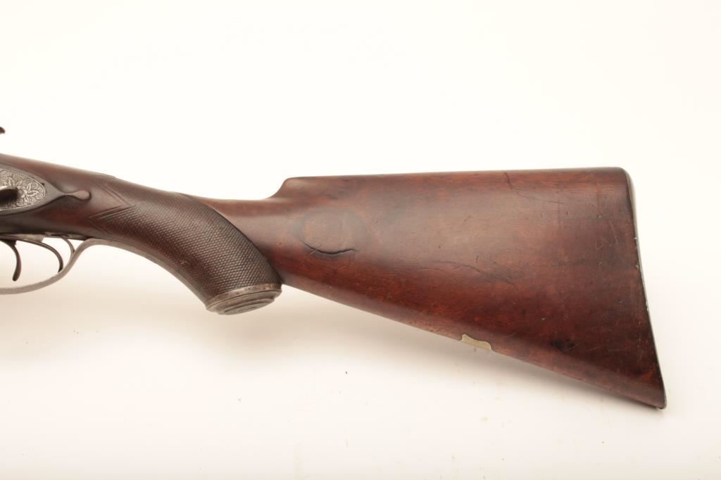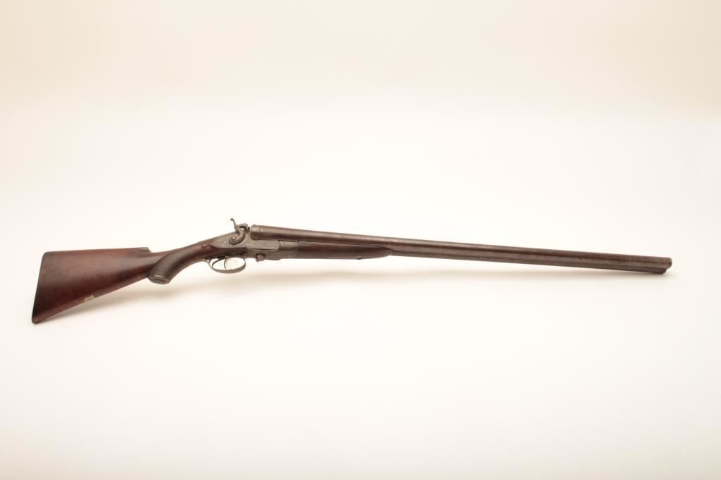 10 GA English side release double barrel shotgun of good quality marked “A.B.” beneath fore end on the barrels with Parker style finger release on fore end marked “Patent”. Measures 48” overall with 32” barrels. Nicely floral engraved. The checkering is worn on the fore end but the stock is good overall. Considerable original finish with nicely patterned barrels full of dirt and grime from an estate and in need of cleaning. The action works well and locks tight. Could be researched as to patent and “A.B.”. A sleeper!! Est.: $750-$1500