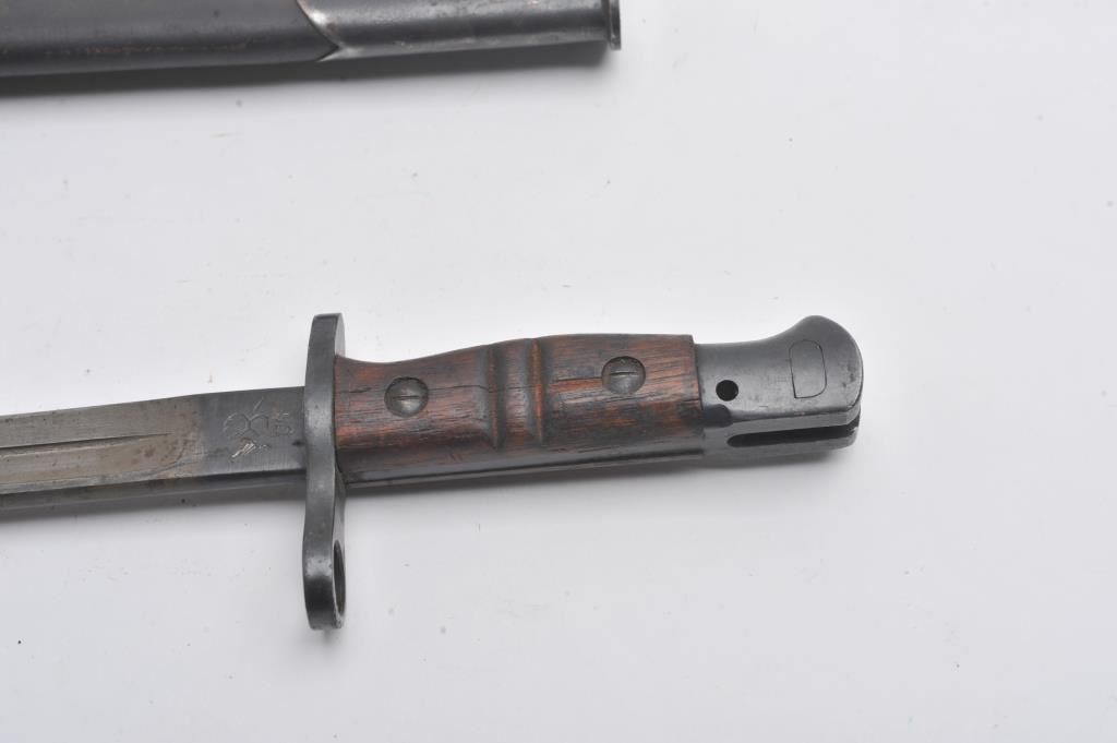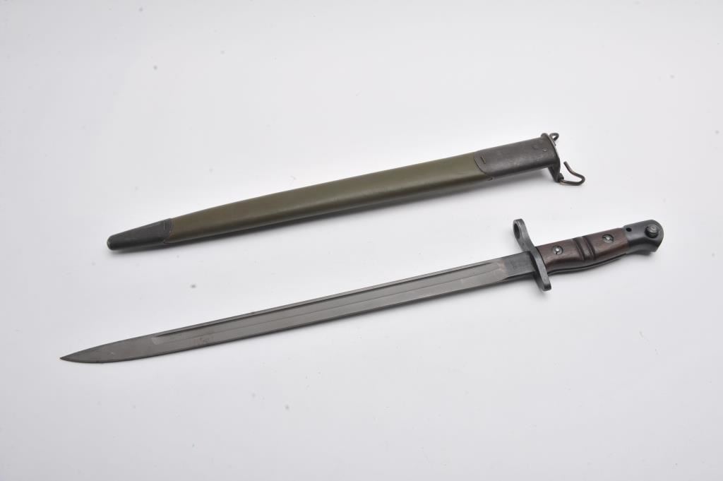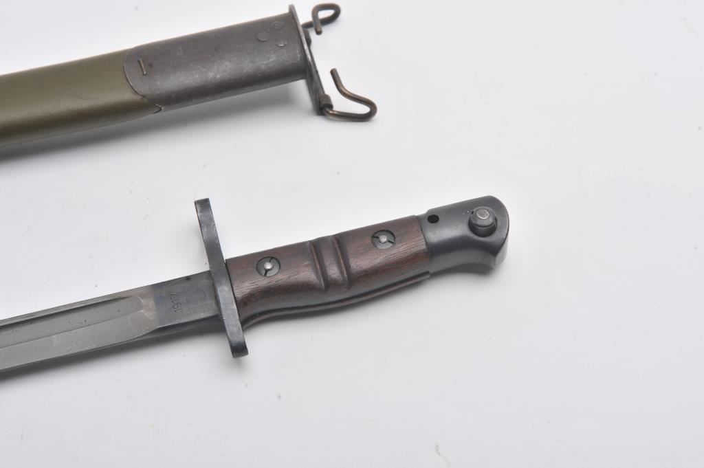 Lot of 2 Remington 1917 bayonets, dated 1917, marked Remington, one in fine condition and one very good, with scabbards. Est. $150-300