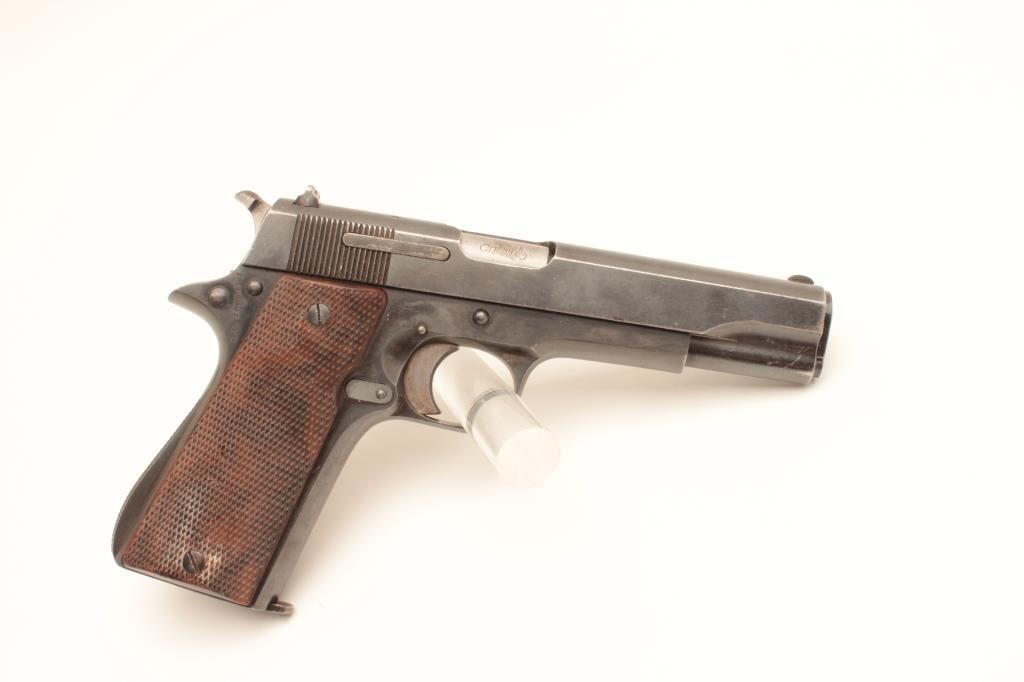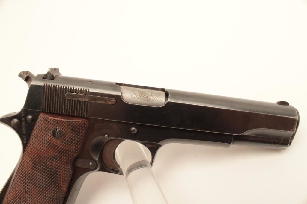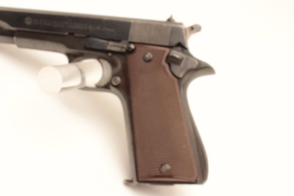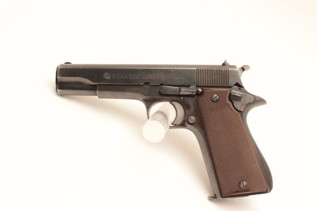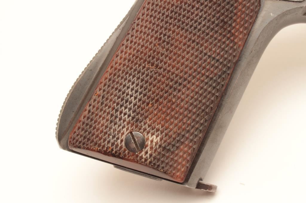 Star Model B semi-automatic pistol, 9mm caliber, 5” barrel, blued finish, checkered brown hard rubber grips, import-marked, S/N 272756; overall good to very good condition with crisp action, good bore, good markings and very good grips. (C&R/PPT). Est.: $250-$500.
