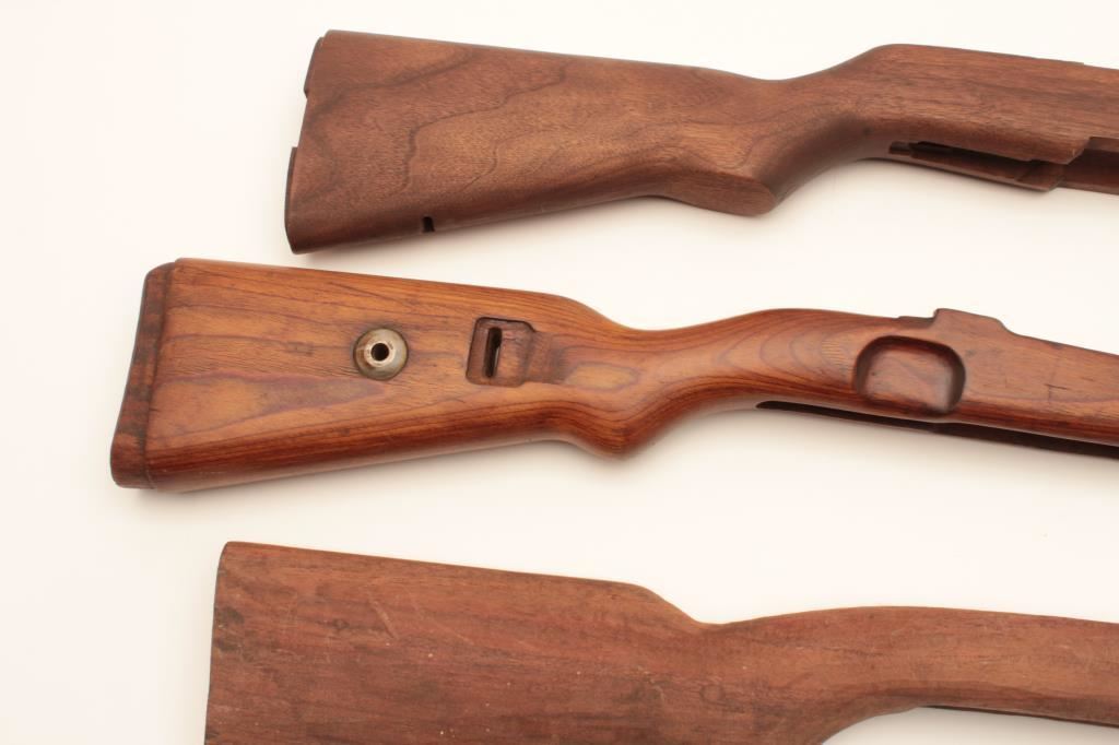 Stock lot consisting of military style stocks, M1 Garand replacement stock in very good condition, a Mauser stock in very good condition, an unknown unfinished stock. Est. $100-200